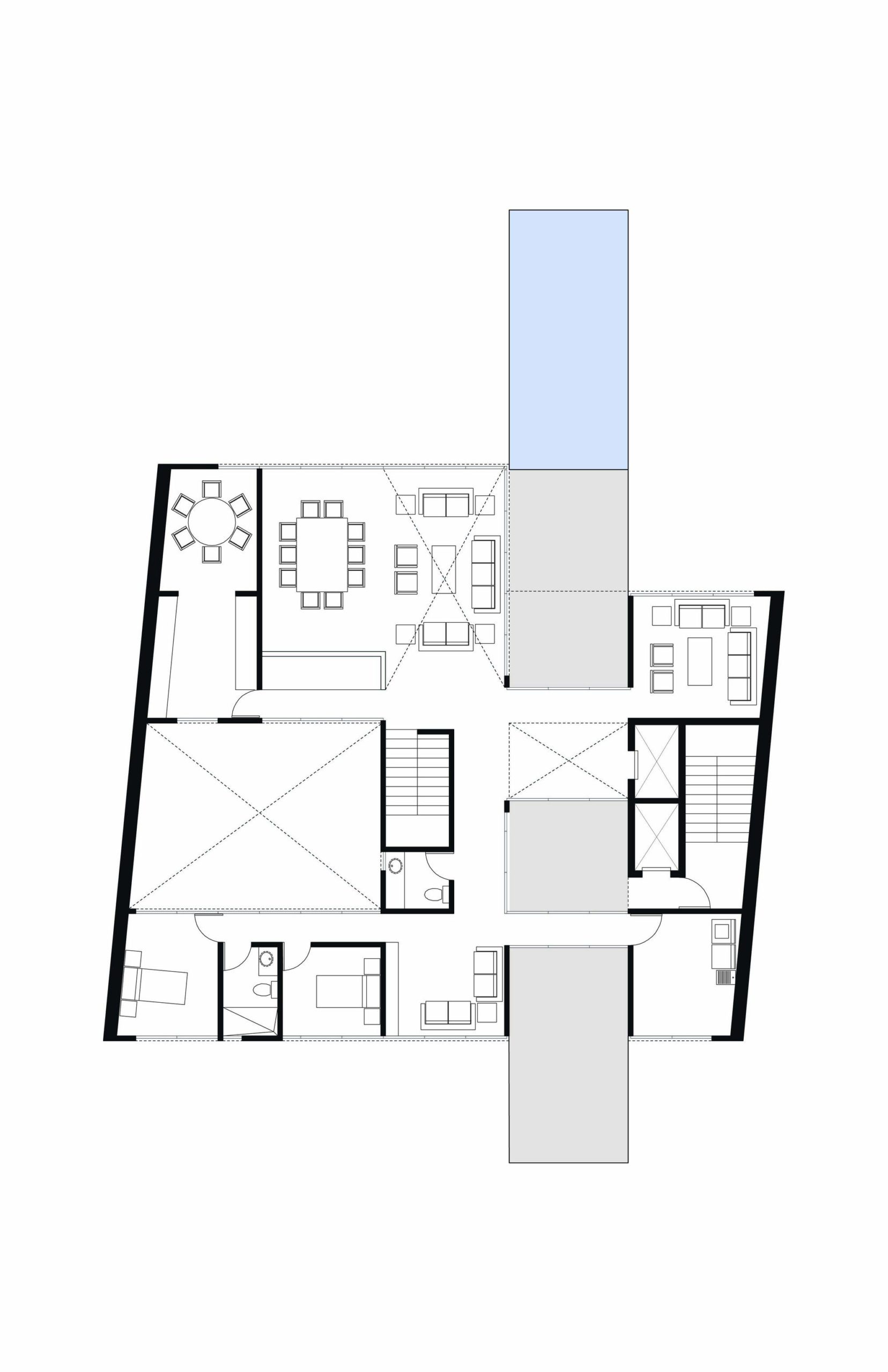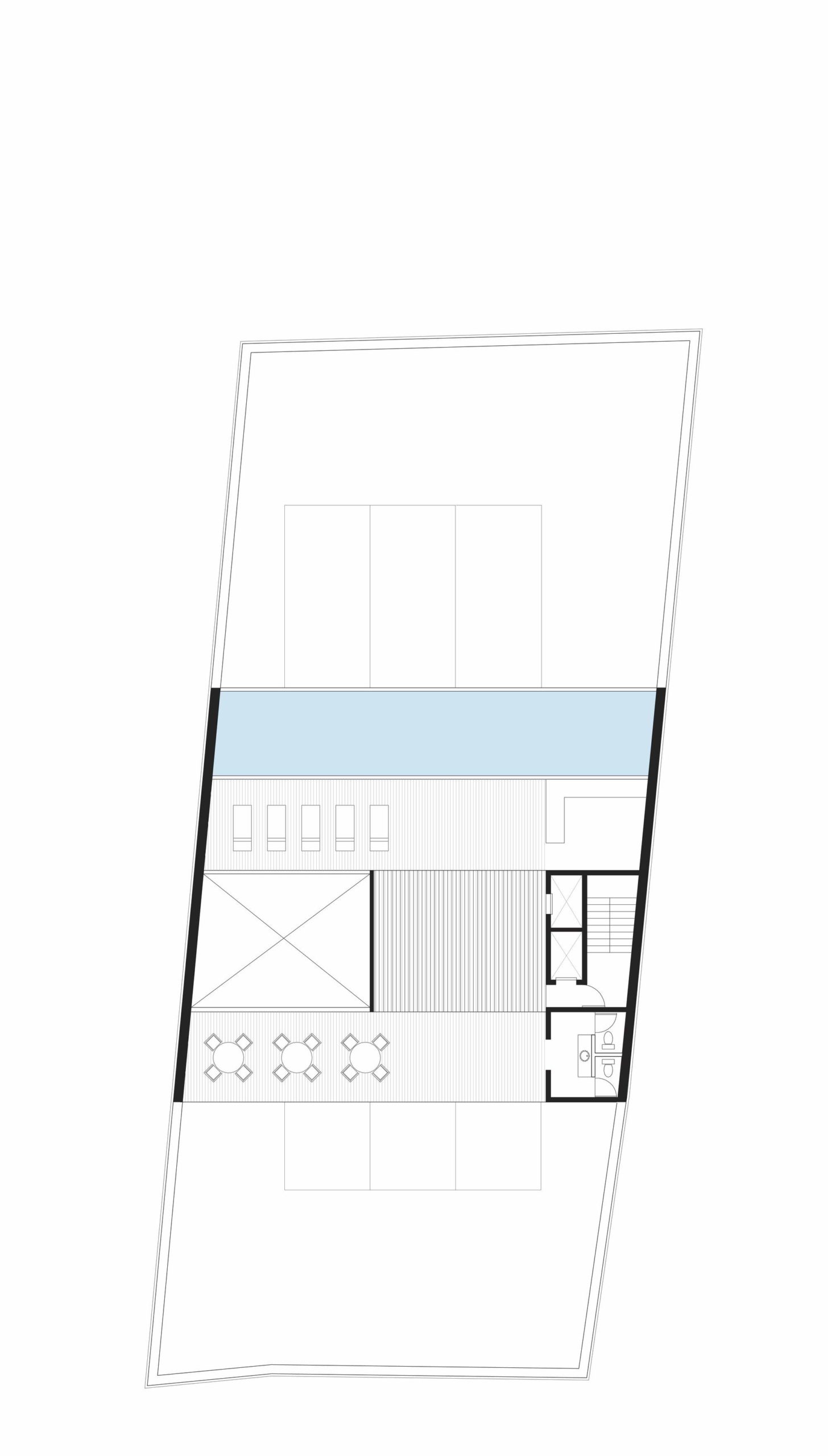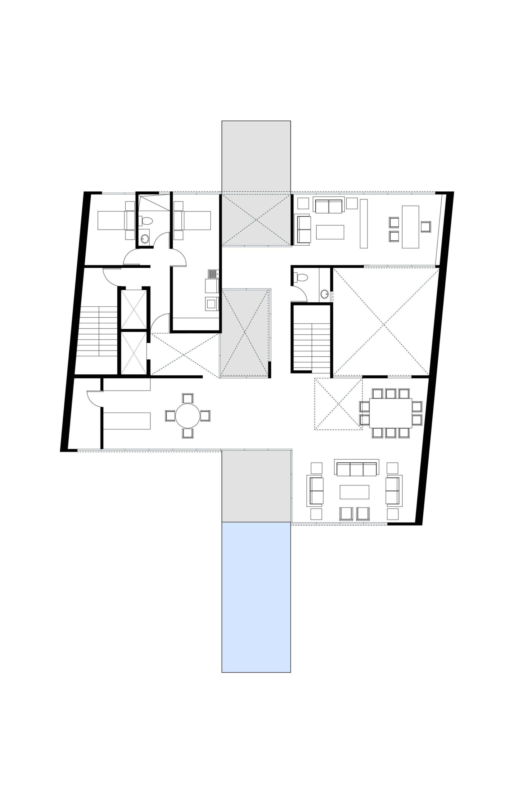 In order to further separate this design from the drab and boring stacked residential buildings, connected on to each courtyard a concrete swimming pool is cantilevered from the structure. With the main space of each apartment being the exterior spaces, the pool and terraces bring dynamism to the whole tower. The terraces are used to help fill the apartments with natural light and create a game of light and shadows. The way the apartments appear to be suspended and the cantilevered pools bring me to question a lot of things about structure within this project and if constructing something like this would even be possible. Still the proposal is a powerful interpretation of what an apartment complex can be like when given a little more imagination, and whether or not it is actually plausible only adds to its fanciful and fantastic nature.