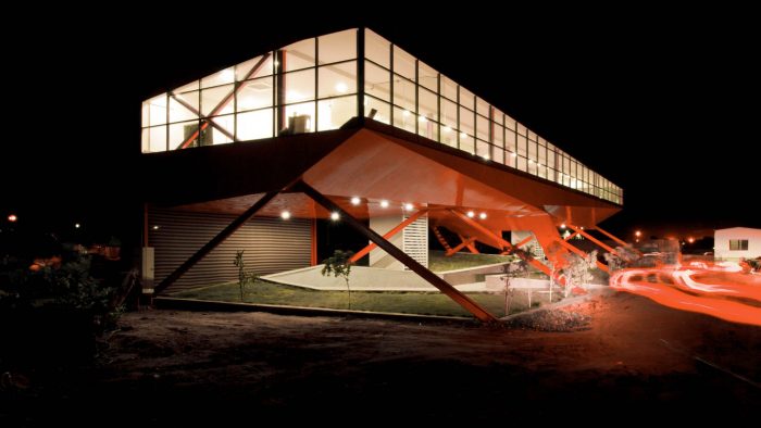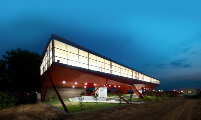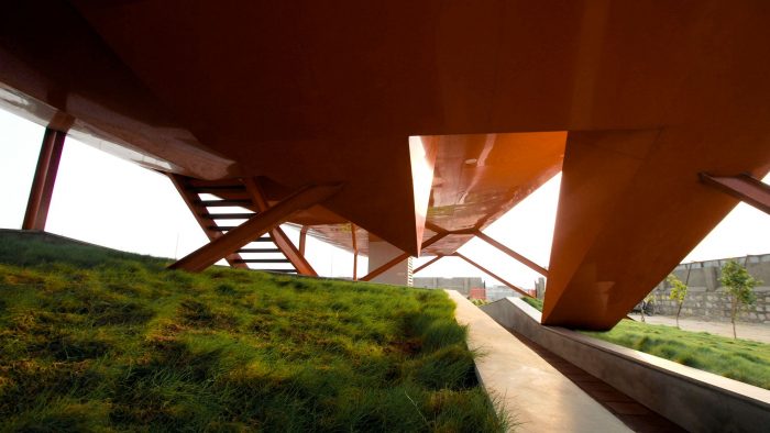 The striking red origami form in steel seems to levitate over a garden area on slender steel girders that give the building an industrial aesthetic. The faceted planes are carried forward in the landscaped areas tying them with the floating mass above that draws one’s attention when seen from the highway.