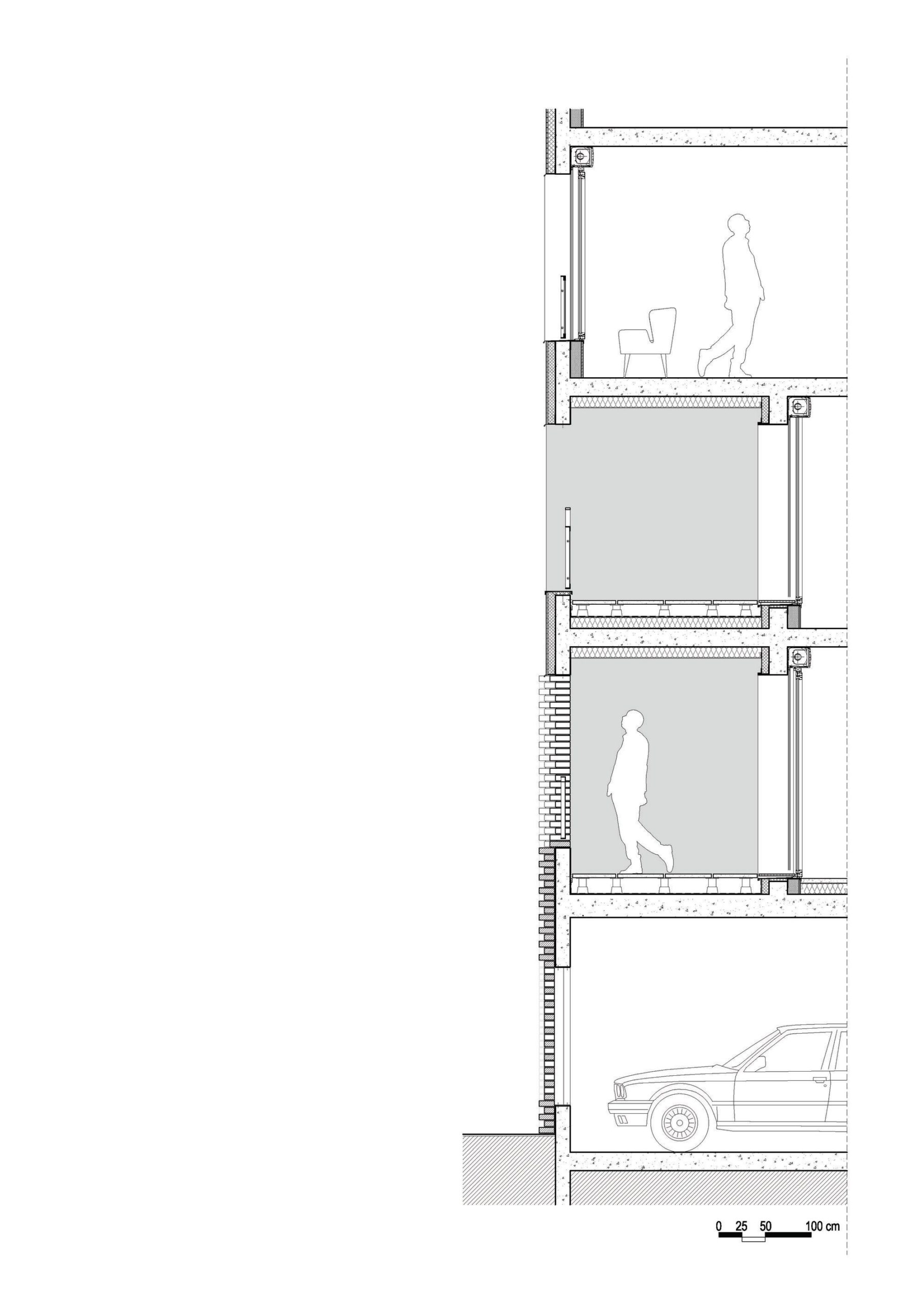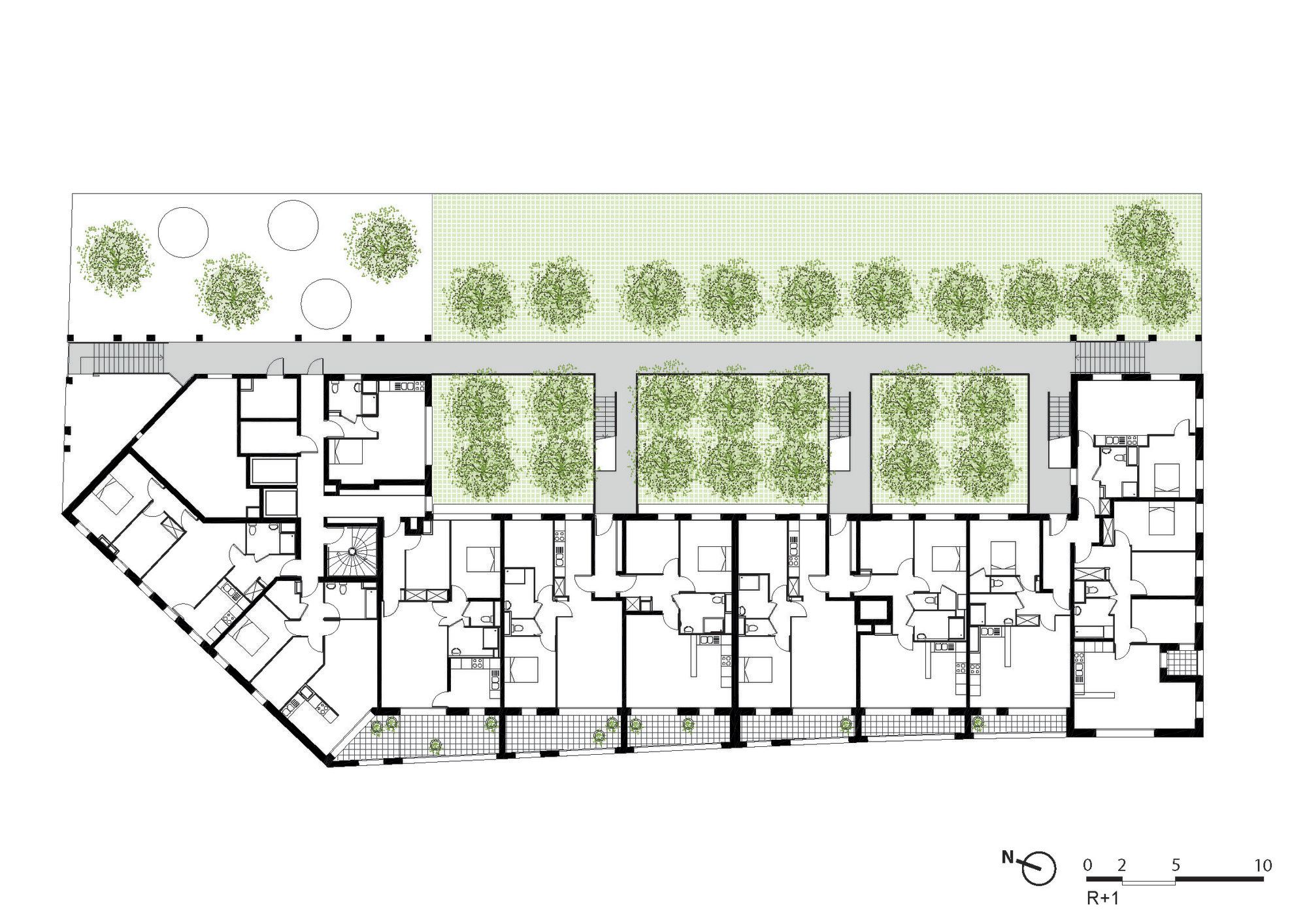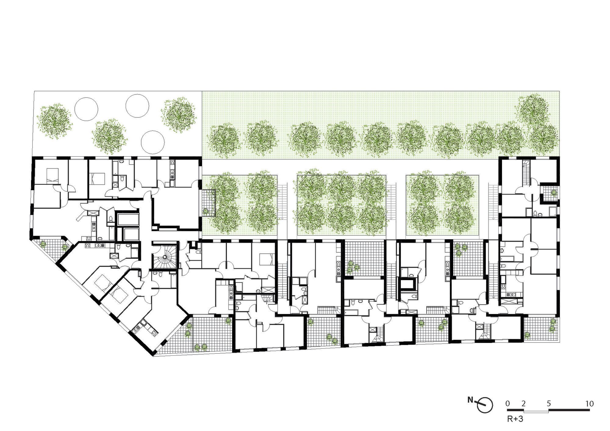 The buildings on the street corner are collective housing and have a far-ranging view out over the neighbourhood, but the height then gradually tails off towards the small square on the south side, splitting up to form an intermediary environment of superimposed townhouses. This typology marries the need for compactness with the quality of individual homes or small-scale collective housing that reflect the neighbourhood’s past and how people have always lived here.