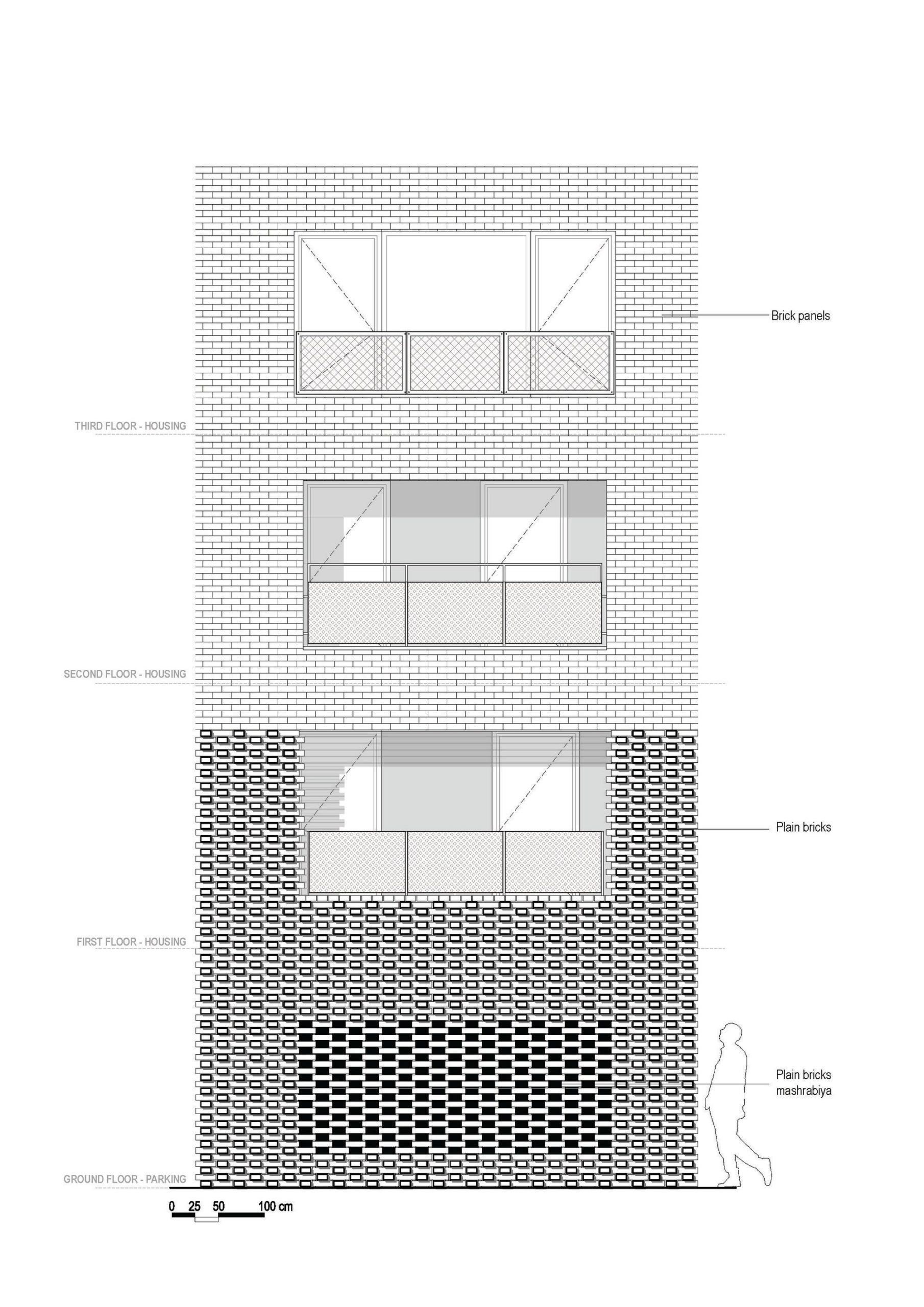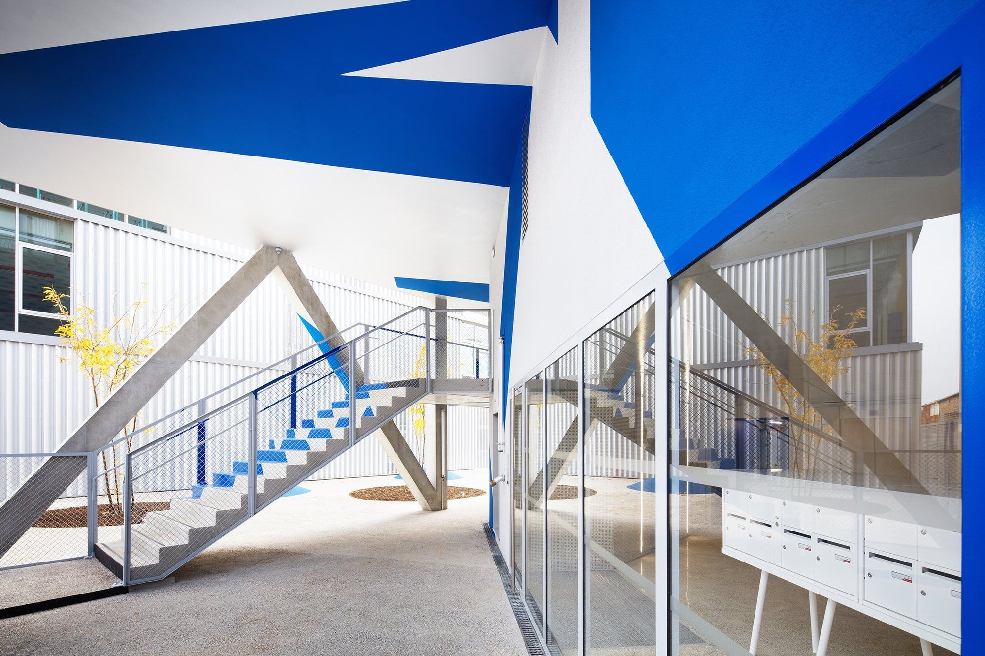 The houses and flats are raised above ground level, since the site is covered by flood prevention regulations. They are reached by means of a pathway that passes through the treetops of a ground-level park, offering residents a gentle transition between private, collective and public spaces along with a view of the entire site. Artistic add-on, Atelier YokYok painted an anamorphosis on the porches, establishing a graphic and playful dialogue with the architecture and the nearby school group.