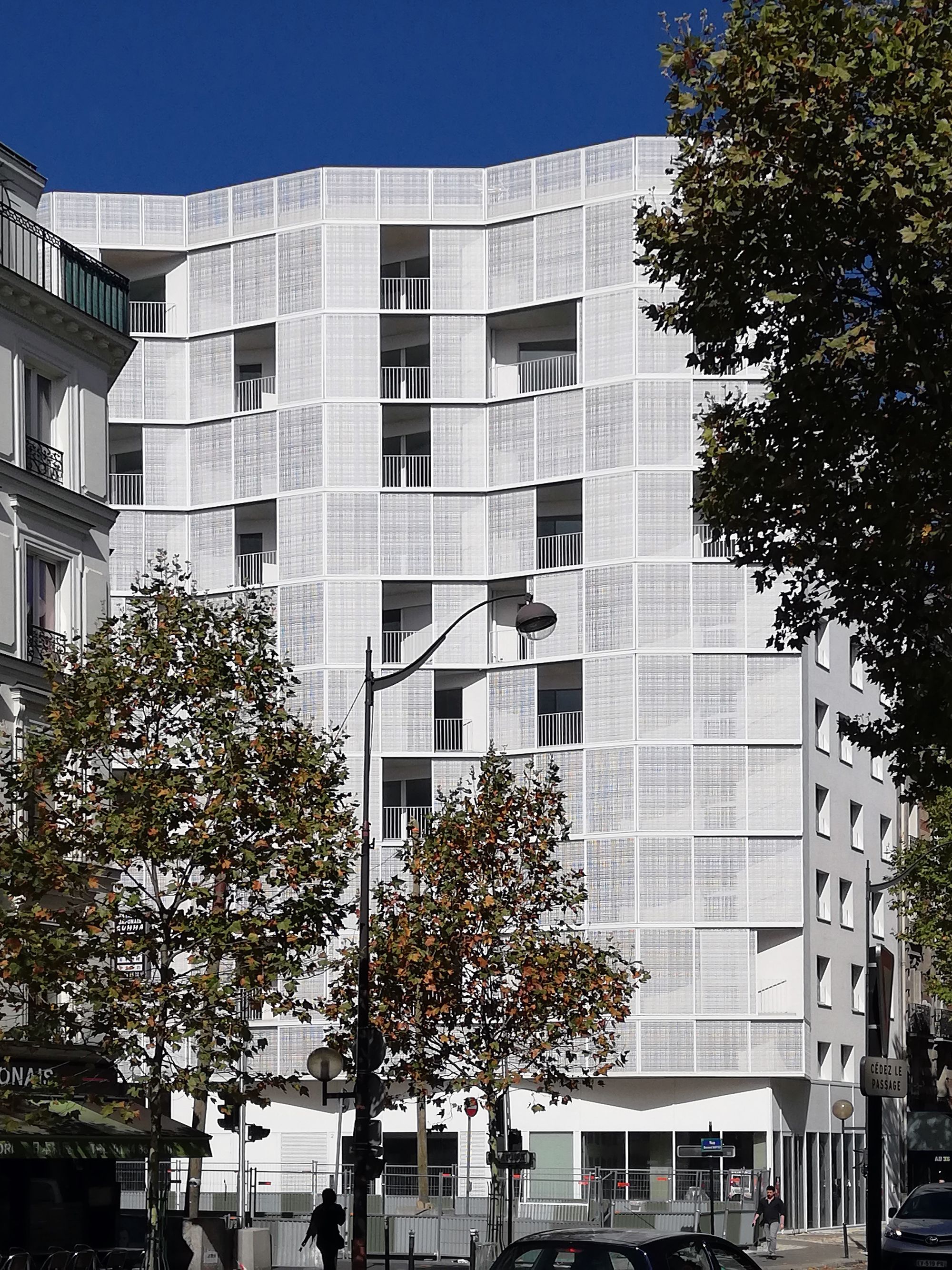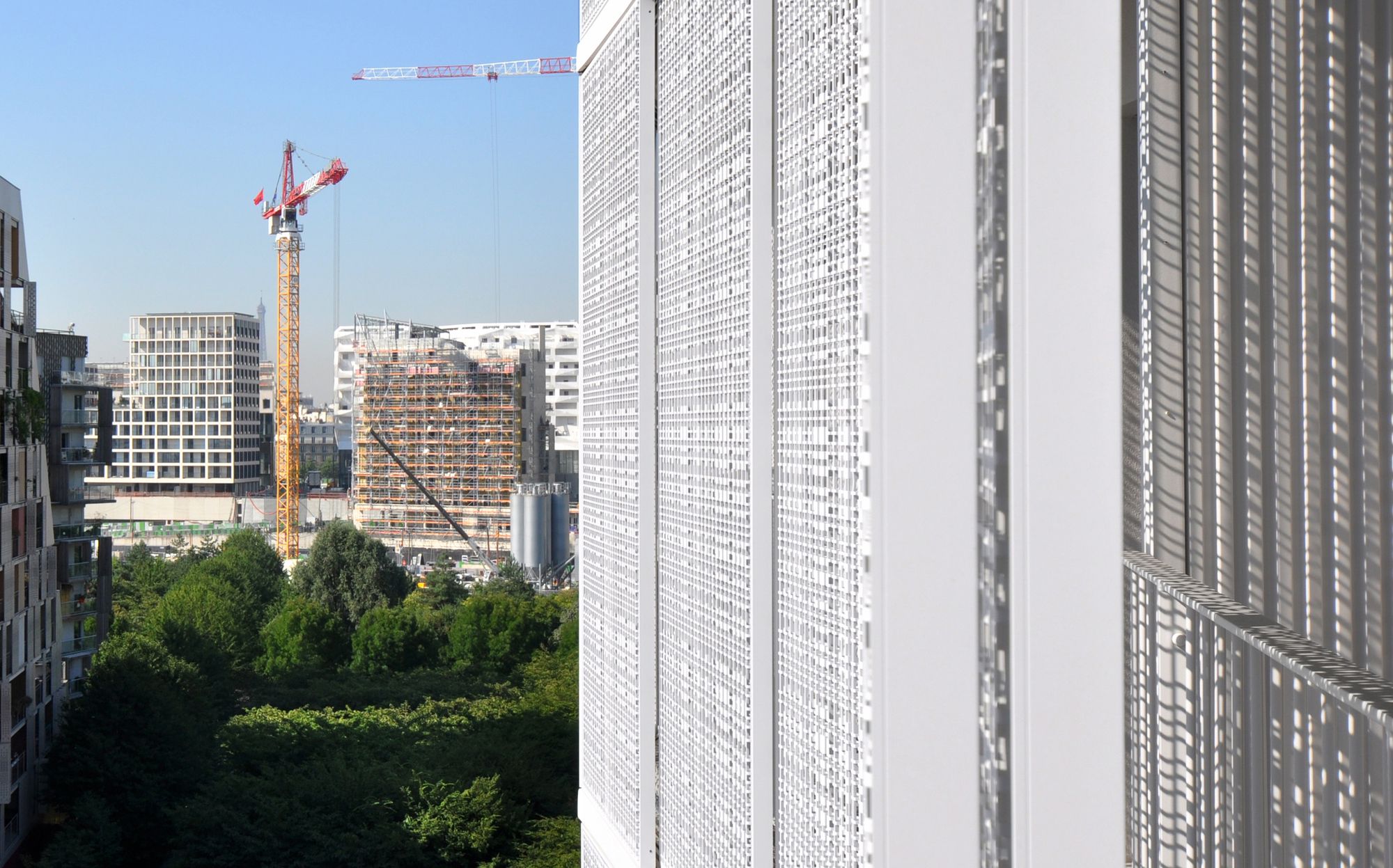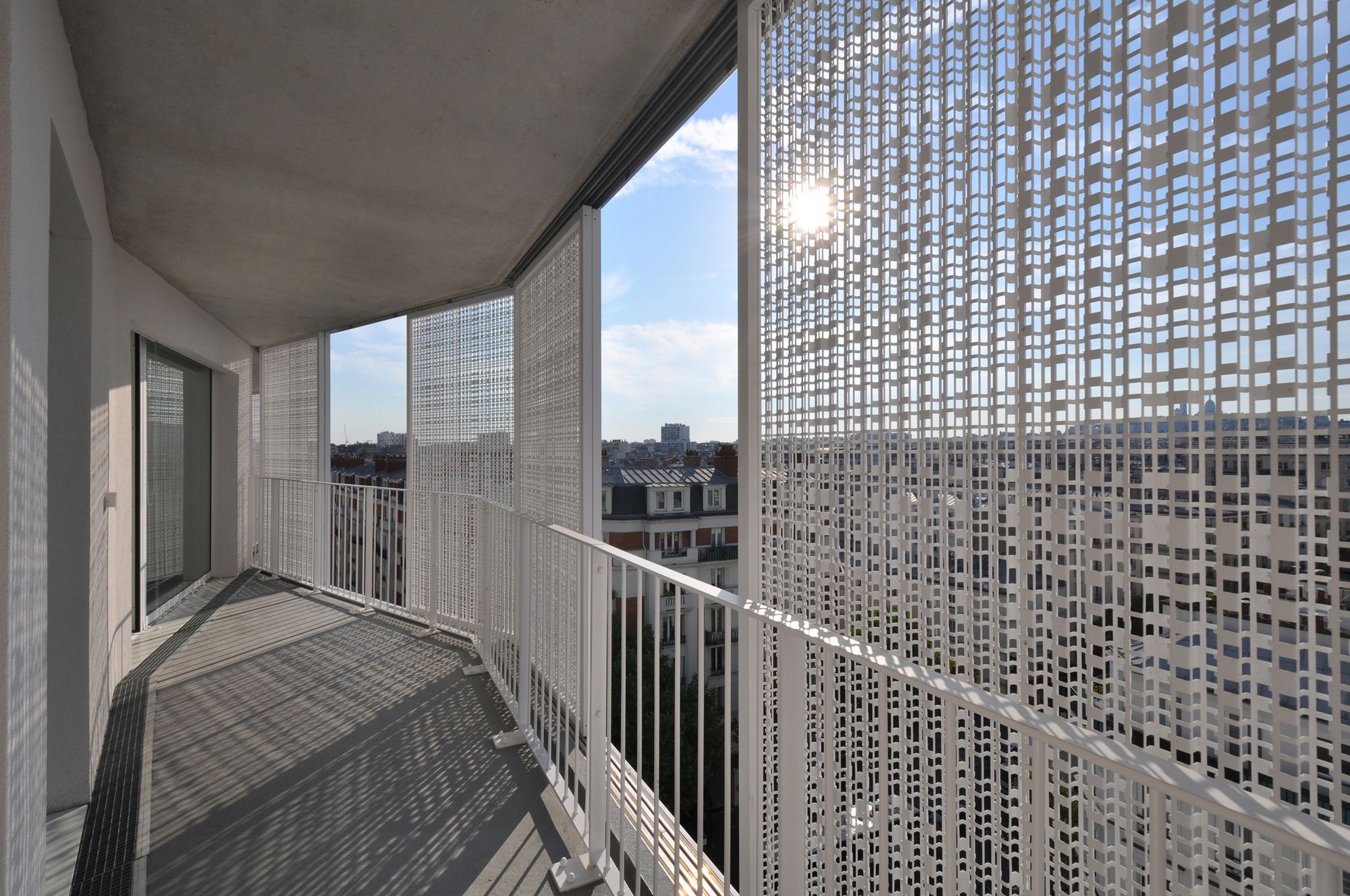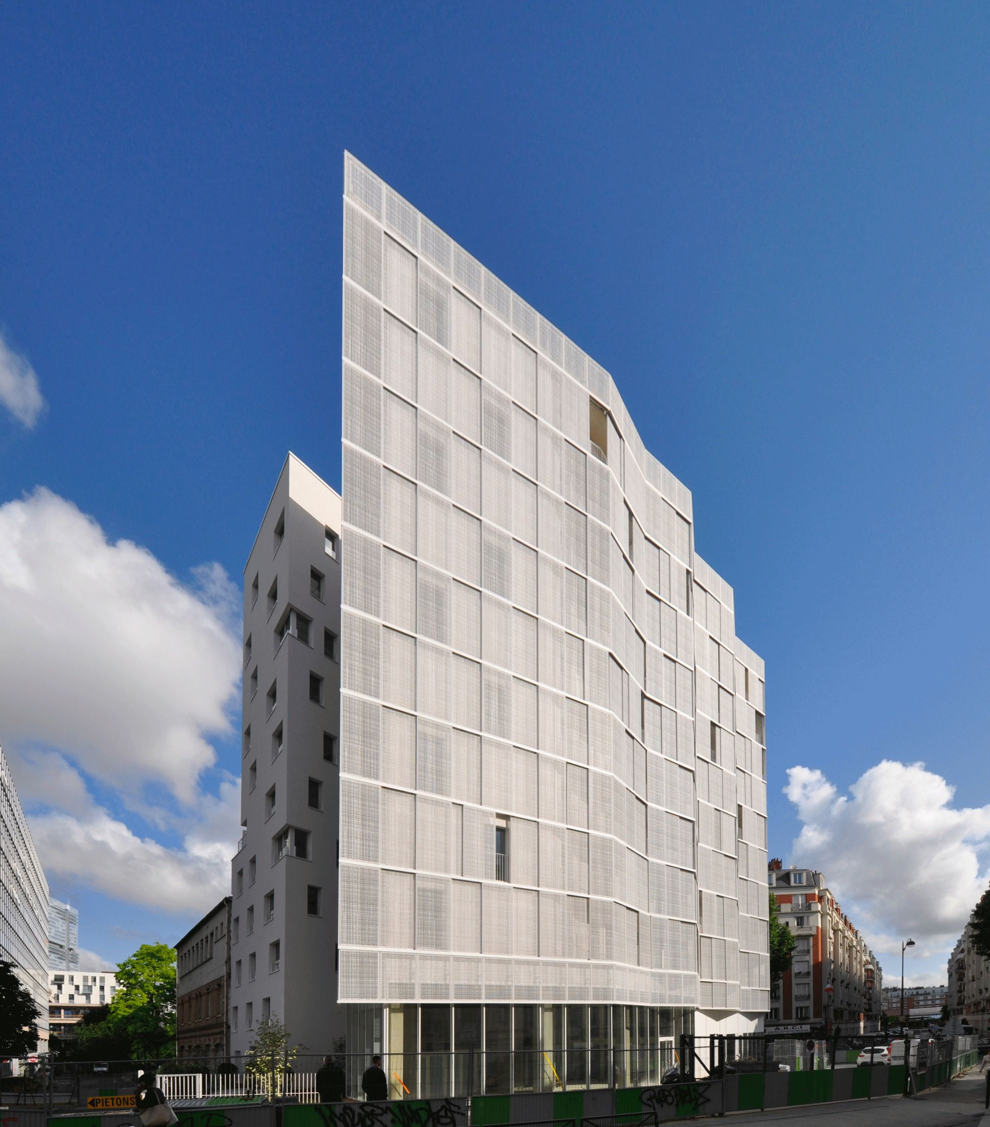 Designed by Bigoni Mortemard, Clichy Avenue, at the corner of Bernard Buffet Street, the architects, Stéphane Bigoni and Antoine Mortemard recently completed a social housing project that points to one of the entrances of the Martin Luther King Park. A delicate, white varnished aluminum cloak, made of perforated sliding curtains animates the south-east facade and the bow facing the park. Its bending geometry addresses three issues. It counteracts the linear aspect of the plot on its longest side, perceived as not suitable to satisfy conventional proportions. Its bending shape also accommodates loggias.