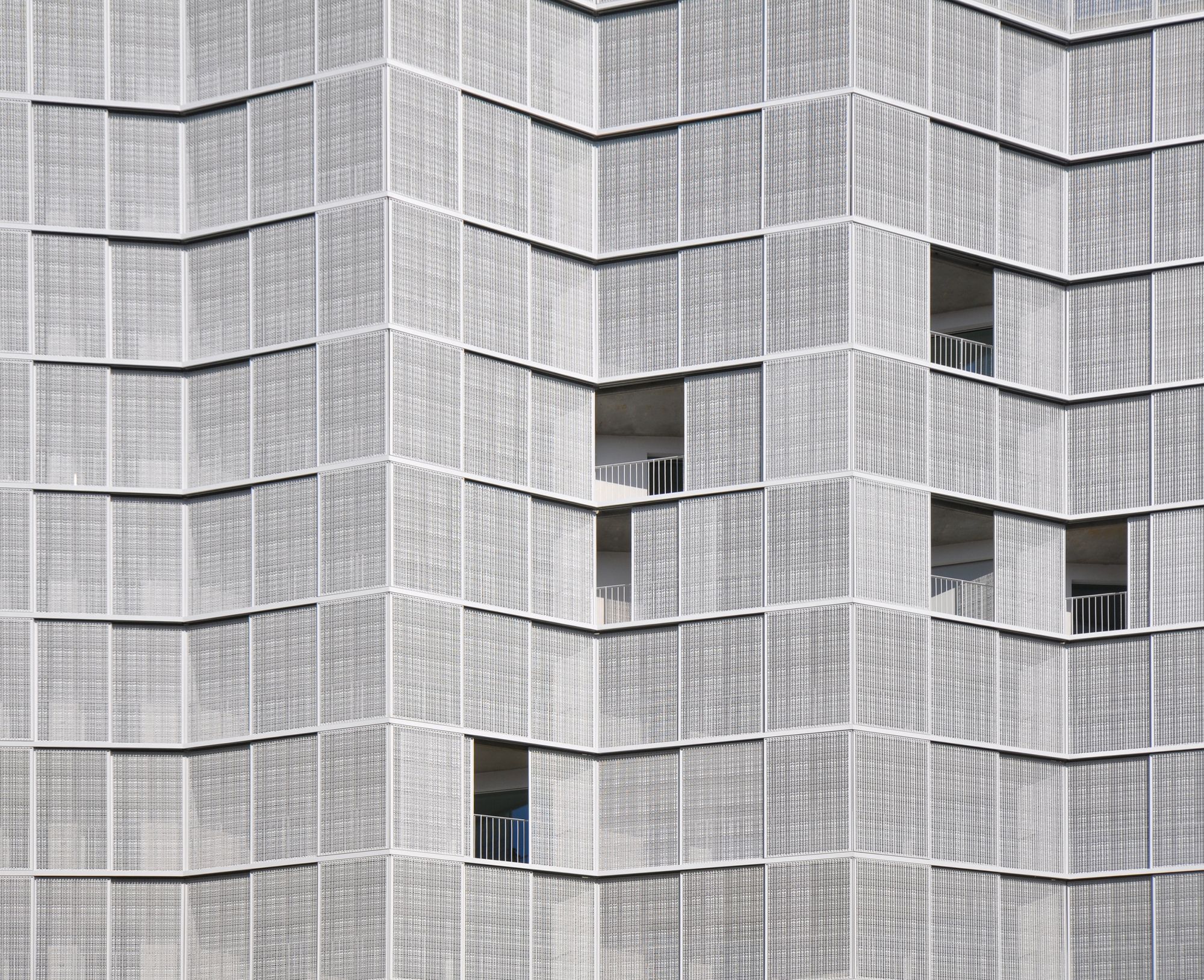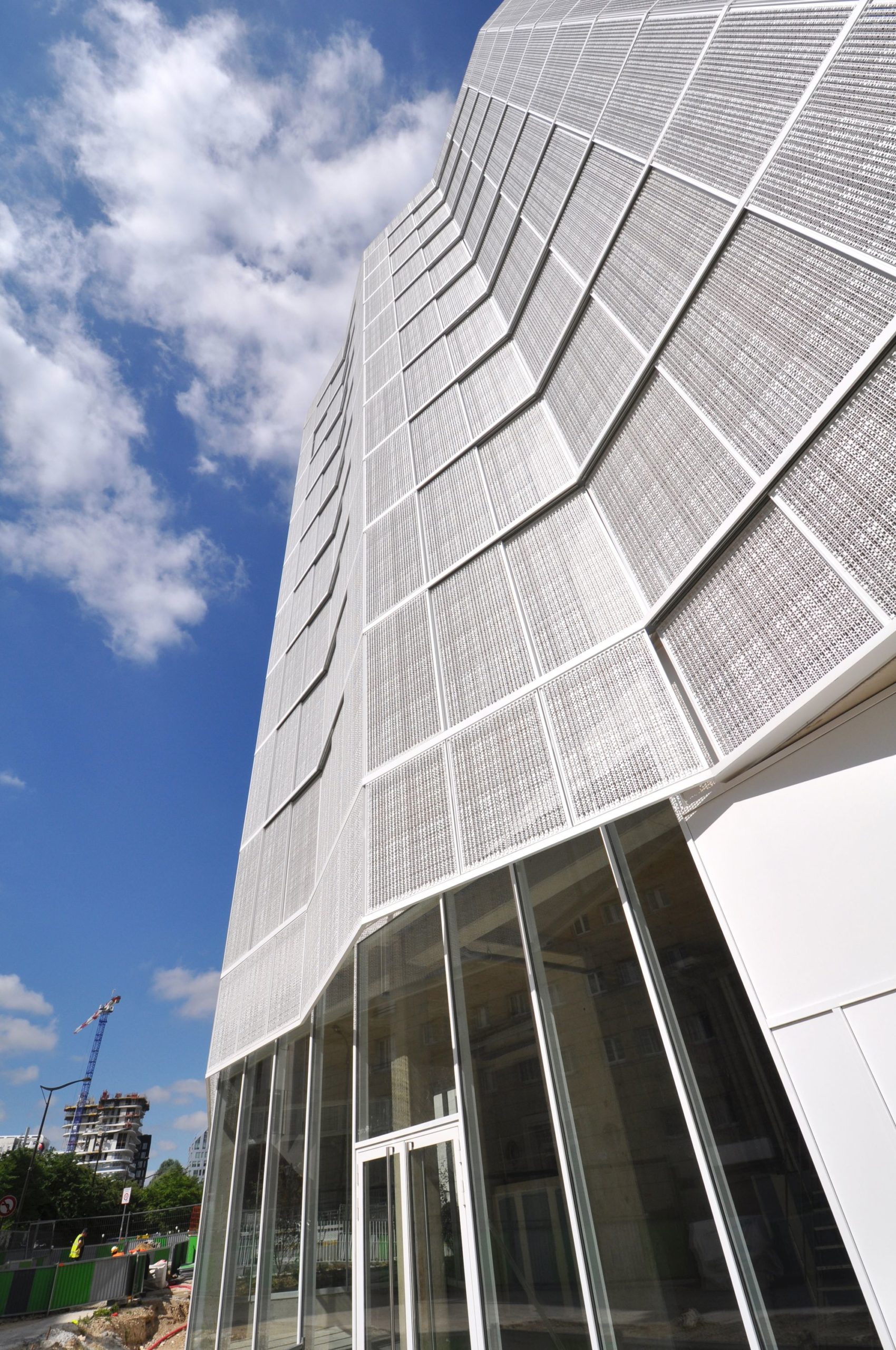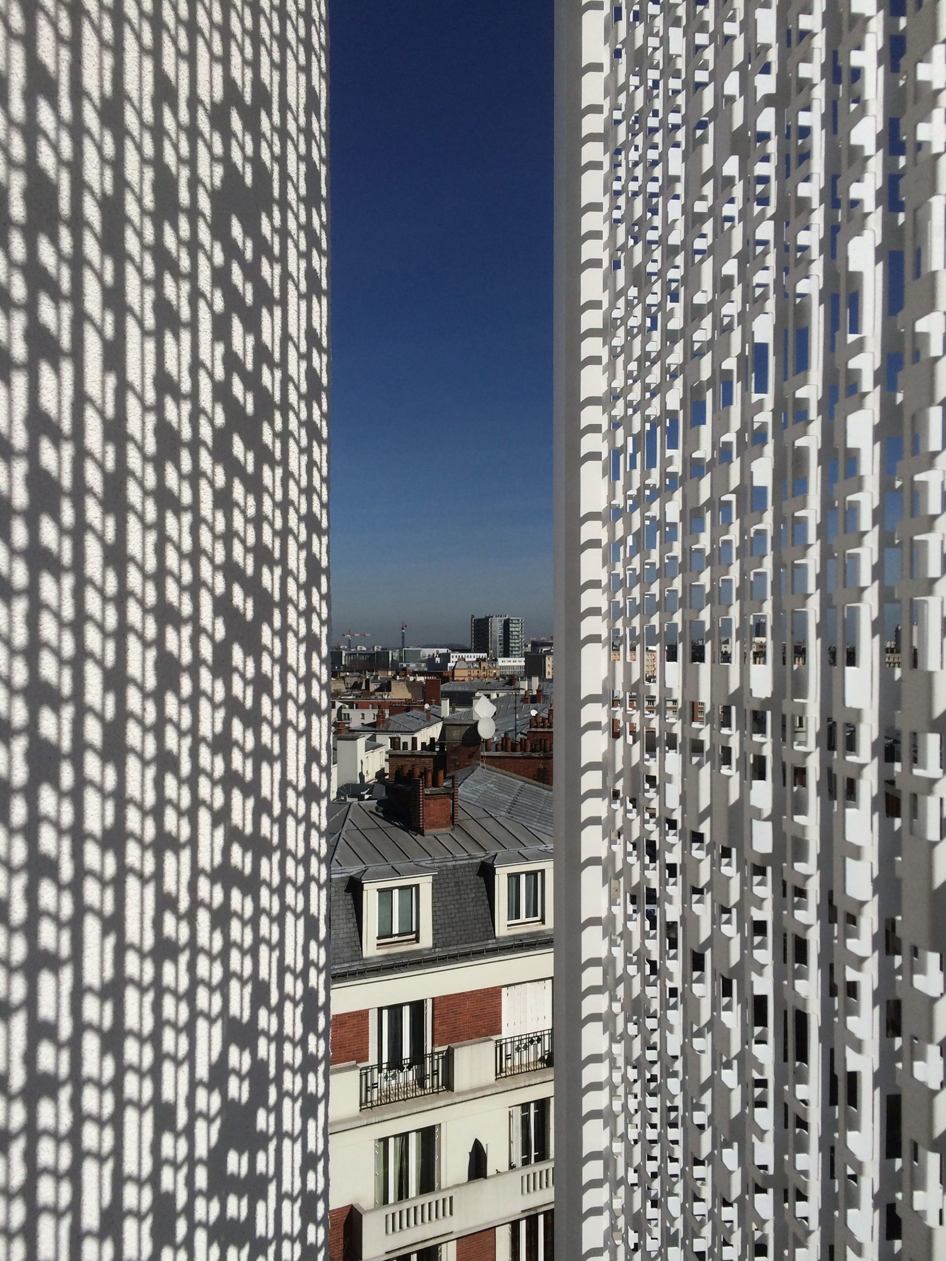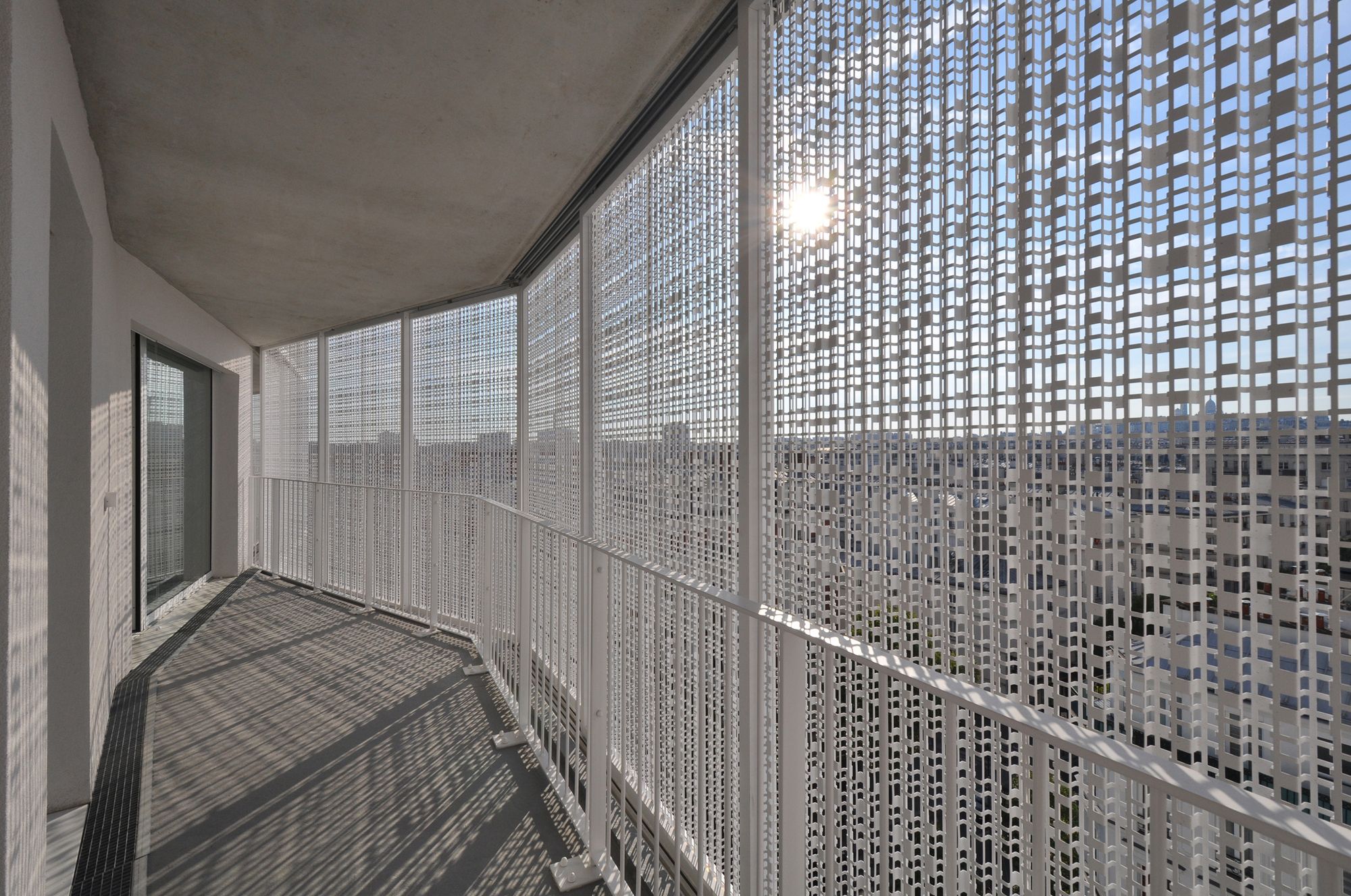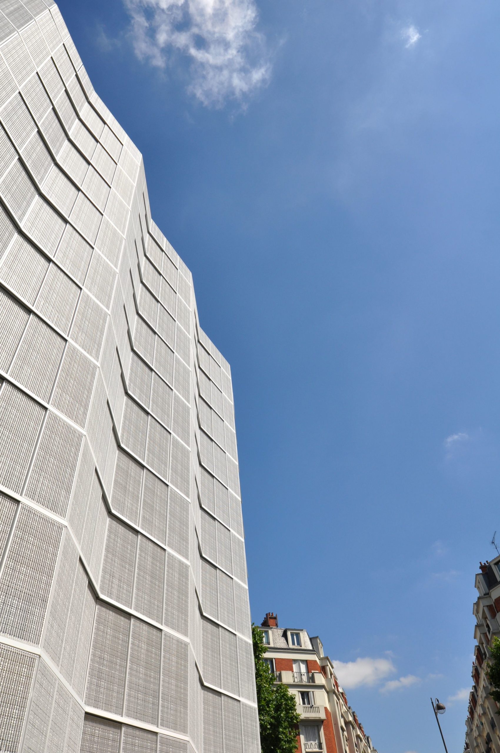 Designed by Bigoni Mortemard, Clichy Avenue, at the corner of Bernard Buffet Street, the architects, Stéphane Bigoni and Antoine Mortemard recently completed a social housing project that points to one of the entrances of the Martin Luther King Park. A delicate, white varnished aluminum cloak, made of perforated sliding curtains animates the south-east facade and the bow facing the park. Its bending geometry addresses three issues. It counteracts the linear aspect of the plot on its longest side, perceived as not suitable to satisfy conventional proportions. Its bending shape also accommodates loggias.