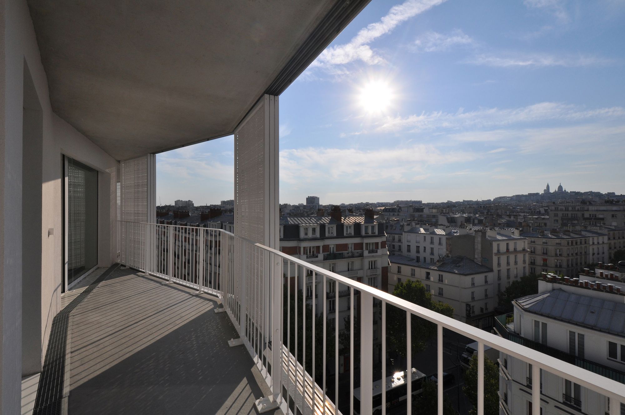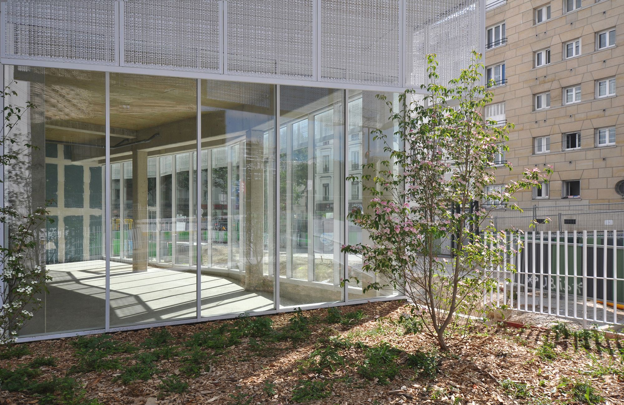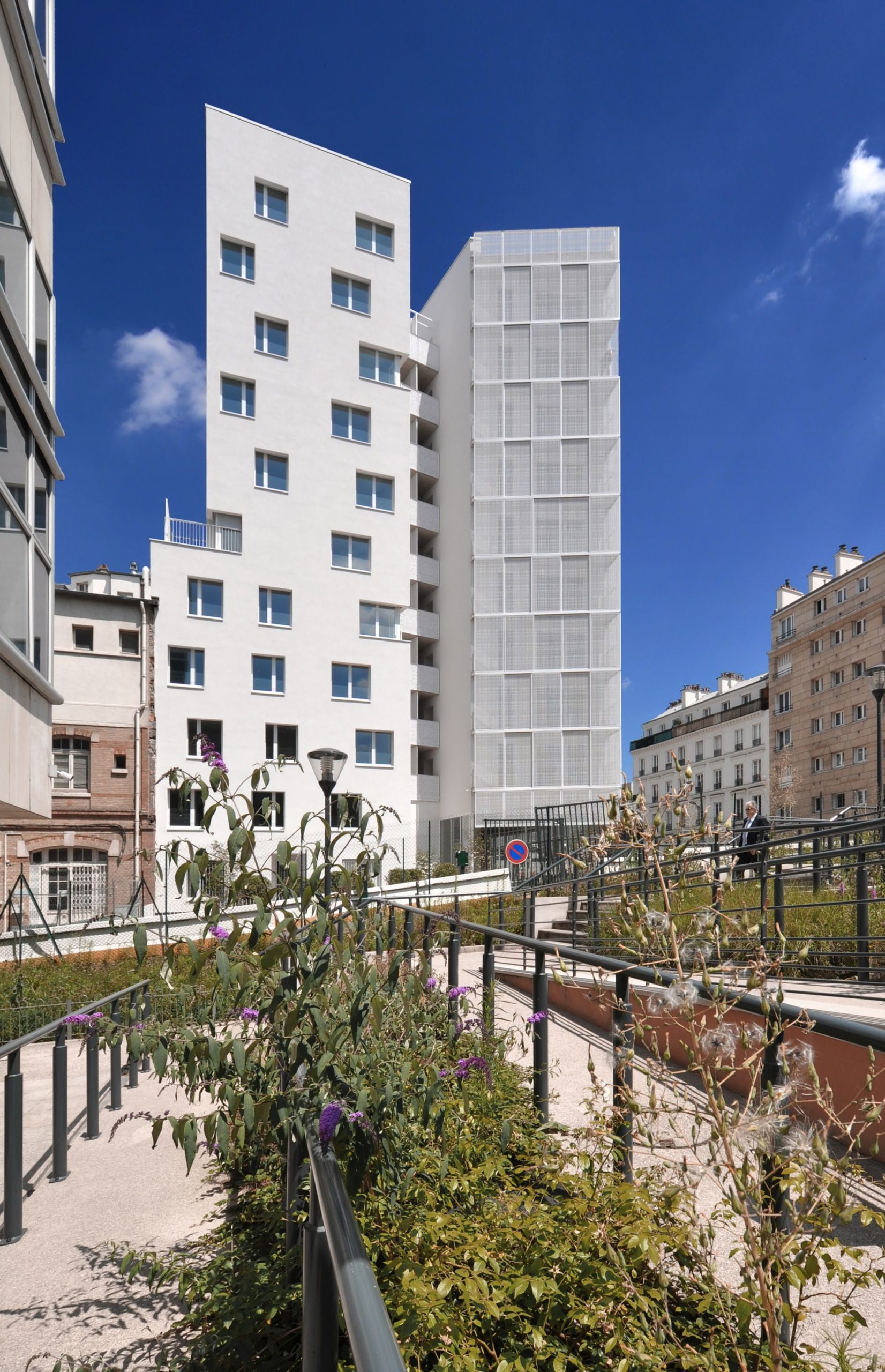 Their privacy can be adjusted by the dwellers, depending on the proportions of the aluminum curtains, whether it be stored on the side of the loggia or deployed. Finally, the folding shape of the facade enhances sidelong views. Each unit’s living room thereby enjoys distant, south oriented views over the park and beyond toward the Eiffel Tower. Access to the apartments is provided via a few gangways from which the edges enhance the view over the park. These passageways overlook a green backyard installed above the first floor and their layout allows for transition between apartments. Among the units, 46 enjoy a double or triple orientation.