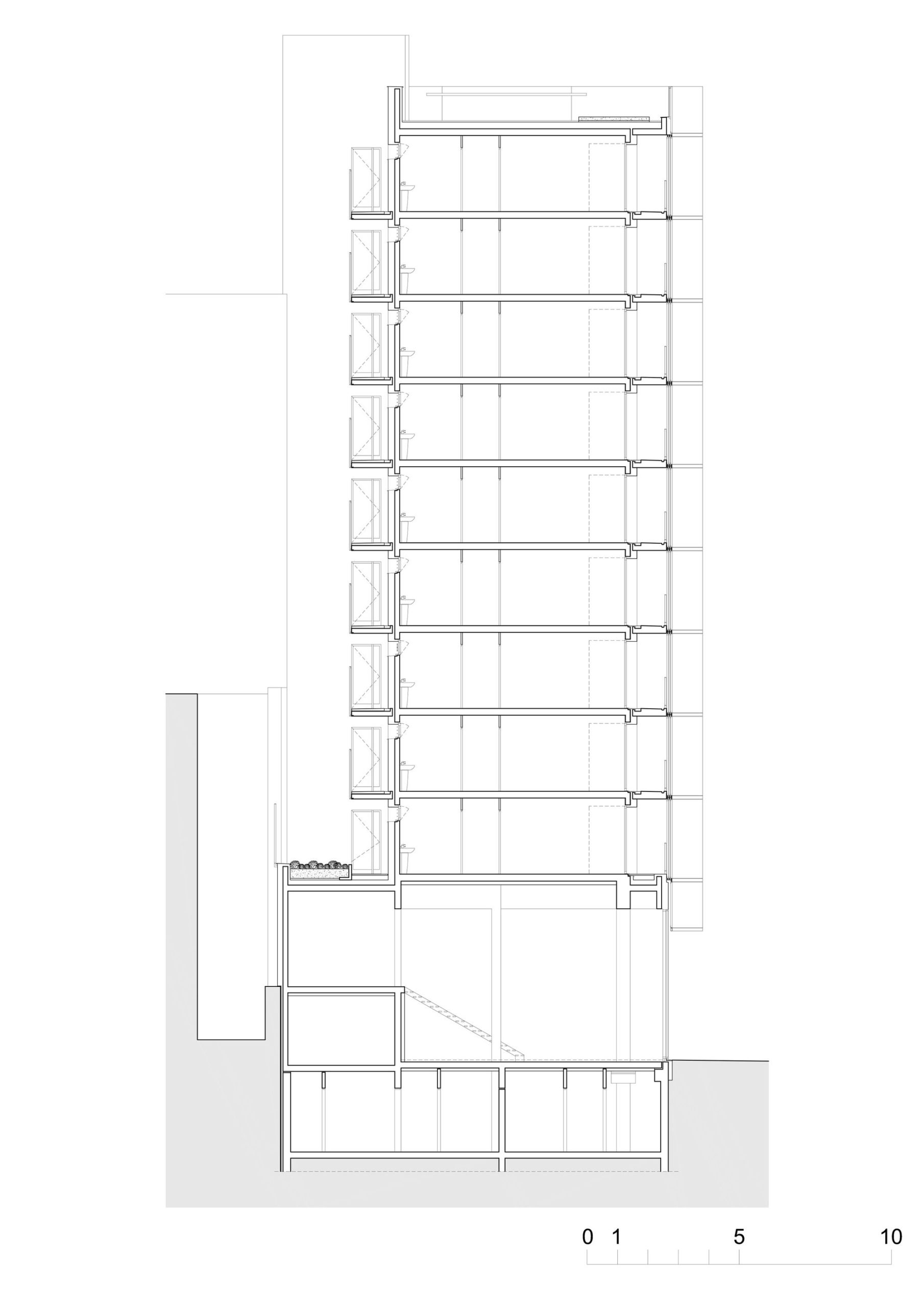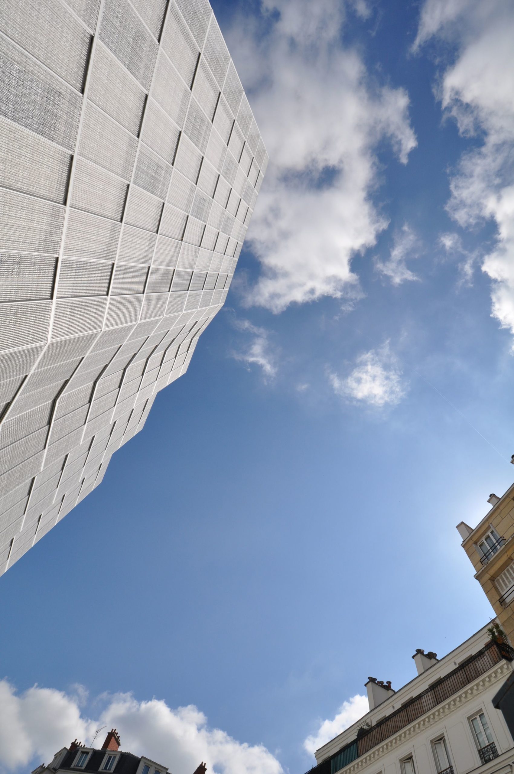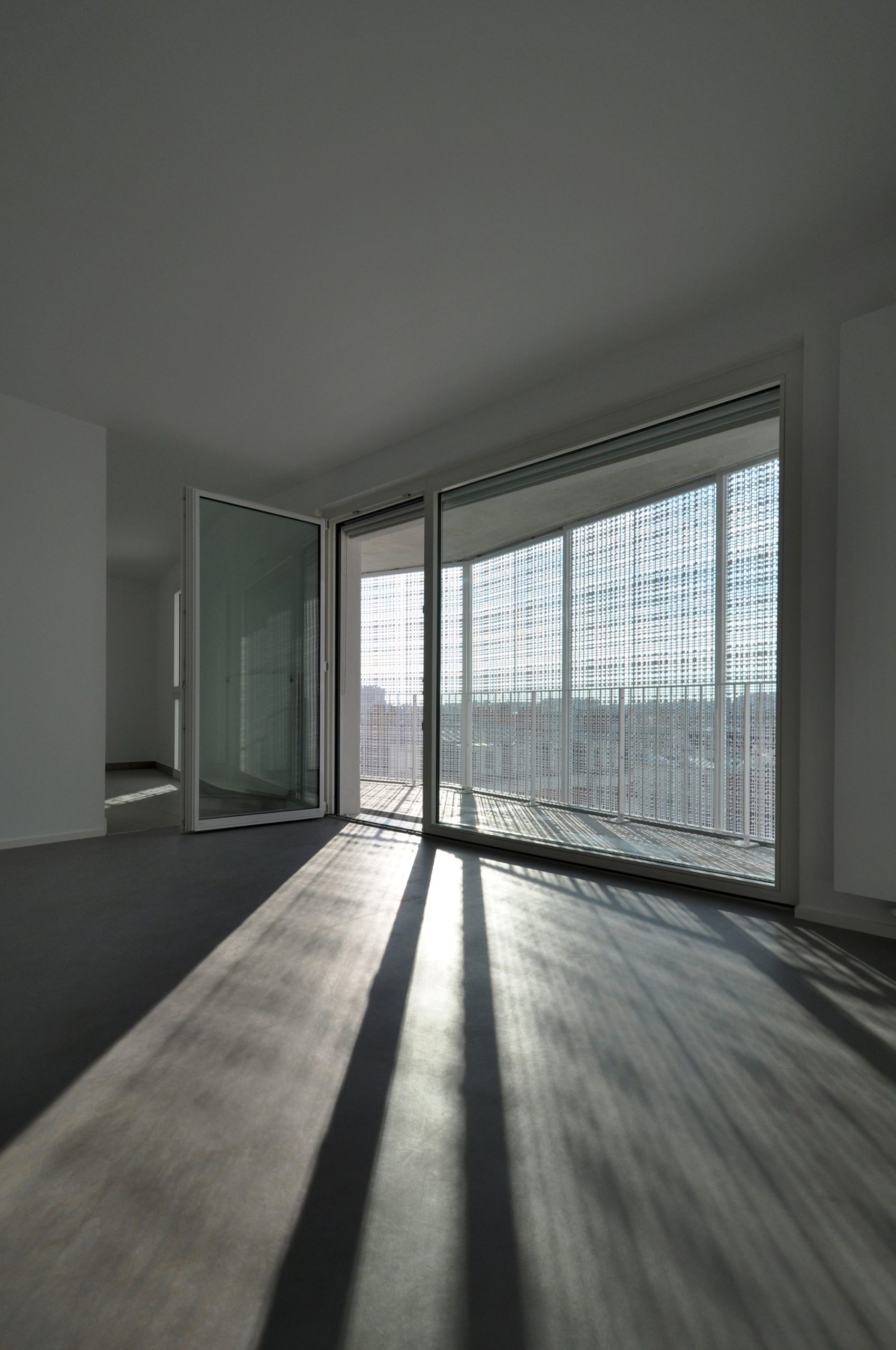 Their privacy can be adjusted by the dwellers, depending on the proportions of the aluminum curtains, whether it be stored on the side of the loggia or deployed. Finally, the folding shape of the facade enhances sidelong views. Each unit’s living room thereby enjoys distant, south oriented views over the park and beyond toward the Eiffel Tower. Access to the apartments is provided via a few gangways from which the edges enhance the view over the park. These passageways overlook a green backyard installed above the first floor and their layout allows for transition between apartments. Among the units, 46 enjoy a double or triple orientation.