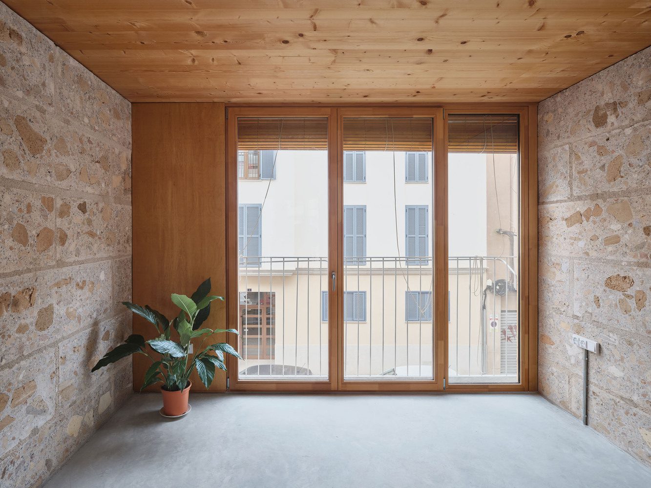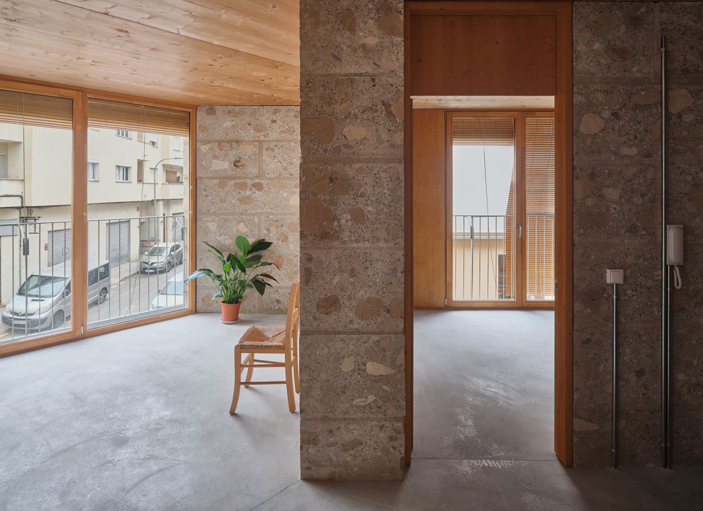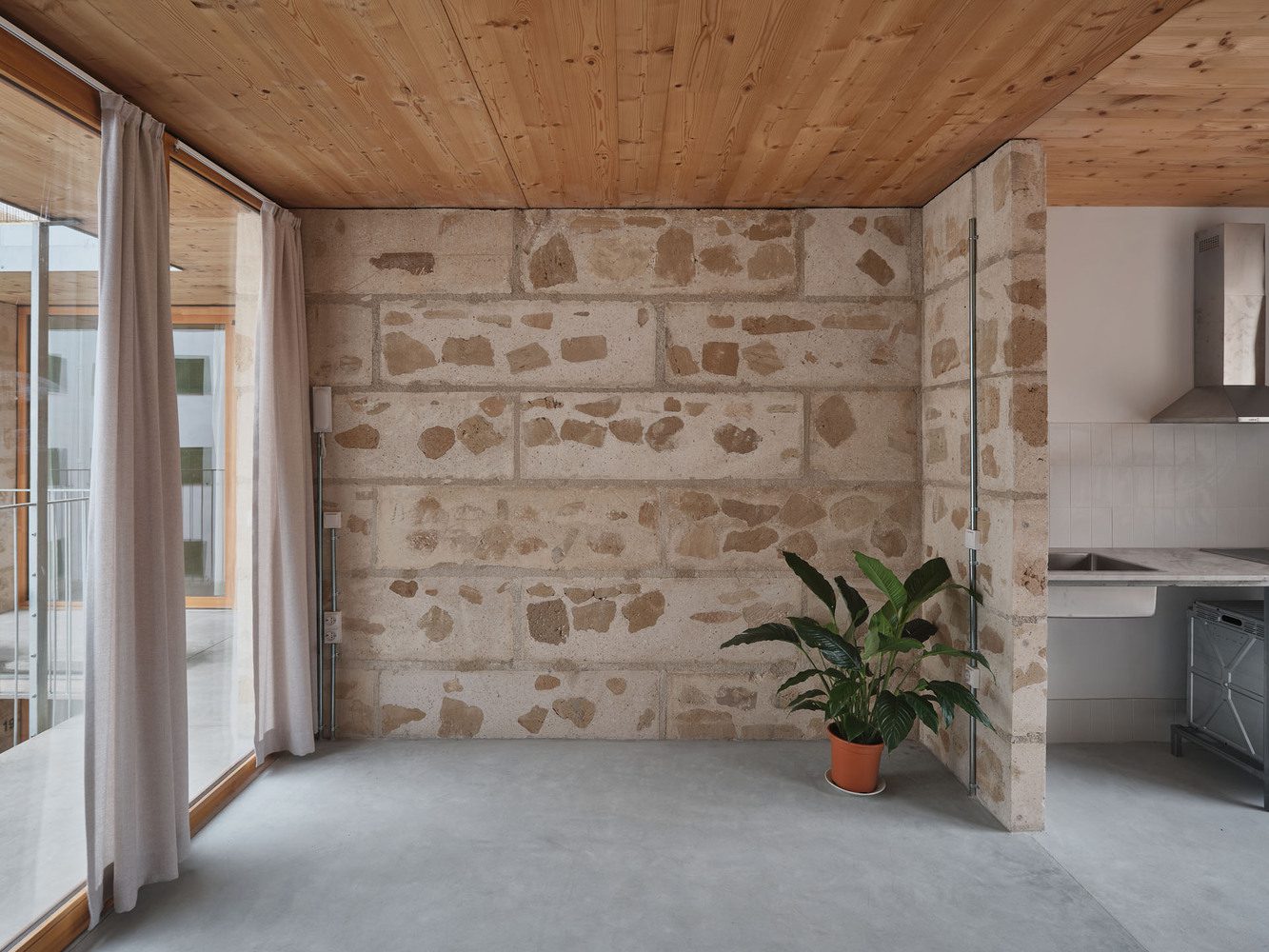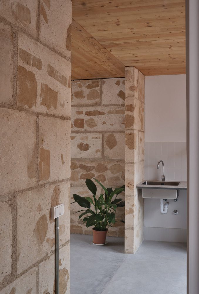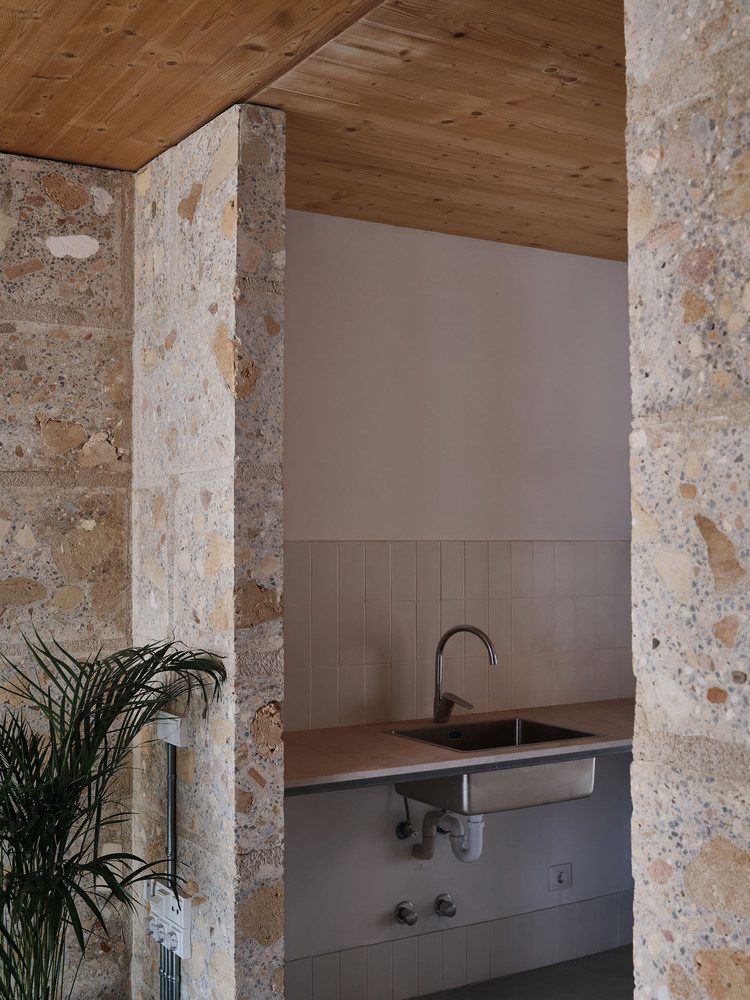 On the plot where the Social Housing Units 2104 were built, primarily intended for the elderly, there was a building that we were obliged to demolish due to its non-compliance with urban planning regulations and its poor conditionāthere was no possibility of preserving it. It was a small, disused three-story school constructed with structural sandstone (marĆØs) walls and concrete and ceramic ceilings. The project’s distinctive strategy was the utilization of demolition materials from the old school as resources to construct the new building, practicing what we might call urban mining: where material resources come from the urban plot itself, resulting from the demolition of the pre-existing building.