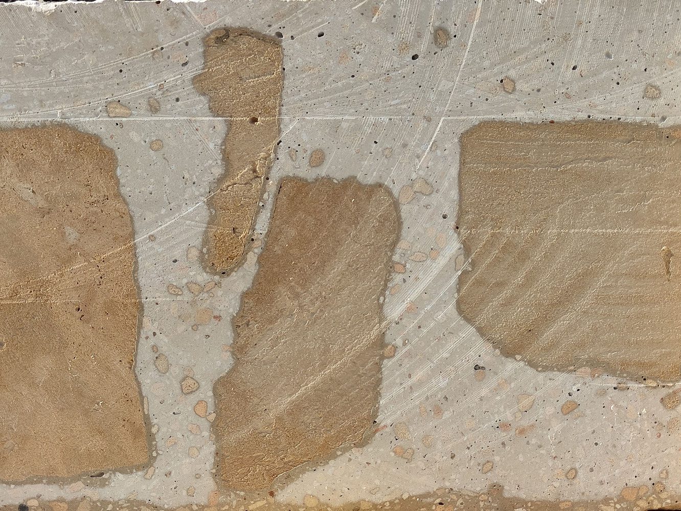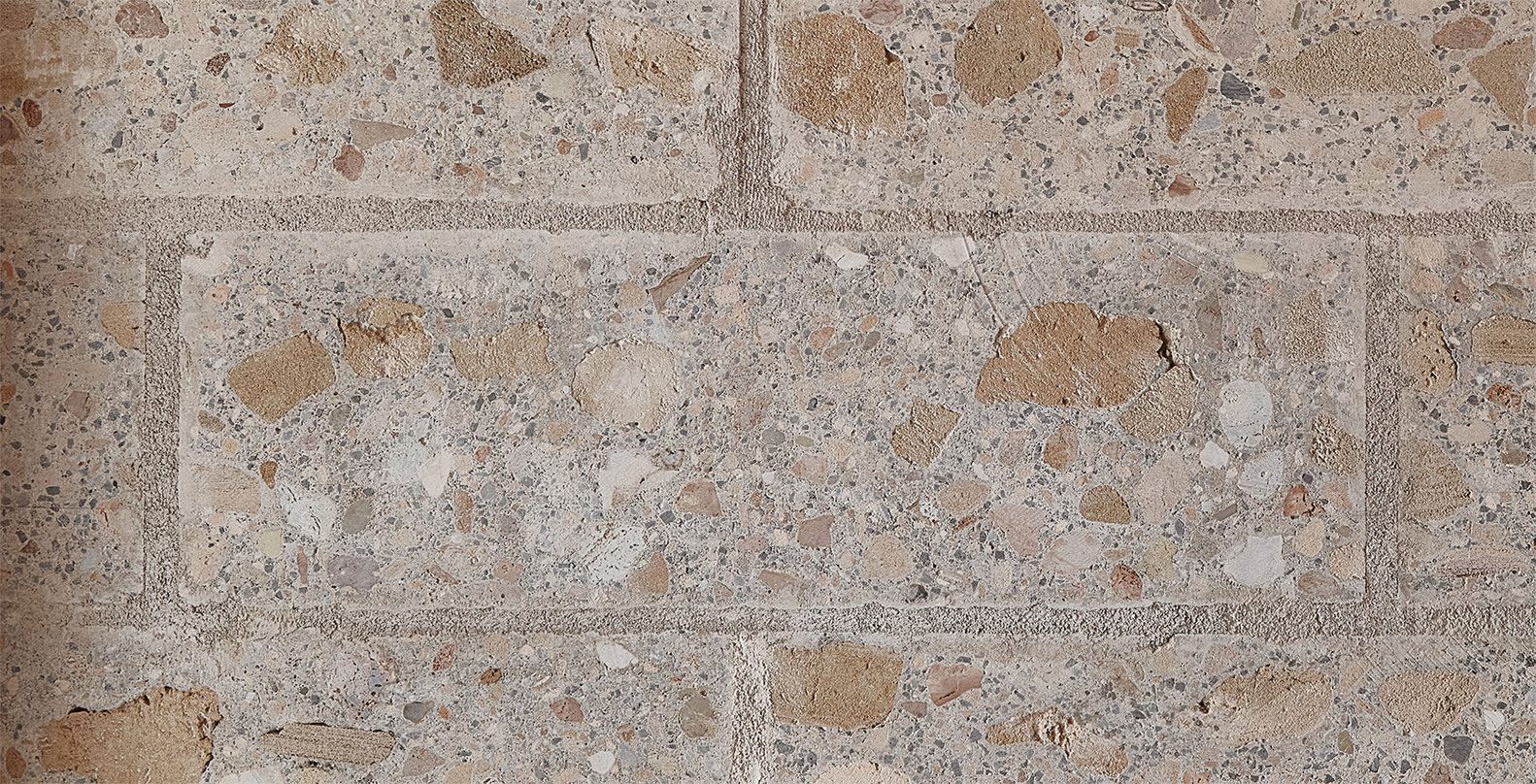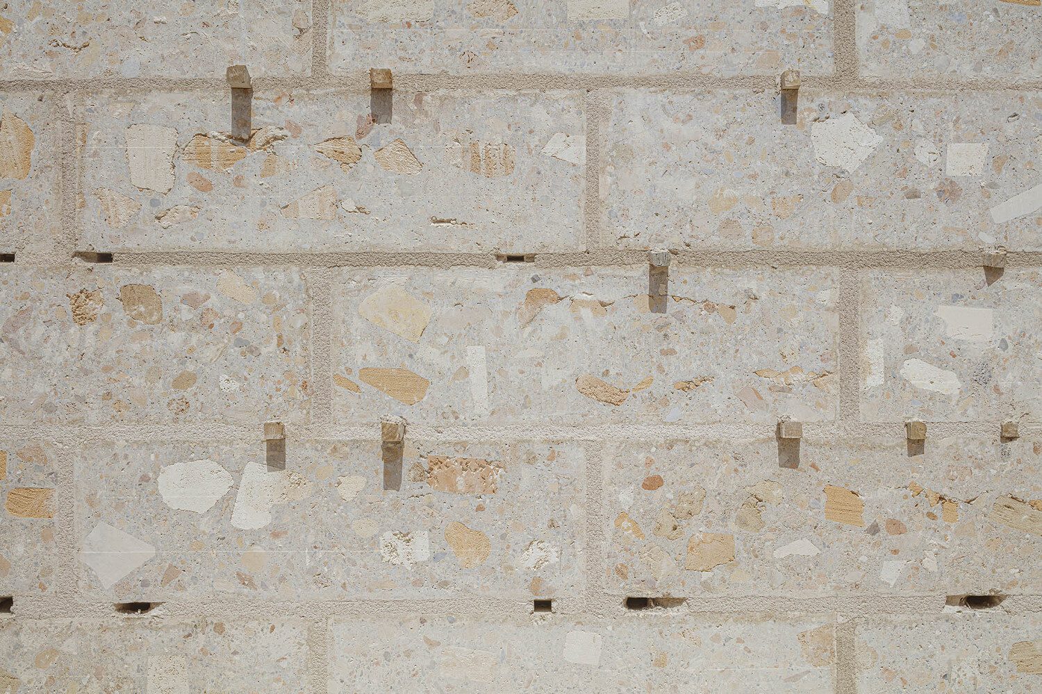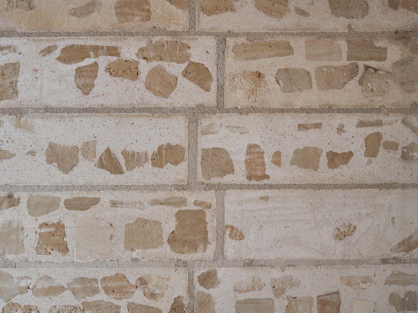 Once the demolition was completed and materials were selected, nearly all the rubble was repurposed according to material type. First, pieces of ceramic and concrete elements (140 m³) were poured into the foundation pits and walls of the semi-basement. Second, all the sandstone (about 160 m³) was used to construct large blocks (approximately 3,000 units) of cyclopean concrete with cement and lime mixed with recycled marĆØs stone (40% of the block volume), composed of large cobbles up to 30 cm in diameter, sandstone gravel, and picadĆs (sand, also from marĆØs). Each block was cut with a large disc saw from a 4 x 4 m2 slab, so that the stones reappeared on the faces of the blocks.