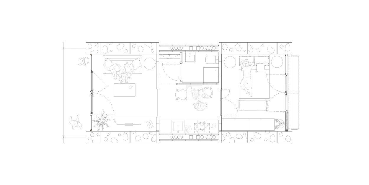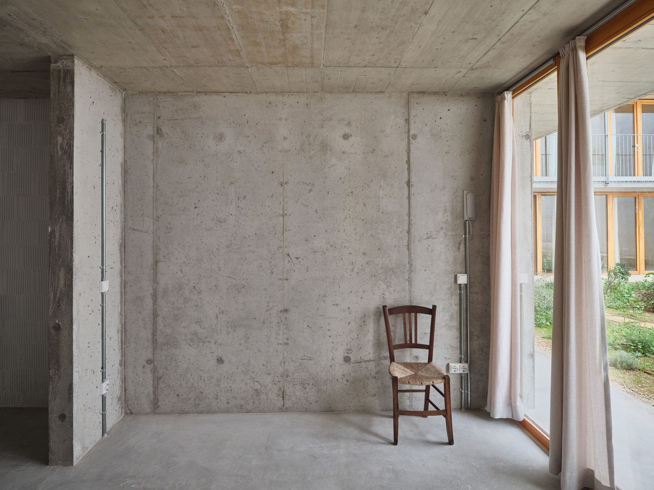 The entire spatial and programmatic organization of the building responds to the described structural system; the floor plan is organized with a stair core in the corner, providing access to a walkway in the interior garden, from where each apartment is accessedāall are through apartments except those on the semi-basement floor, which, like those on the attic floor, have half the depth of the typical floors and utilize two structural spans for each apartment. The top-floor apartments have large terraces. Each floor also has a communal area (laundry room, lounges, etc.).
