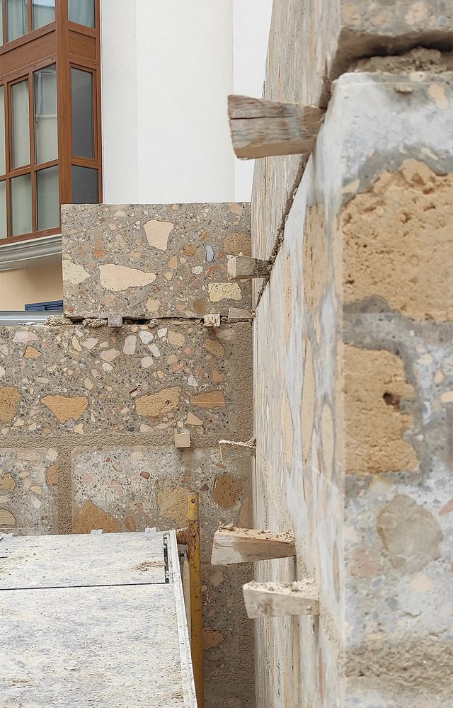 The blocks for the top floor, bearing less load, are made of 100% lime concrete, while the rest of the floors combine lime with cement. These blocks, approximately 135 cm long, 42 cm high, and with variable widths for each floor (64, 54, 44, and 34 cm), were prefabricated once the demolition was completed, before commencing the construction of the new building. This approach significantly reduced the construction duration.