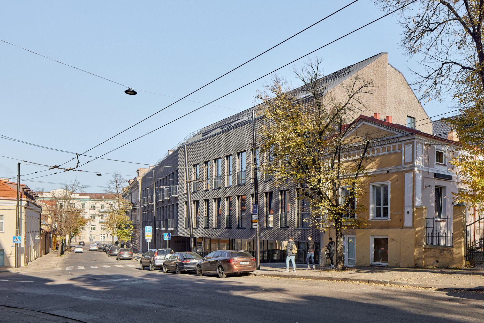 This façade material – brick – is typical of the old town and contextually fits in with the adjacent buildings. Also, the aim of this building was to maintain the gateway positioning of the buildings that once stood here at the bend of Sodų Street and to preserve the existing valuable 18th-century vaults underneath the building.