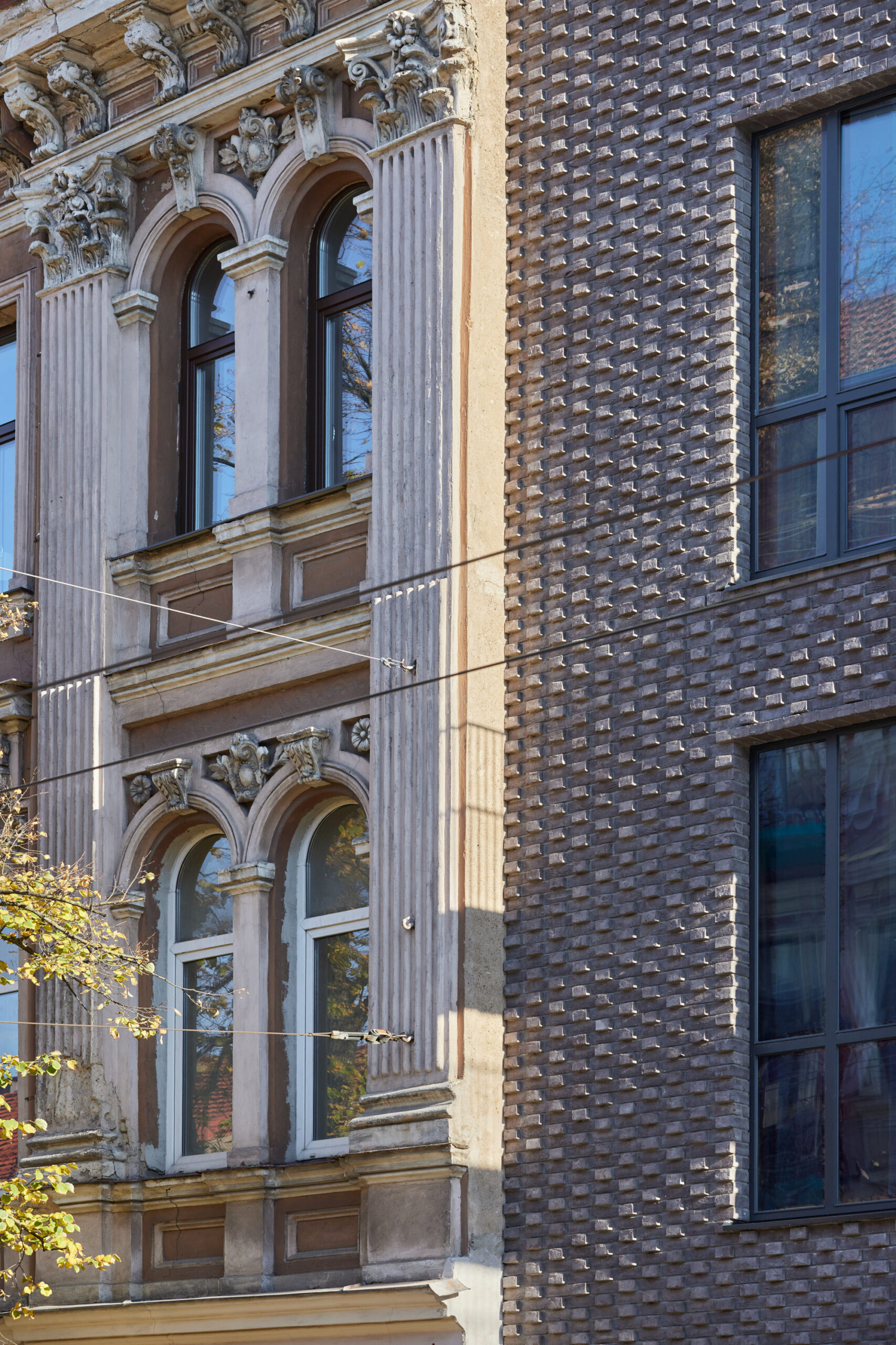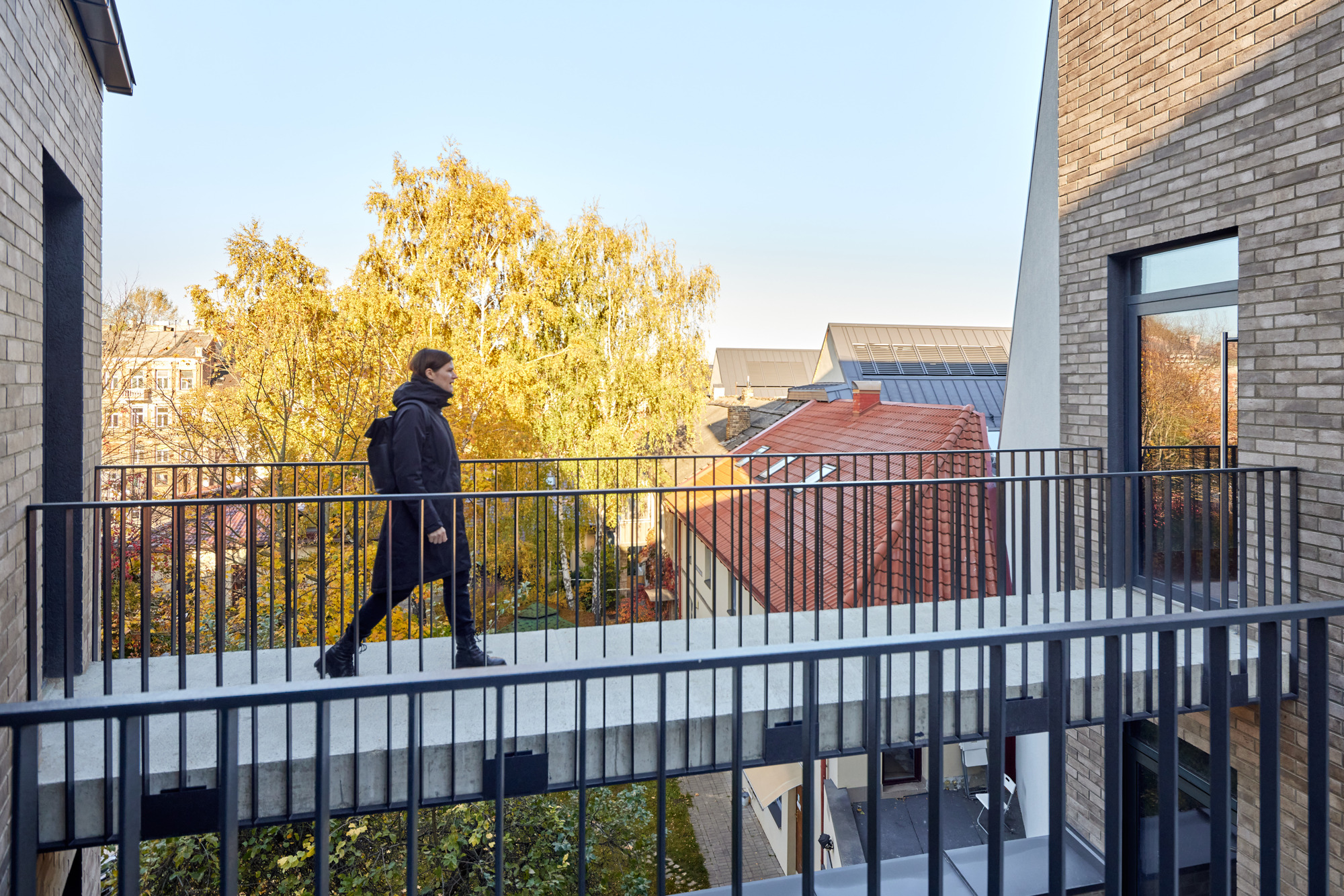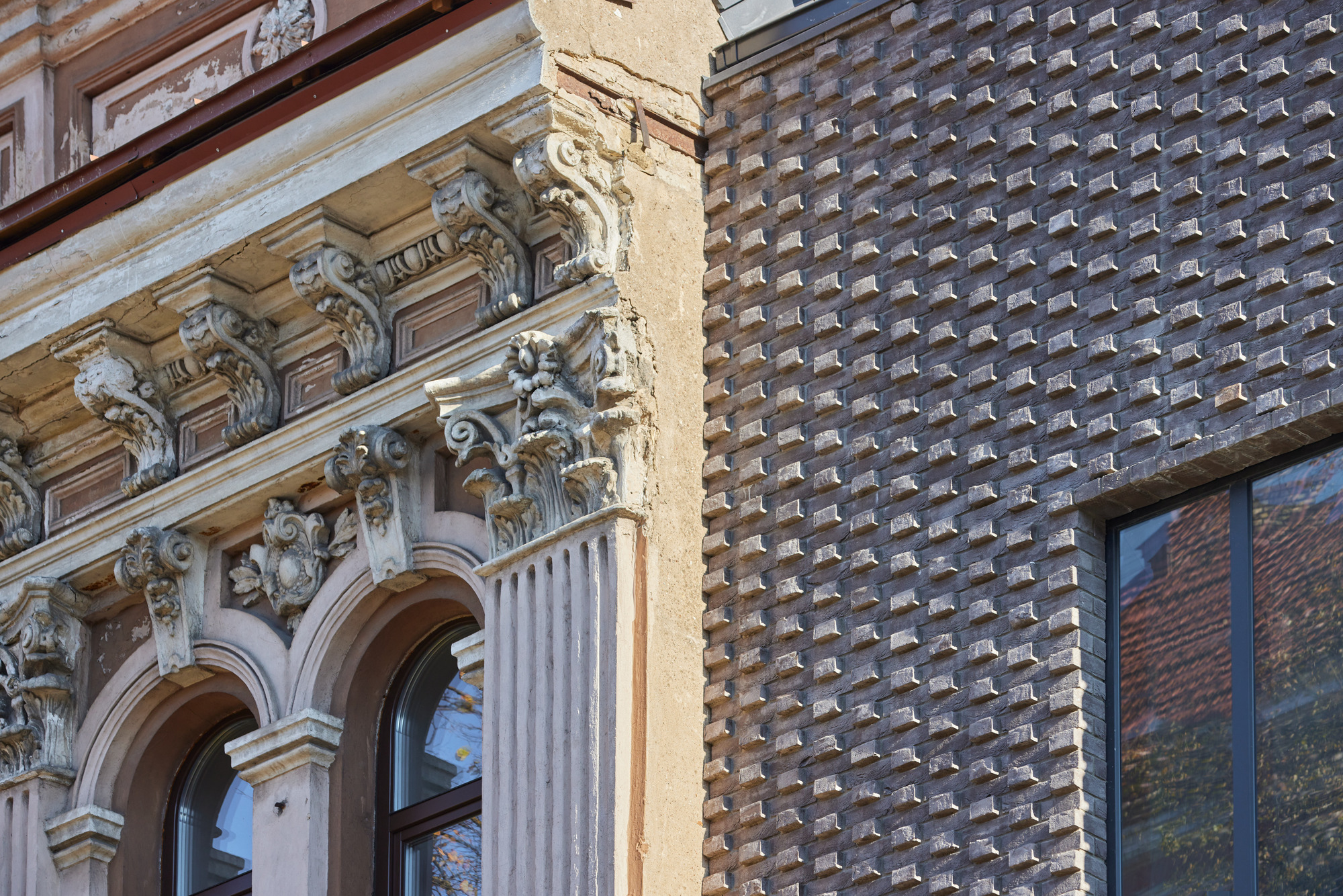 Due to the irregular shape of the site and the rising topography, the complex is divided into two courtyard terraces connected by a staircase. It is in this place that the value of cultural heritage has survived – the remnant of a secession fence. This fragment remains integrated into the new structure as an exhibit.