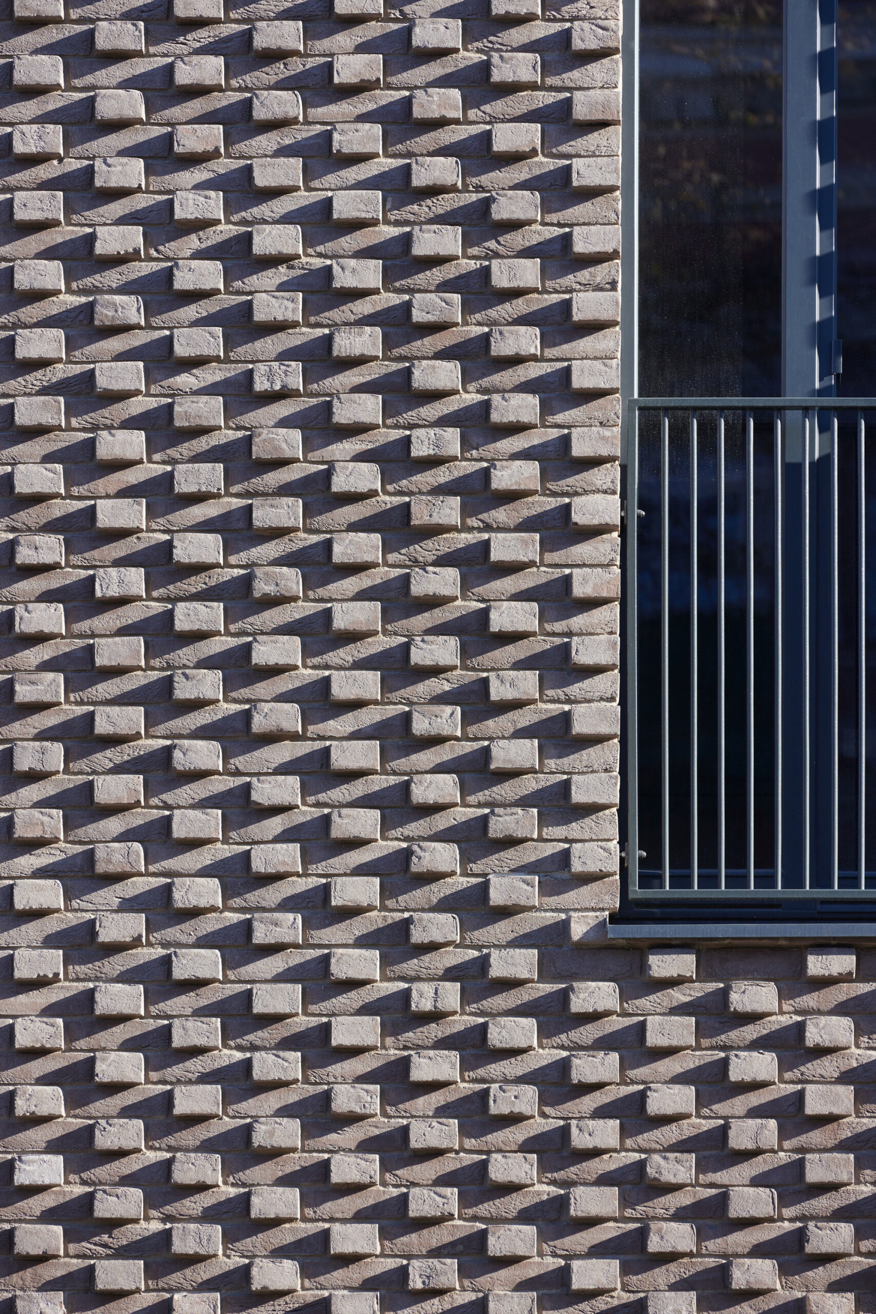 The building facing the street is like a gateway of the quarter, through which the residents of the complex enter the courtyard buildings. Thus, a pattern of perforated bricks with a specific shading effect was introduced to accent it.