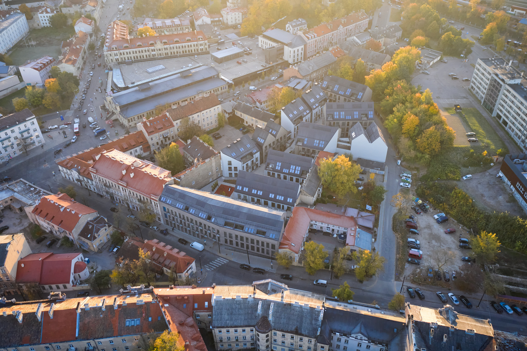 Sodu Street Apartments, The main idea of the multi-apartment building complex was to create a cozy, old-town essence possessing a structure with courtyard spaces and a perimeter of two to three-story buildings with an attic.