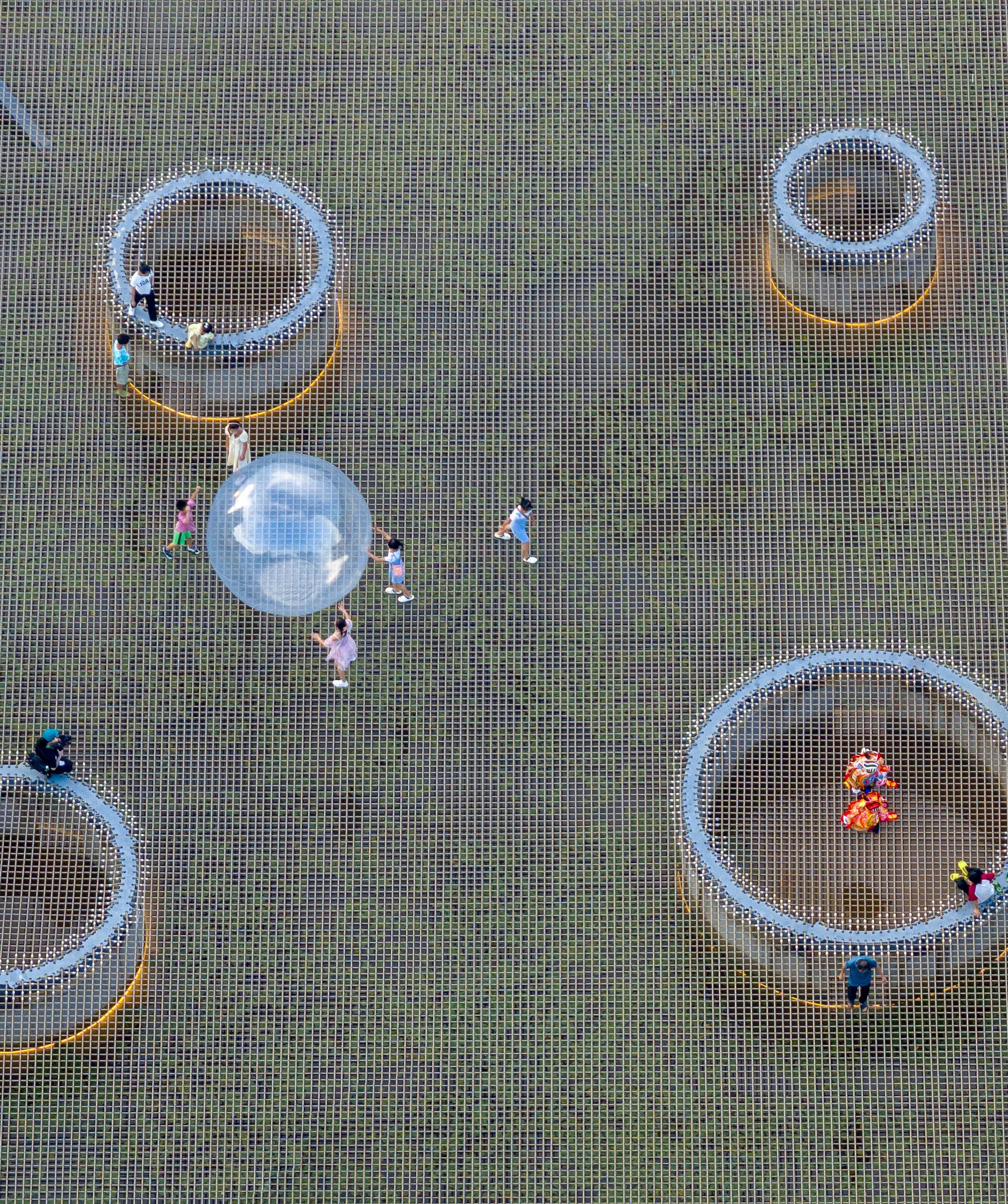 The rope mesh offers a serene spot for people to leisurely gaze at the vast sky, overlook the pond, and watch the swimming fish and blooming lotus flowers below. In the evening, they can wait for and appreciate the rising moon, its reflection shimmering on the serene water. To optimize the rope net’s structure and reduce costs, seven circular concrete supports were designed within the pond, shortening the net’s span. Additional steel supports around these concrete structures balance the horizontal tension exerted by the net on the pond’s edges. The net’s 120mm spacing in between ropes ensures safety and comfort for users of all ages. A secondary slender net beneath the main one prevents items from falling into the pond. Two openable entrances and exits set on the rope net facilitate daily maintenance. Despite the new rope net, the pond retains its function as a fish pond and its essential role in the village’s water system.