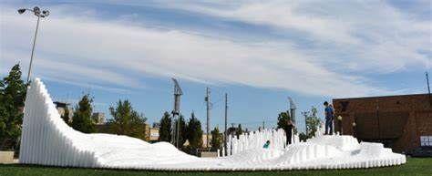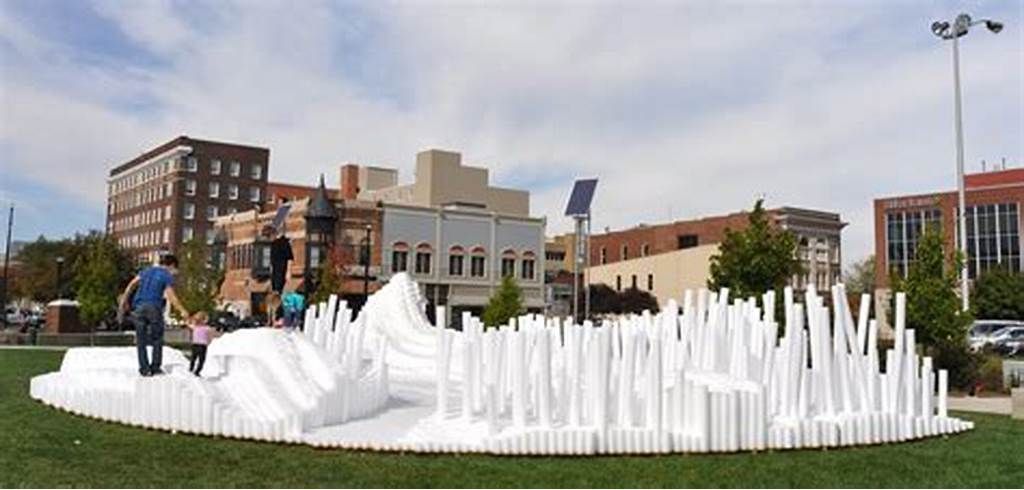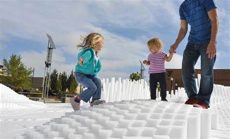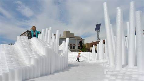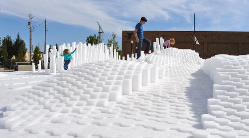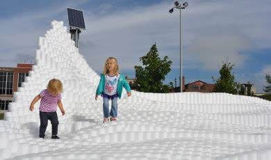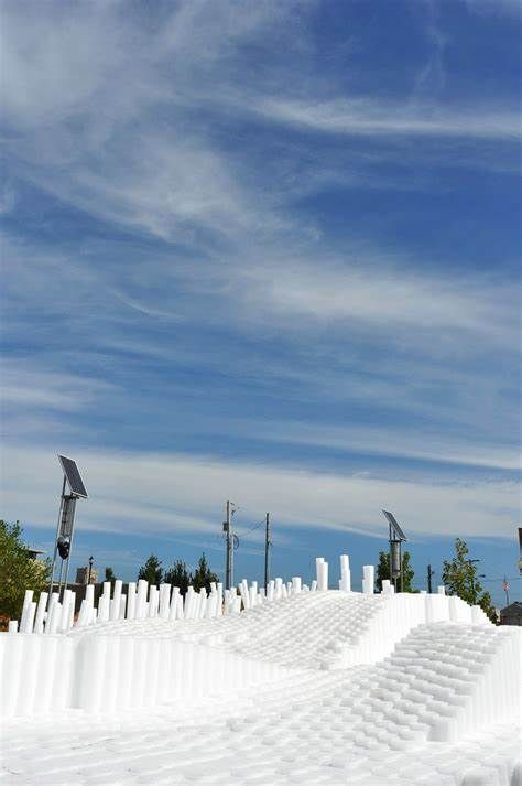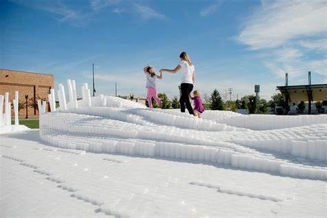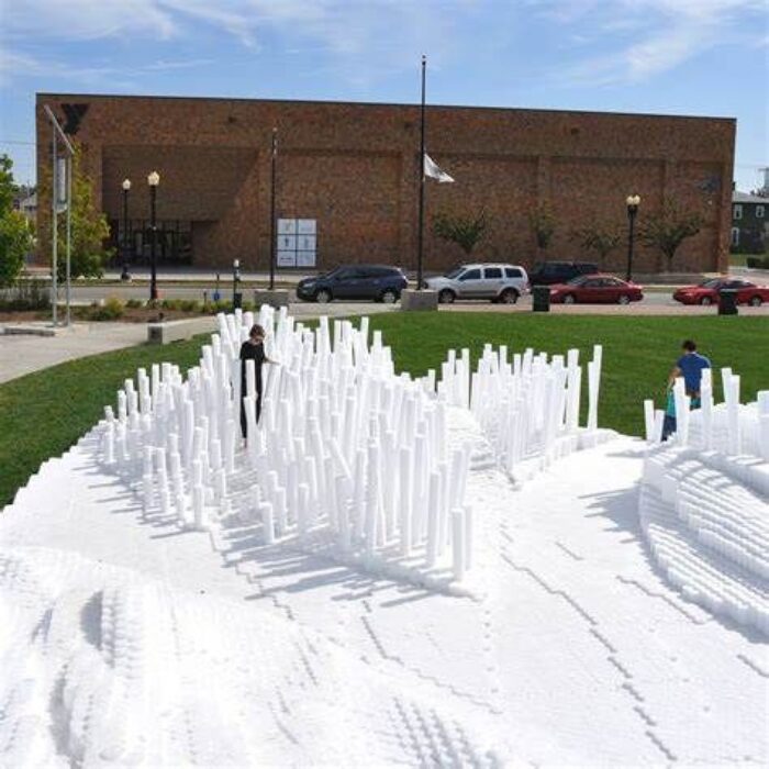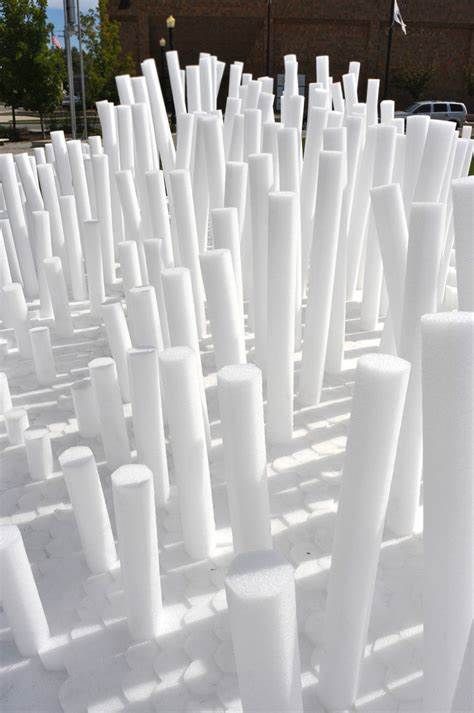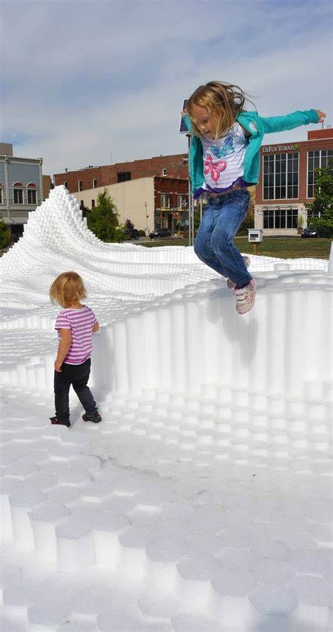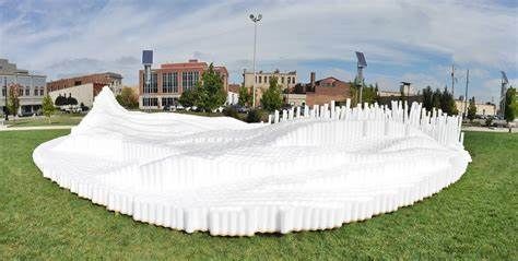 SoftMatter is a temporary active event space that encourages a wide demographic of users to interact with the installation. It is intended to invoke notions of playfulness and positive experiences for the users of Canan Commons in Downtown Muncie, IN. Our goal is for users to directly engage the project, allowing them to experience it spatially by walking around and through the cascading landscape. The piece does not have a single specific function, but rather it allows users to discover ways of interaction. Materially, we utilized over 20,000 custom made extruded polyethylene foam rods. They were cut to prescribed variable lengths to create the undulating surfaces and mounted to 150 structural wood decks. They are easily cleaned, durable, safe, cheap, lightweight, and can be manipulated into a variety of forms. The extrusions could be clustered, stacked, etc. to create many configuration options. Due to their low cost, we had the opportunity to aggregate them in large quantities to create a very impactful installation that can be engaged at multiple scales. Formally the large undulating landscape provides a variety of interaction zones. The project encourages climbing, jumping, running, while providing for ample seating and areas to relax. Its iconic presence in the space attracts all that see it. For special events, we envision an added component of lighting to be projected onto the installation. This could be an interactive scenario where lights are cast onto the surface reacting to users. We will be collaborating with a local organization to program this added component.