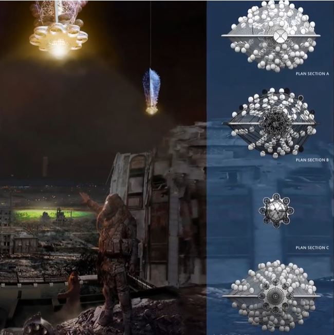 Based on these basic concepts, a scheme about SOLARIS has come out. To construct a complex as a huge refuge, like a self-operating machine serving all survival conditions. Its capabilities filter water and air, reallocate sunlight and transform solar energy for the center usage.