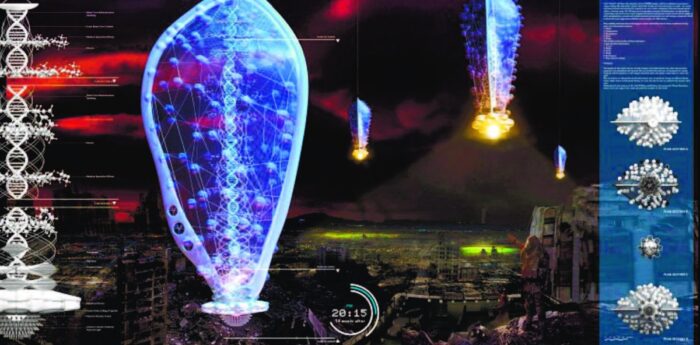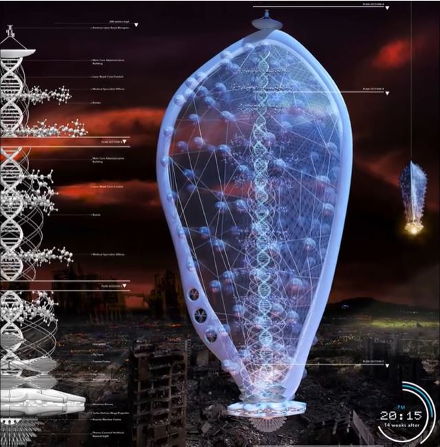 The architects were inspired by the shape of the DNA, bronchus, alveoli, and resembling a lungs and created a metaphoric structure extending from that idea. The result is a technological tree of life with seven spatial levels that slide up and down the centric tree, with the entire structure containing various functions. The building will provide to the habitants: