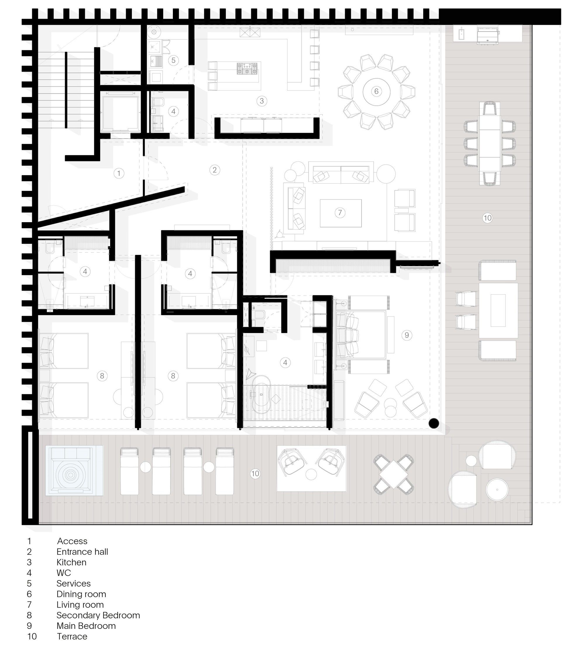 Given the slope, each terrace rises above the other in a stepped fashion, with south-facing façades meaning that all the spaces enjoy spectacular views of the sea. The amenities including swimming pools, beach club, sun loungers are located on the lowest level, by the beach.