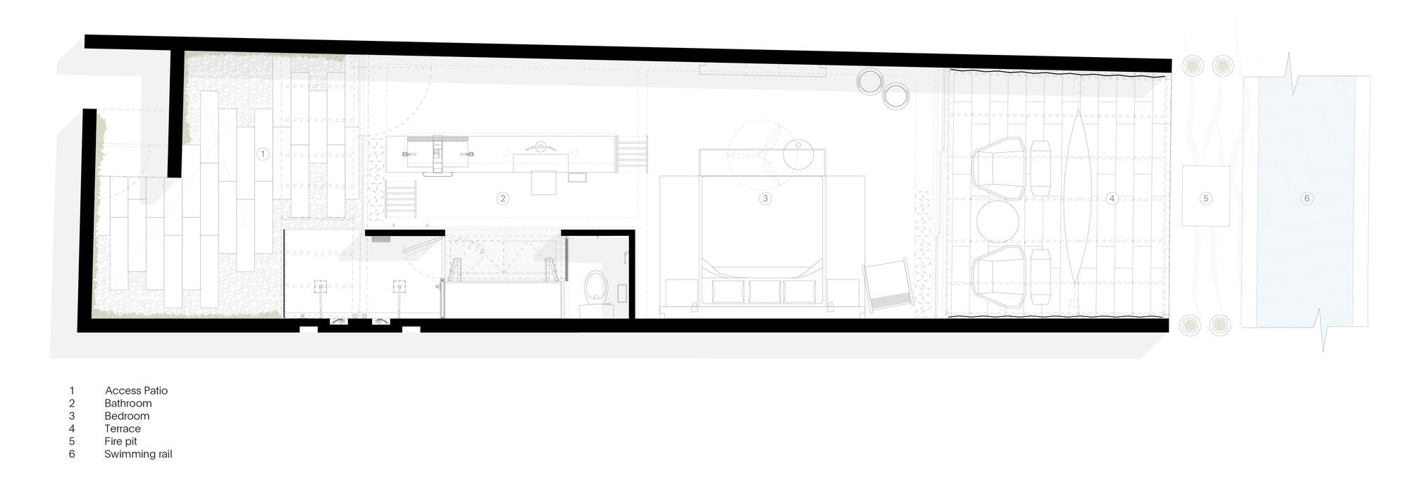The different typologies of this hotel’s suites and rooms emerge from the topography that merges harmoniously with the sandy beach. To reach them, a courtyard-lobby serves as both entryway and bridge between the topographic undulations of the exterior and the welcoming geometry of the interior.