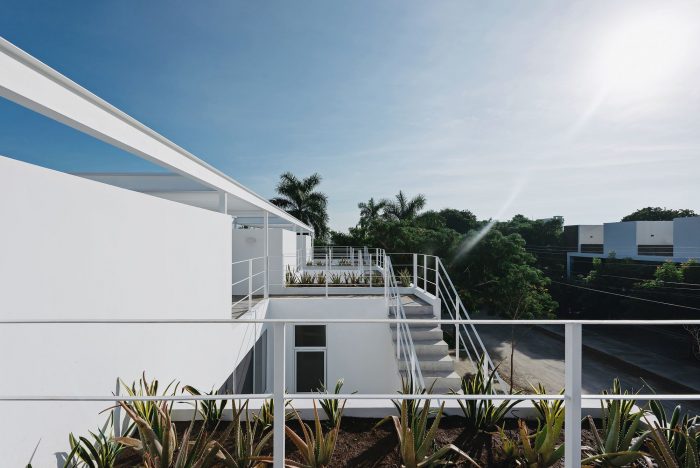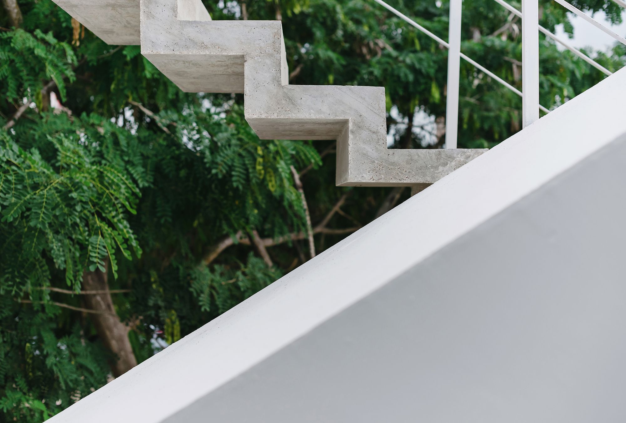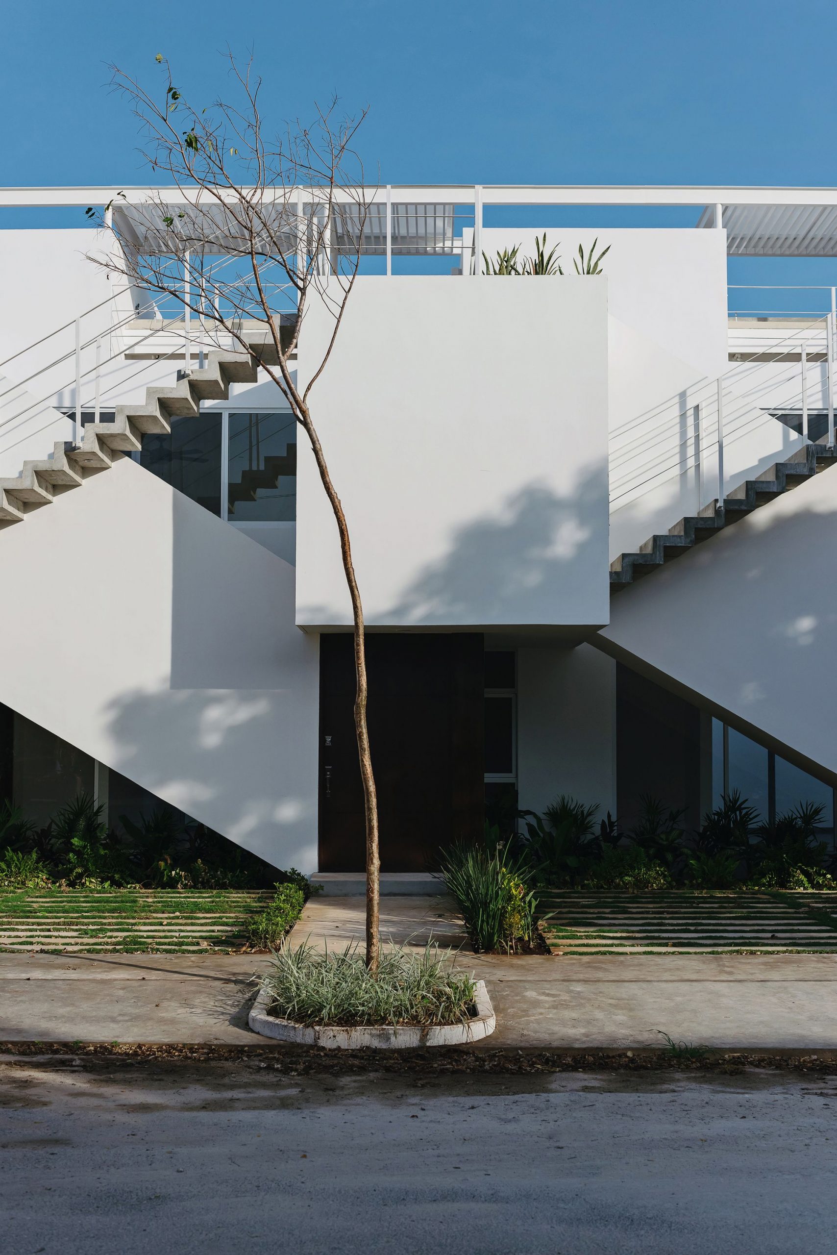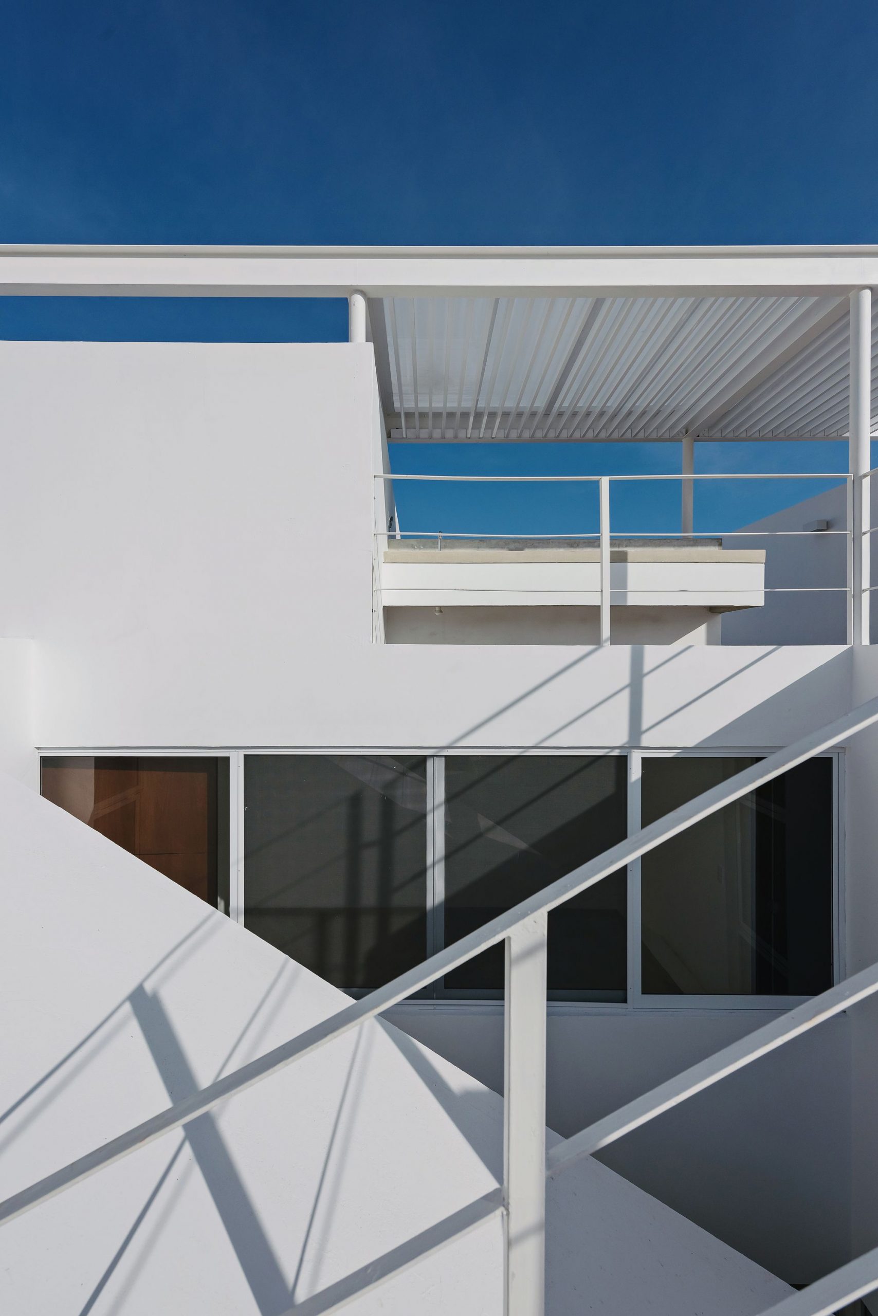 Designed by Arkham Projects, The solution was to remove vertical circulations from the inside, and the result was an intersection of two staircases, one closed and one open, which give the project a playful minimalism, but not in the plastic sense, but economic, taking the words of the client as a basis for the design. A façade with program, essential for the project, a façade that cannot be removed, with horizontal repetitions, which simplify the whole when seeing it in its entirety. The white color works as the guideline, as a integrator, leaving the sun to be the protagonist while painting the façade with light, turning the project into a canvas where the shadows can be seen in different forms throughout the day.