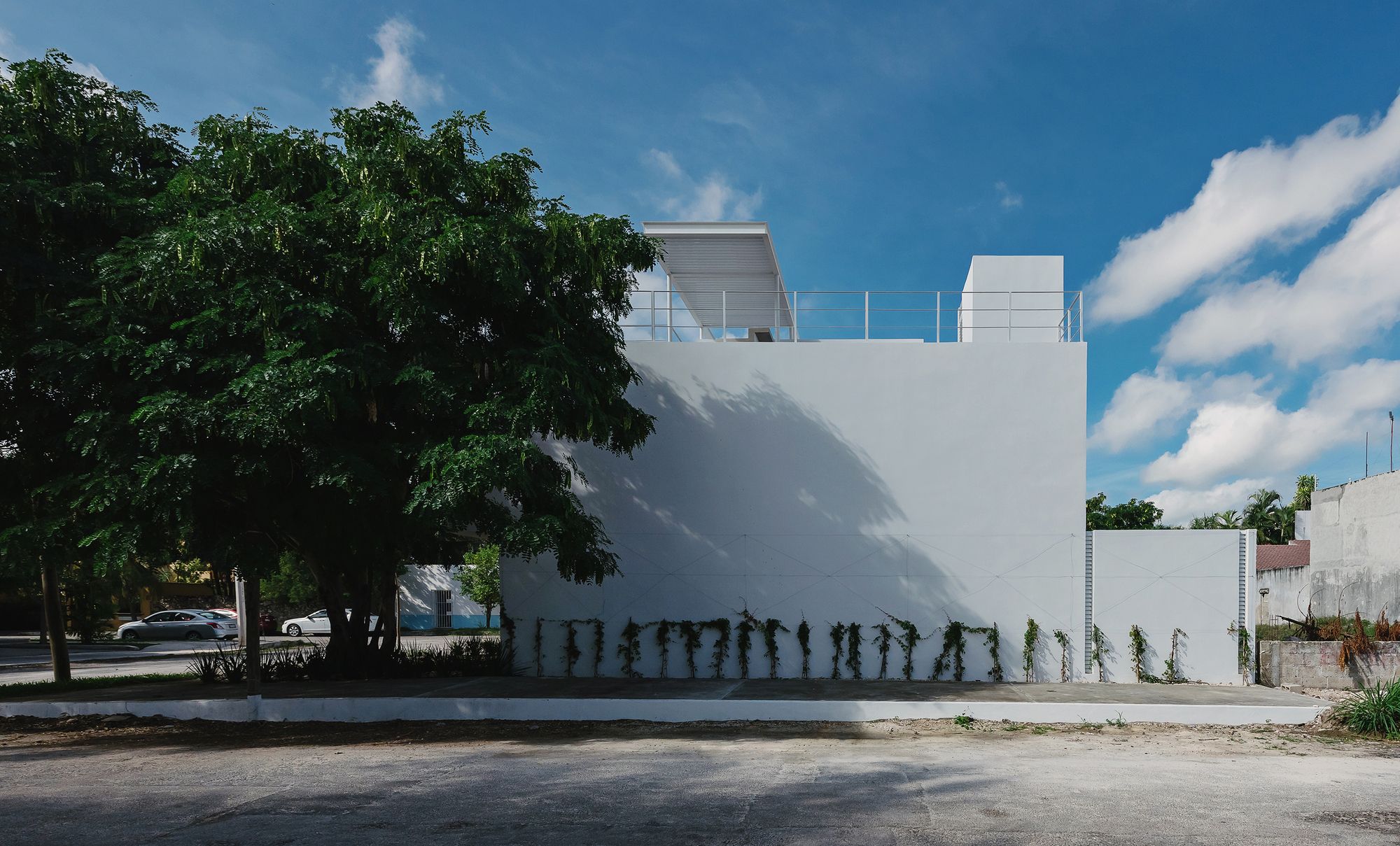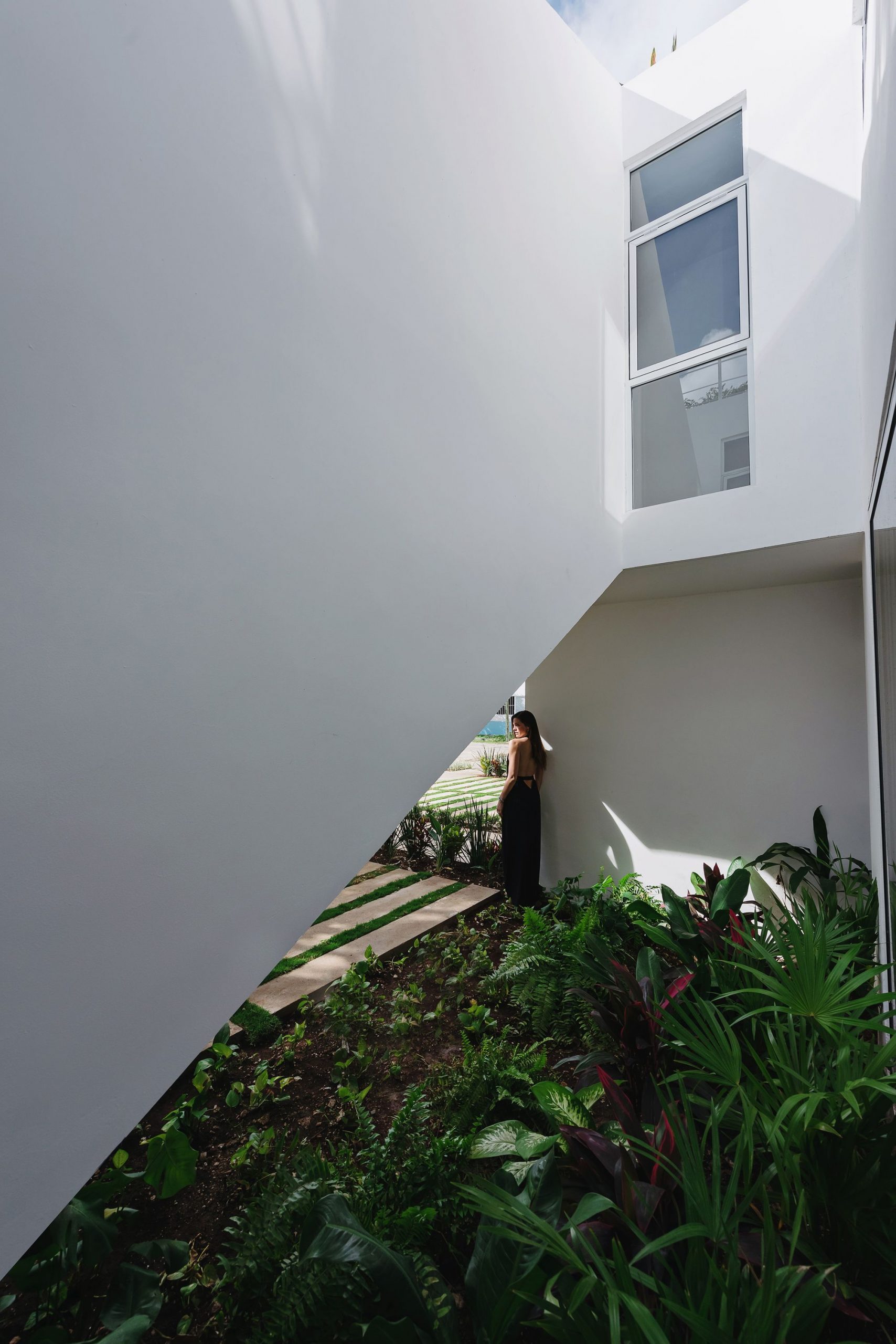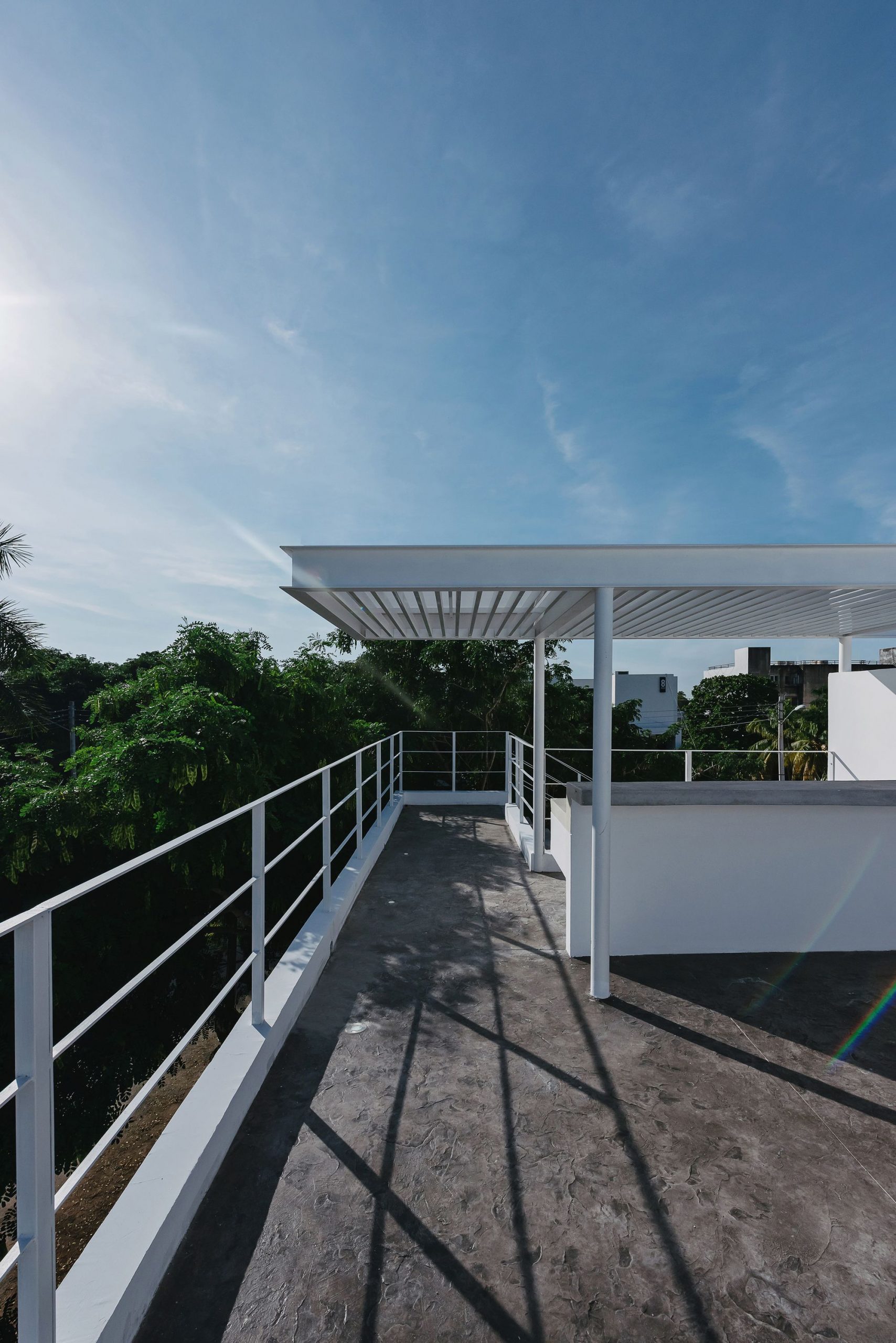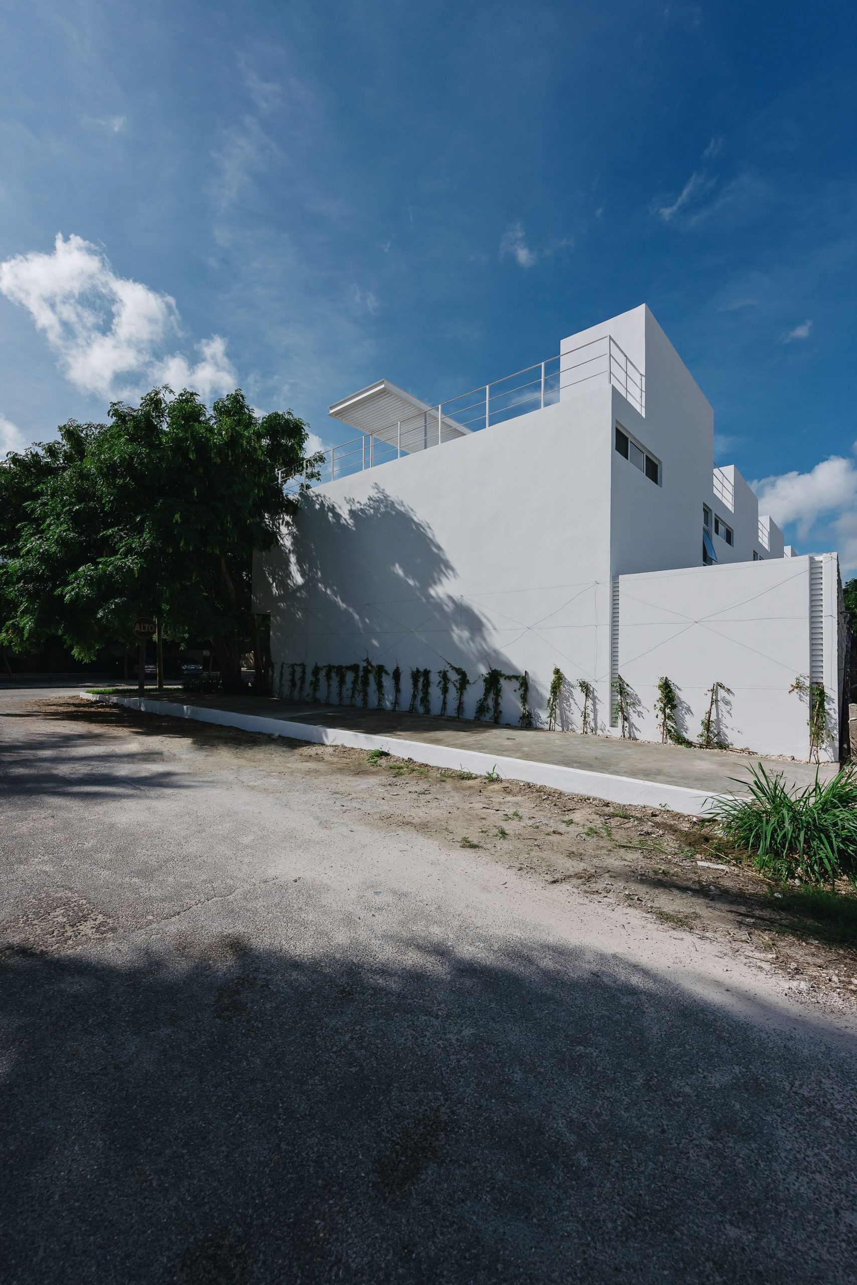 Designed by Arkham Projects, The solution was to remove vertical circulations from the inside, and the result was an intersection of two staircases, one closed and one open, which give the project a playful minimalism, but not in the plastic sense, but economic, taking the words of the client as a basis for the design. A façade with program, essential for the project, a façade that cannot be removed, with horizontal repetitions, which simplify the whole when seeing it in its entirety. The white color works as the guideline, as a integrator, leaving the sun to be the protagonist while painting the façade with light, turning the project into a canvas where the shadows can be seen in different forms throughout the day.