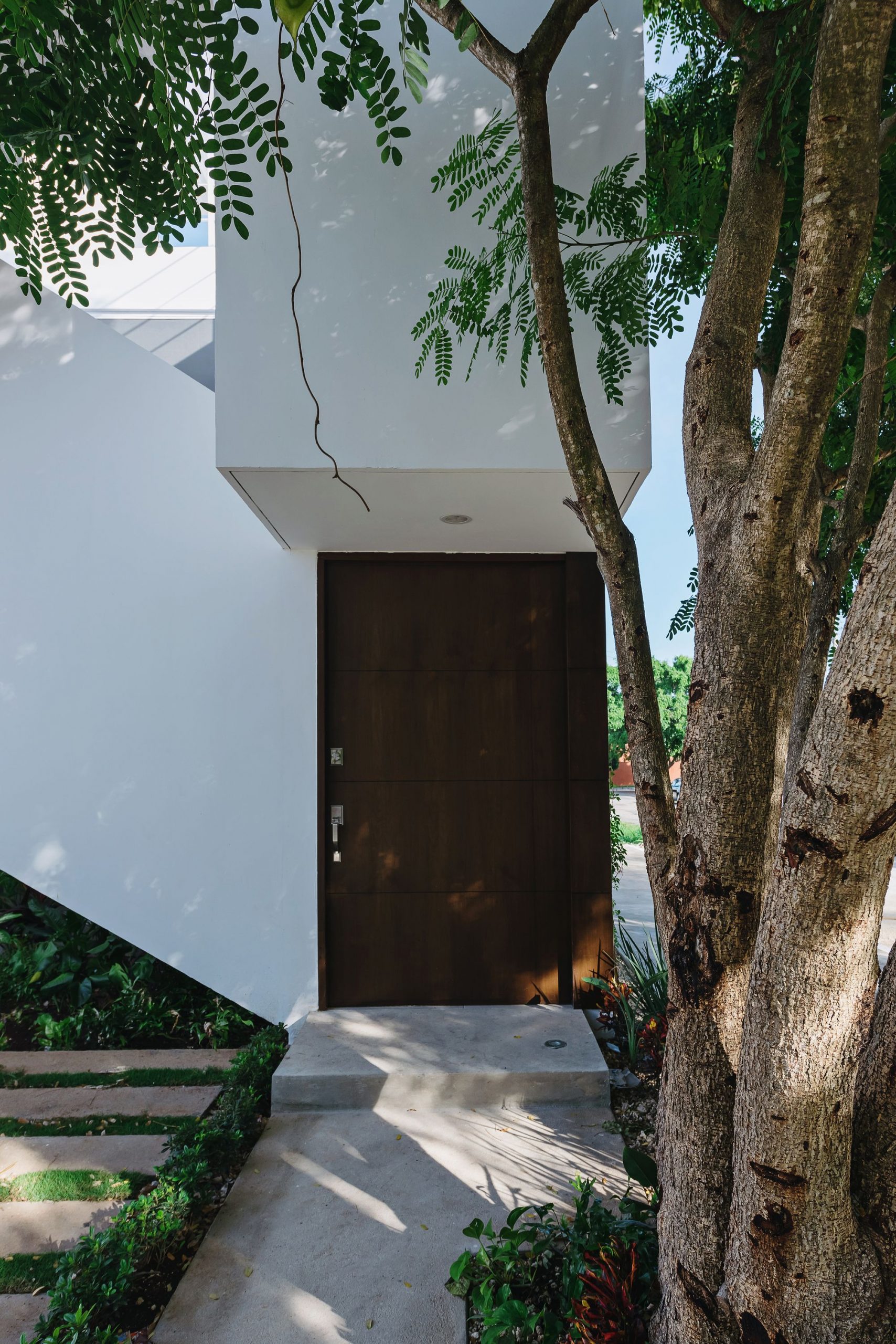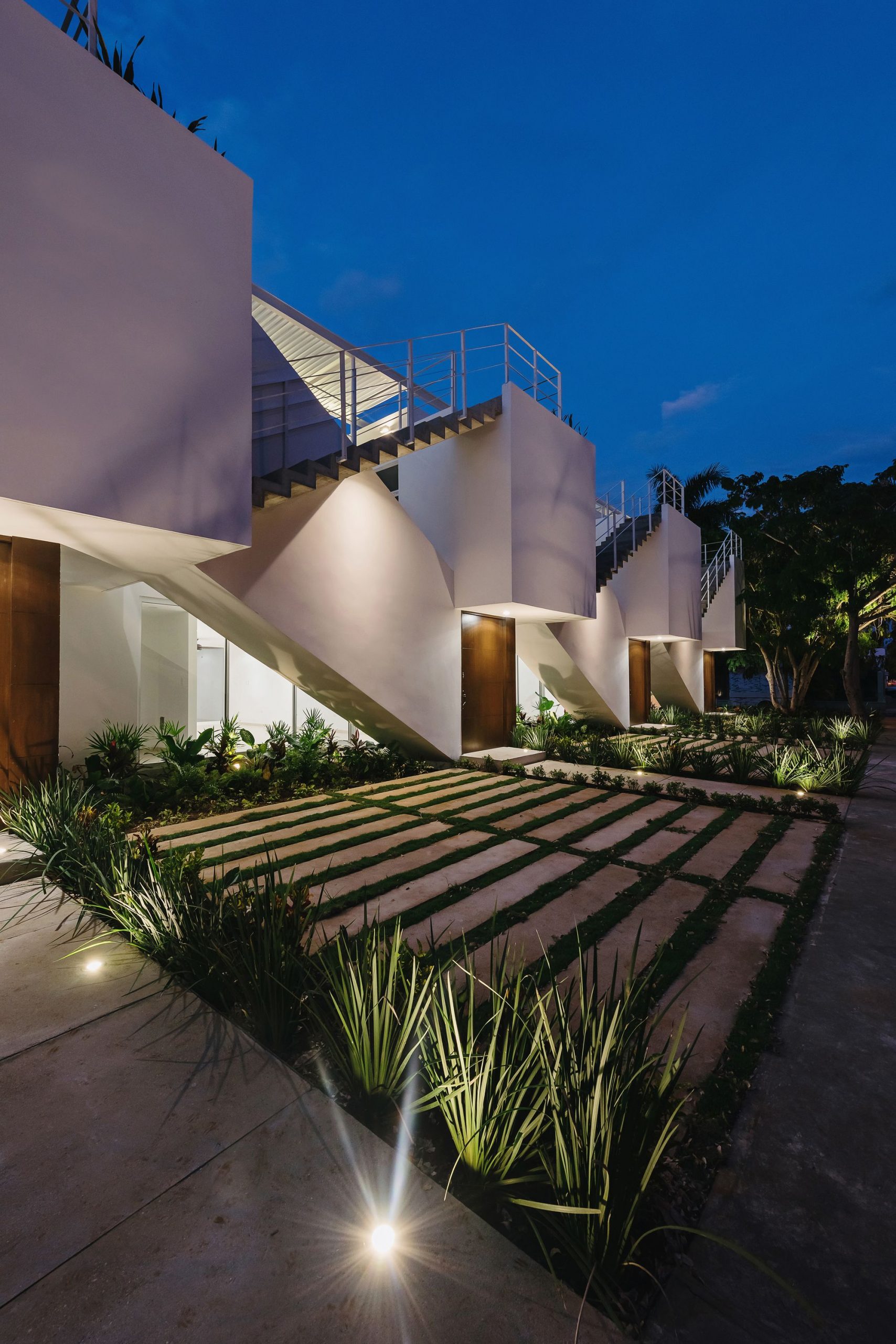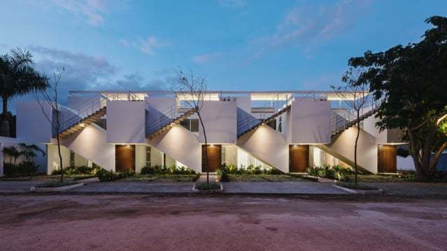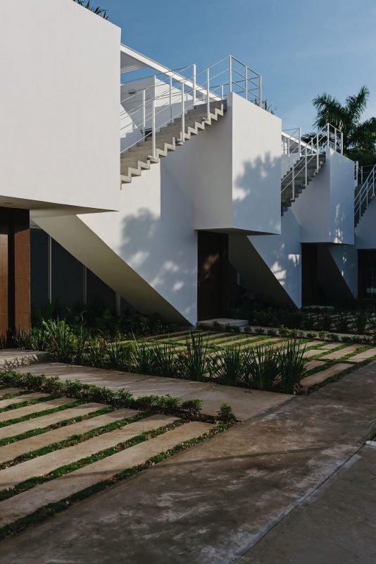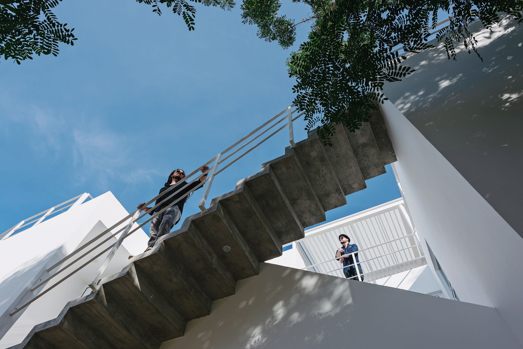 Designed by Arkham Projects, The solution was to remove vertical circulations from the inside, and the result was an intersection of two staircases, one closed and one open, which give the project a playful minimalism, but not in the plastic sense, but economic, taking the words of the client as a basis for the design. A façade with program, essential for the project, a façade that cannot be removed, with horizontal repetitions, which simplify the whole when seeing it in its entirety. The white color works as the guideline, as a integrator, leaving the sun to be the protagonist while painting the façade with light, turning the project into a canvas where the shadows can be seen in different forms throughout the day.