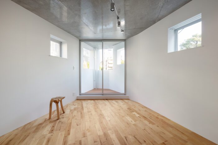 Given the small size of the site, there was no room for an elevator, so the entrance to the top-floor apartment was placed on the fourth floor, the highest point that could be reached by stairs, and the fourth and fifth floors were connected to create a duplex apartment. The interior space, which has been cut away diagonally both in plan and section, has a small volume but has a certain sense of distance within it, resulting in a dwelling unit with an unusual sense of space.