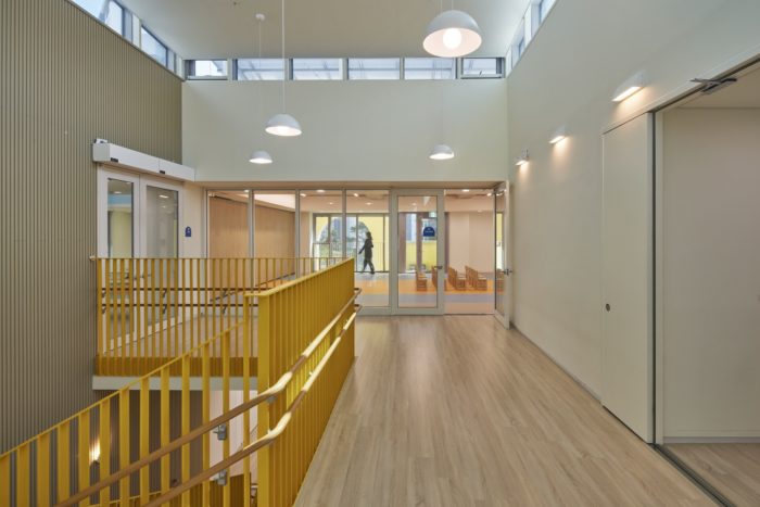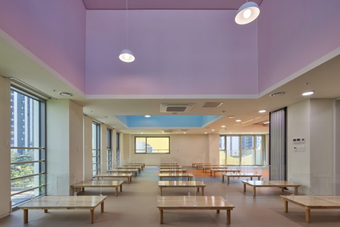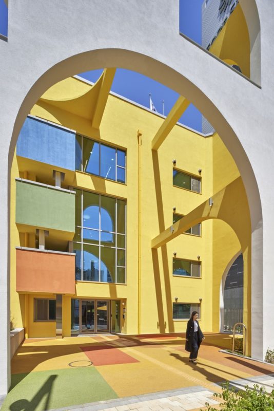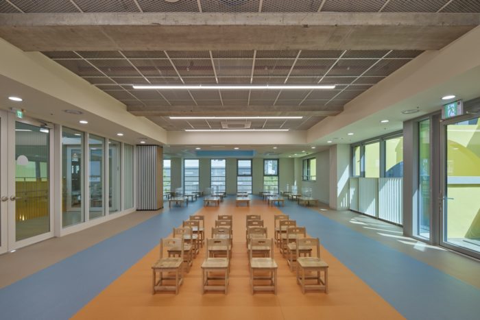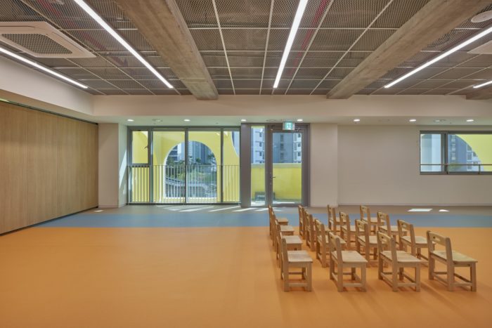 Songpa Wirye Kindergarten’s front enclosure is integrated with its exterior walls, creating a porous box that forms an interesting façade along the front street. This façade not only provides an intriguing view from the outside but also enhances the depth and permeability of space. From the inside, there are multiple visual frames to enjoy, thanks to the shifting shadows and saturated inner colors that change with the sun’s movement. Both children and adults are curious about these features. Interestingly, the local SNS community has nicknamed the building “Jerry’s Cheese Building,” comparing it to the cheese enjoyed by Jerry in Tom and Jerry. While it may seem like a silly name for a public educational building, it also reflects the kindergarten’s strong and familiar presence in the community.