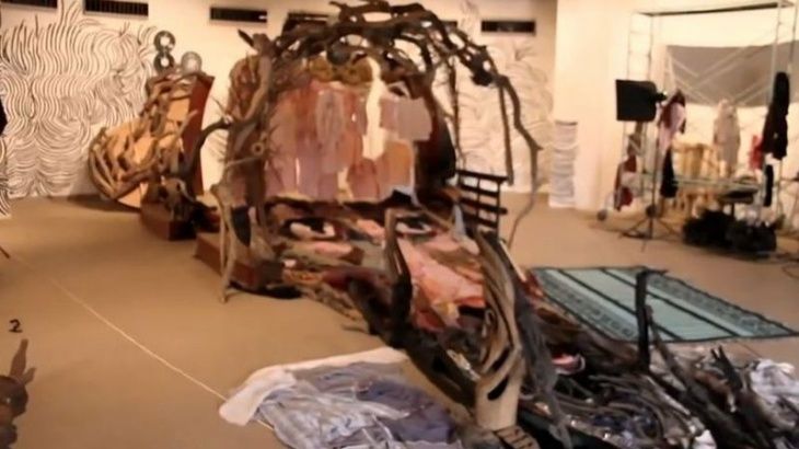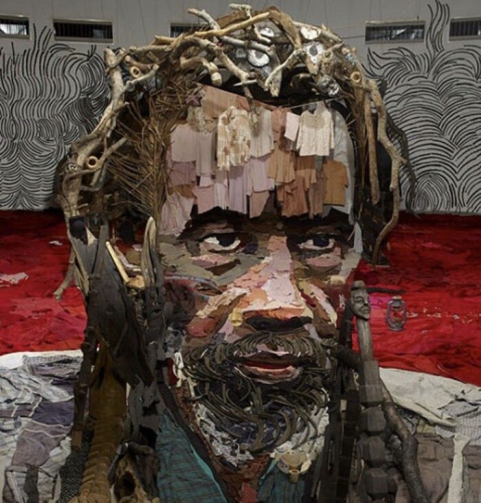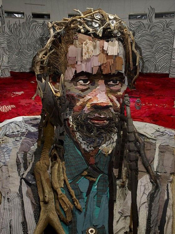 This, his latest piece titled Sotigui Kouyaté, is created from objects found around the assembly site. The many items include paint, wood (worked and raw from the tree), rubber, clothes, knic-knacs, pottery… the list goes on. The work gains real depth of concept when one takes into account the piece’s use of both floor and back wall. Found art may seem thrown together, but only the great ones look like the artist’s got perfect aim. Currently, Pras is showing at MazelGalerie in Brussels, Belgium.