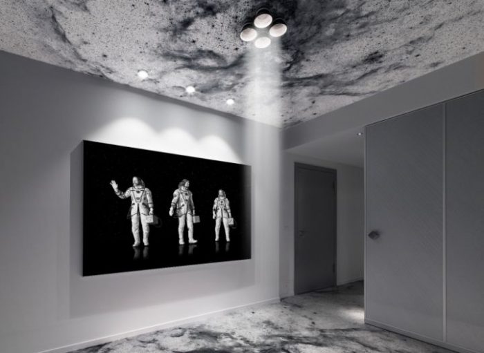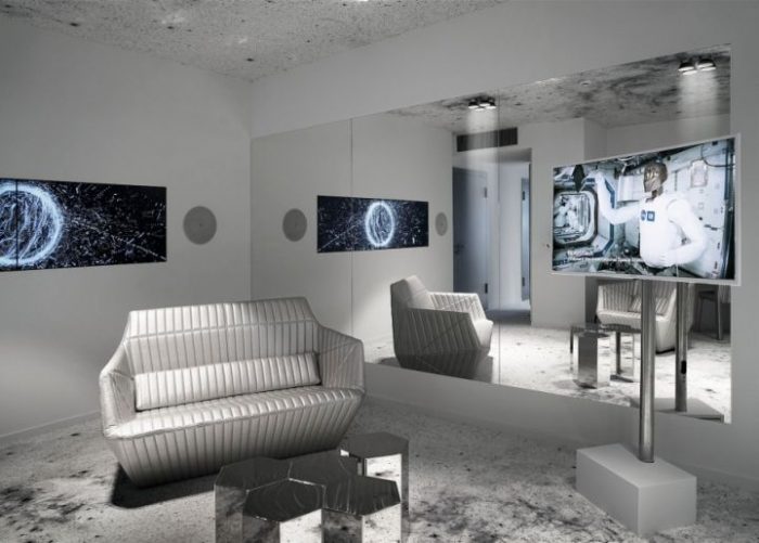 Tiny details like the space glove mounted to the wall where guests can keep their phones,wallets and keys, or ceiling lights that resemble rocket engines, further add to the immersive environment created inside the suite.