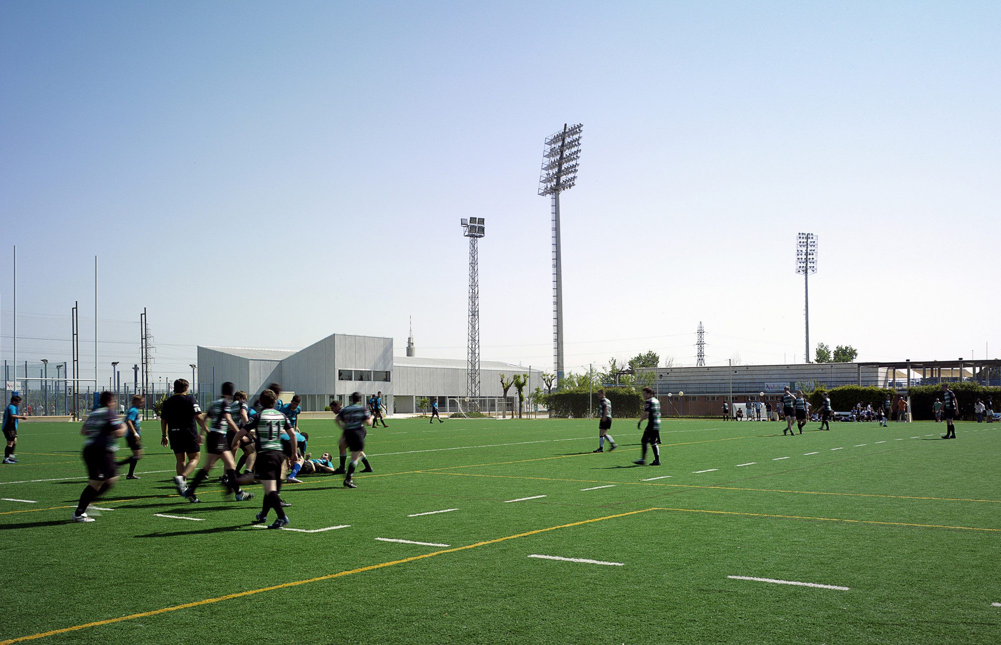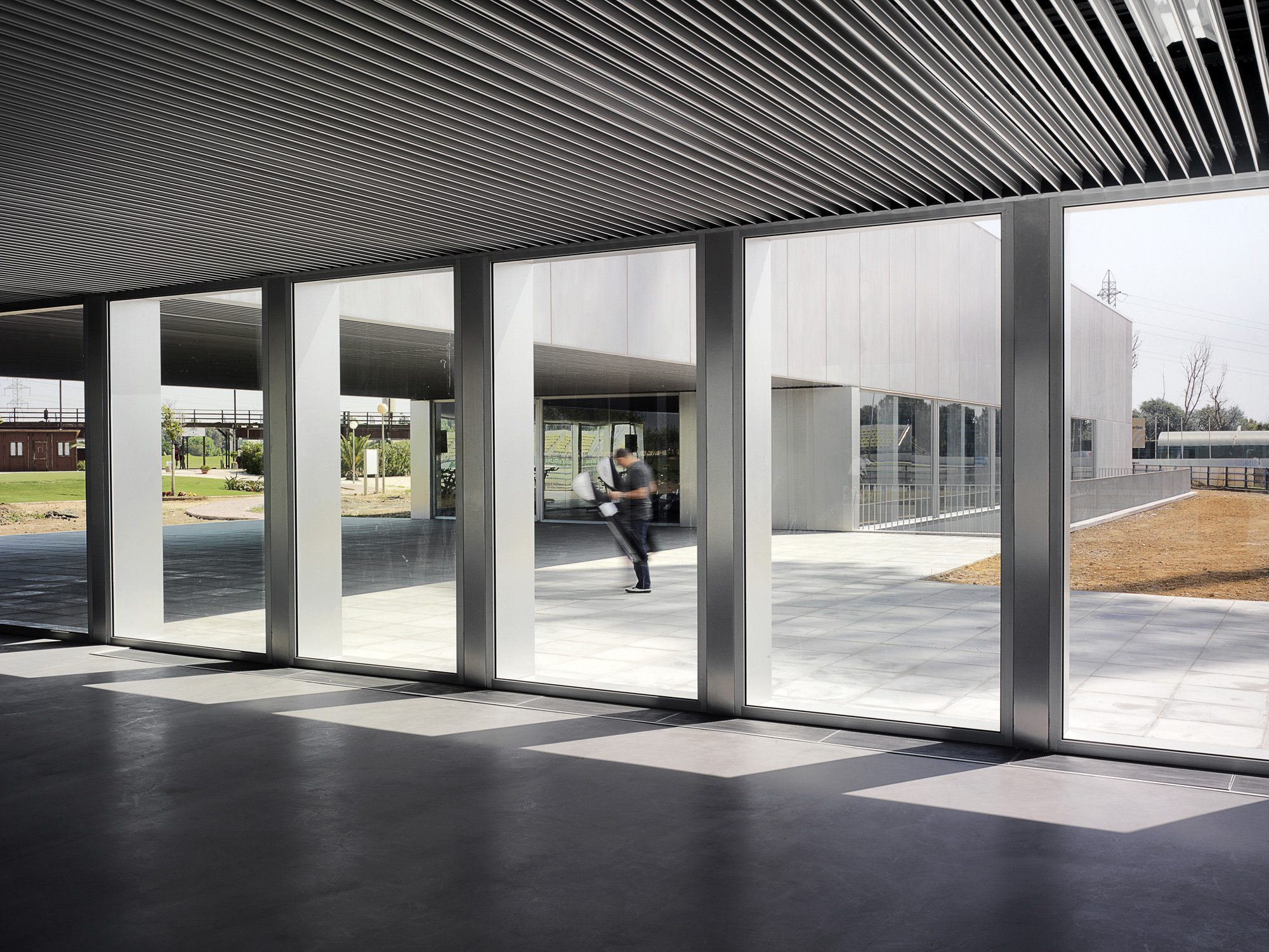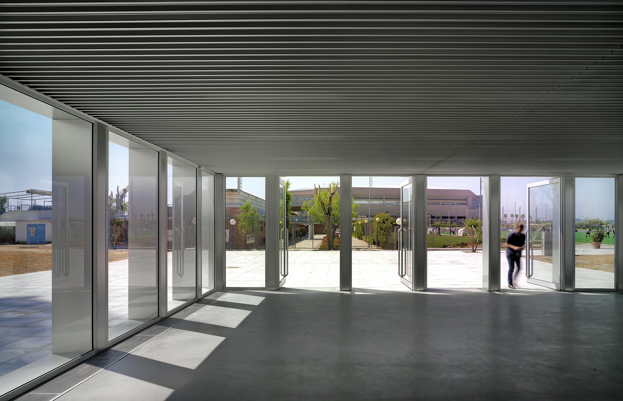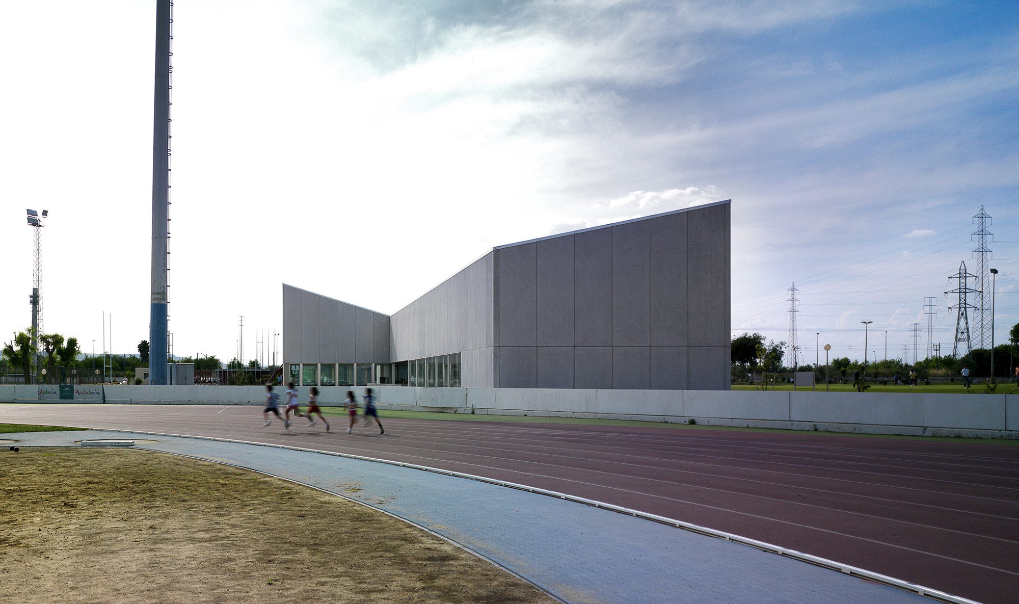 Sports Facilities in Island of Cartuaja is a supporting building for expanding sports facilities located in Island of Cartuja. The new facility, designed to accommodate new changing rooms, gym, cafeteria, restaurant and social club, aims to organize and characterize the whole complex, as a hinge element between the different programs of the complex.