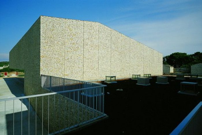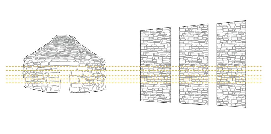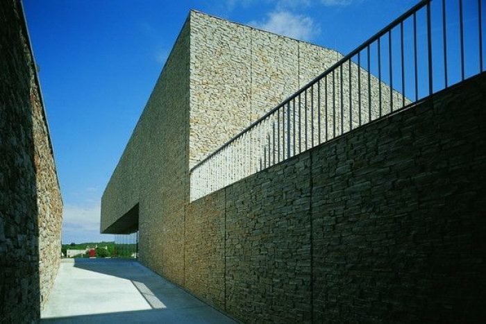 It was desired for the Hall to be completed in only 11 months and as such is constructed predominantly from prefab components- this is evidenced by the strong course lines revealing the unit of modularity used. The surface of these prefab units is finished in local stone, drawing inspiration from a local traditional dwelling, the kažun.