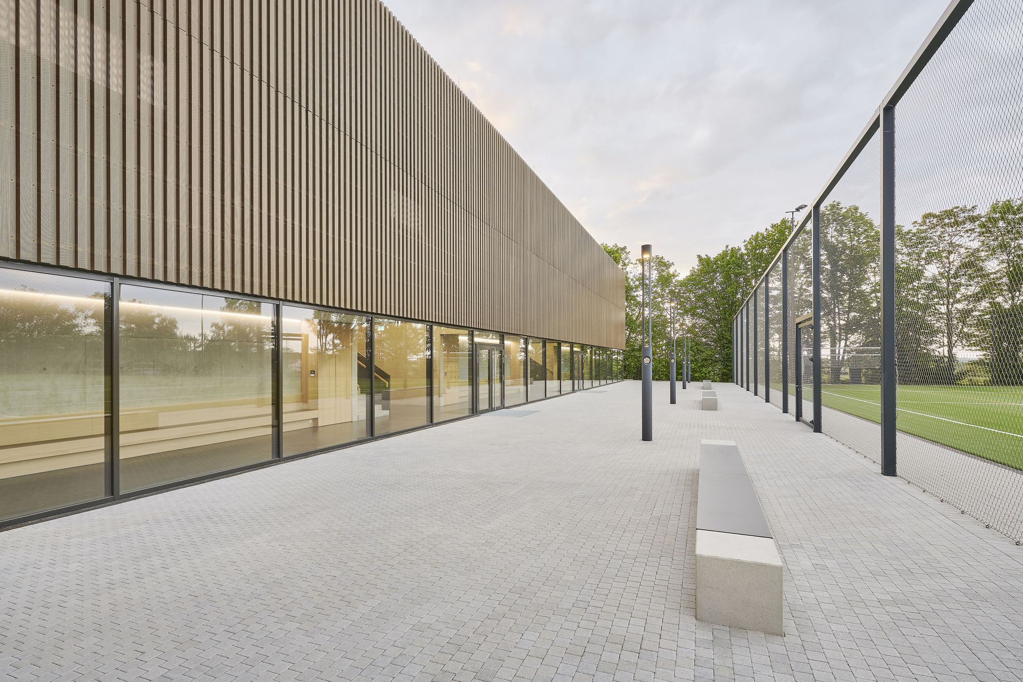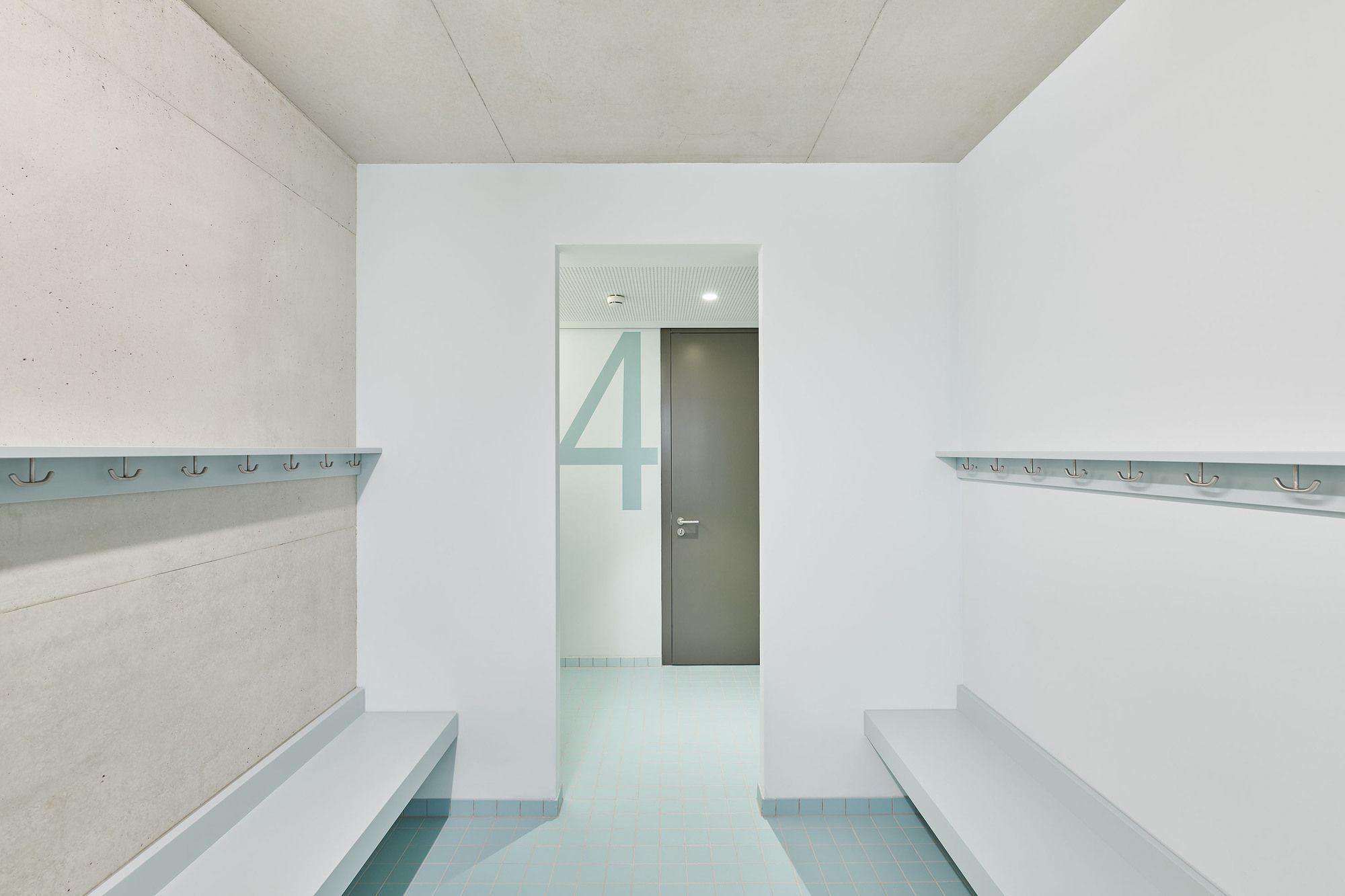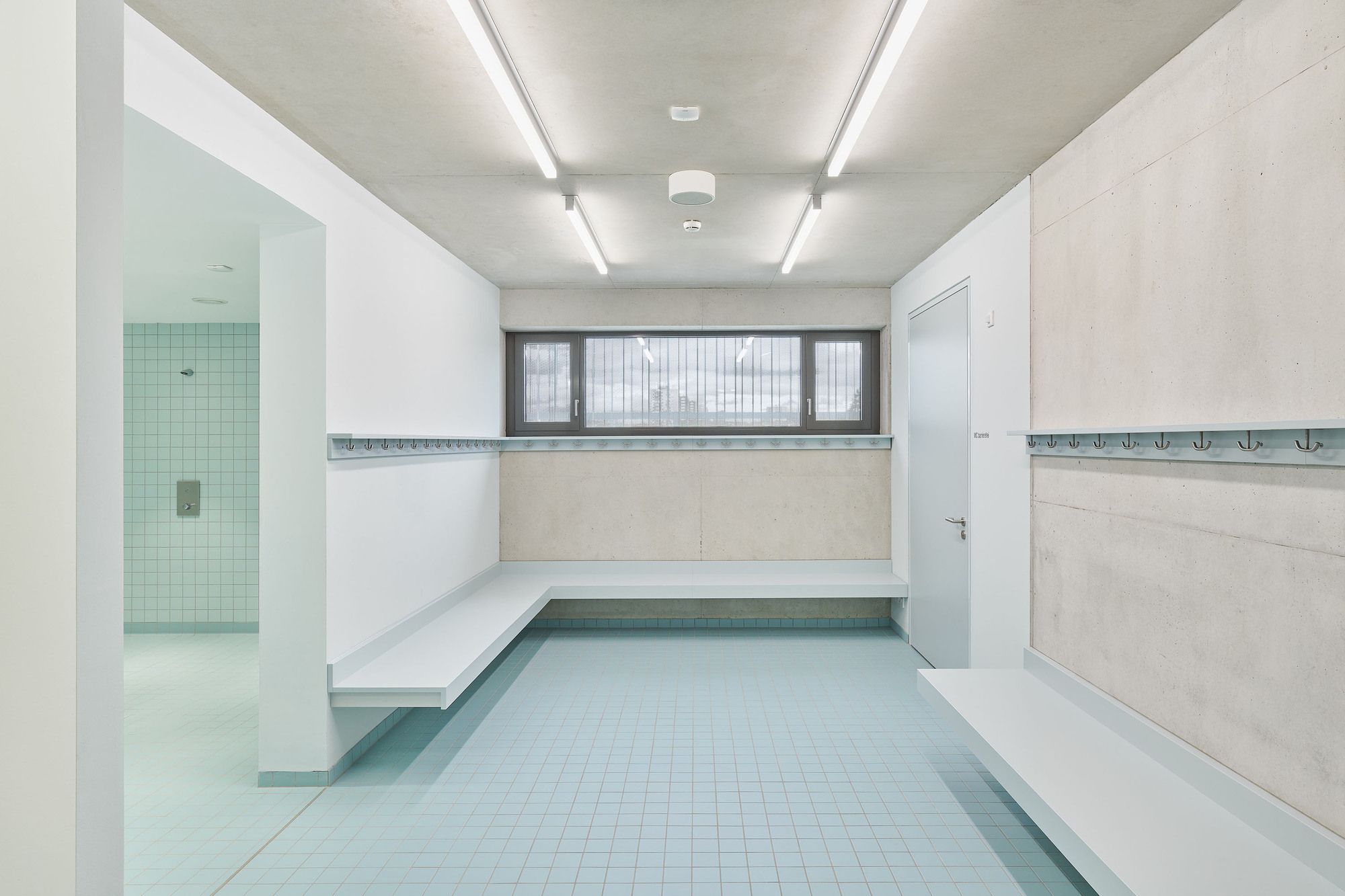 Through the enormous, flush windows, the view of the outdoor sports grounds expands, while chairs both inside and outside provide space for observing or waiting. A few selected elements contrast here, as they do throughout the hall interior: the light spruce wood (here: of the lockers), the anthracite mastic asphalt, and the concrete of the walls and stairs leading to the higher floor.