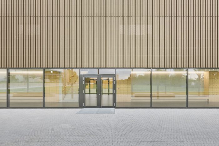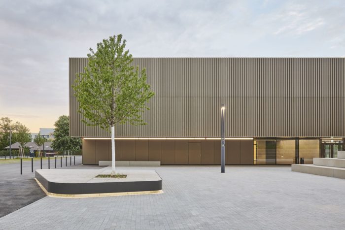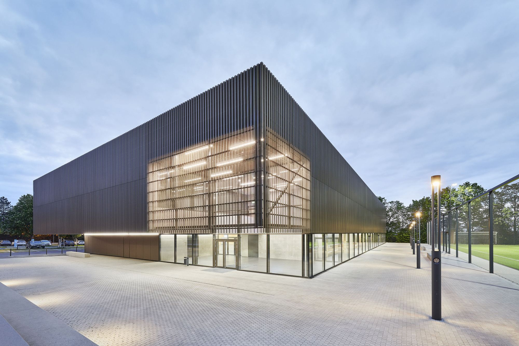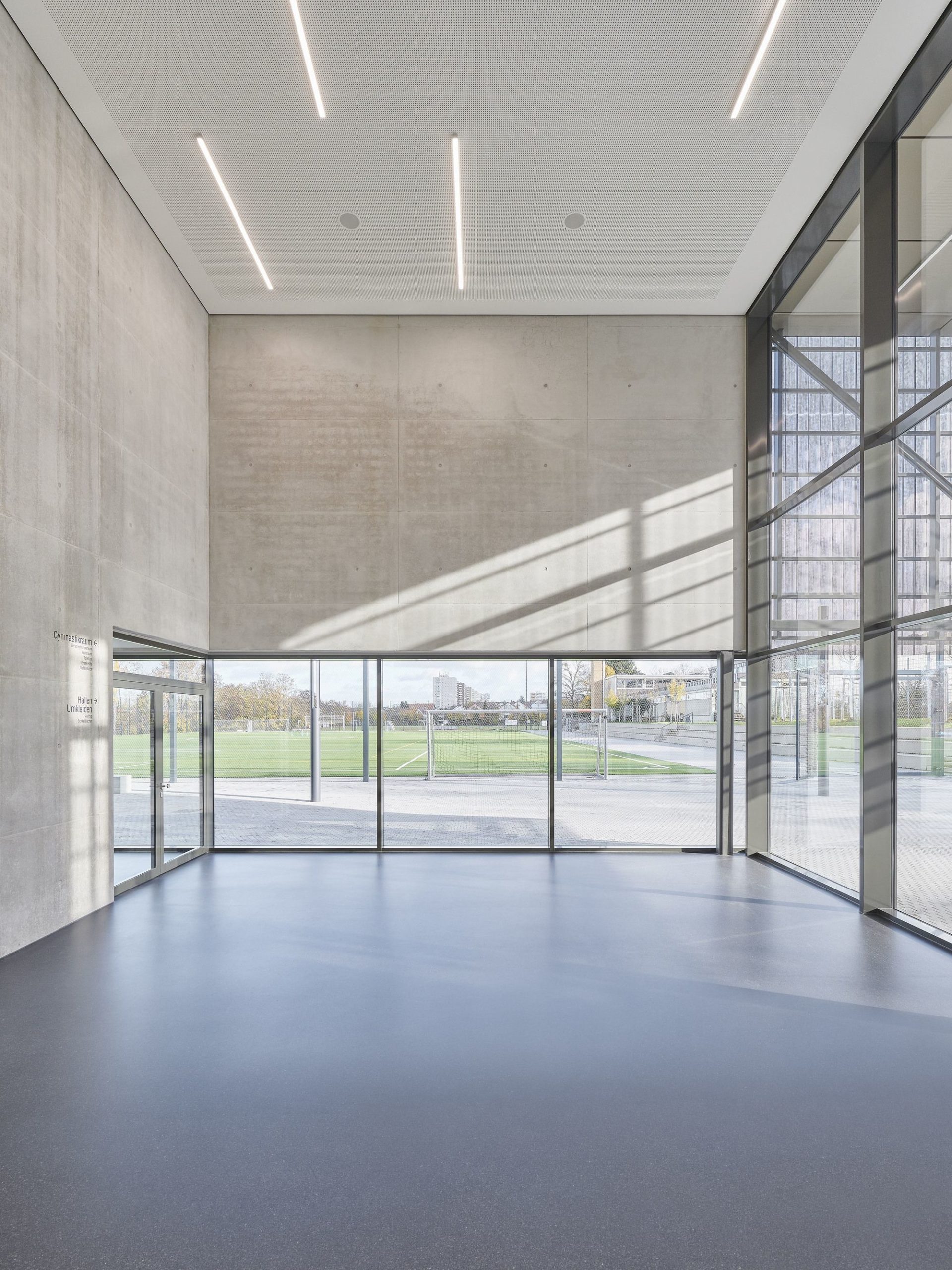 Sporting events with tree-climbing. Gerlingen’s new Sports Hall in den Breitwiesen. Even from afar, the cubic structure impresses with its simplicity and understated elegance: The new sports hall in Gerlingen is an attractive forerunner to the Breitwiesen Stadion with a front of perforated, fine trapezoidal sheet and circumferential windows. The building is directly connected to the existing outdoor sports complex as well as the new “Sportlerboulevard” (Athletes’ Boulevard) running along the playing field, which creates a link to the adjoining school’s stands and schoolyard. As a result, the hall merges seamlessly with both the natural landscape and the adjacent structures.