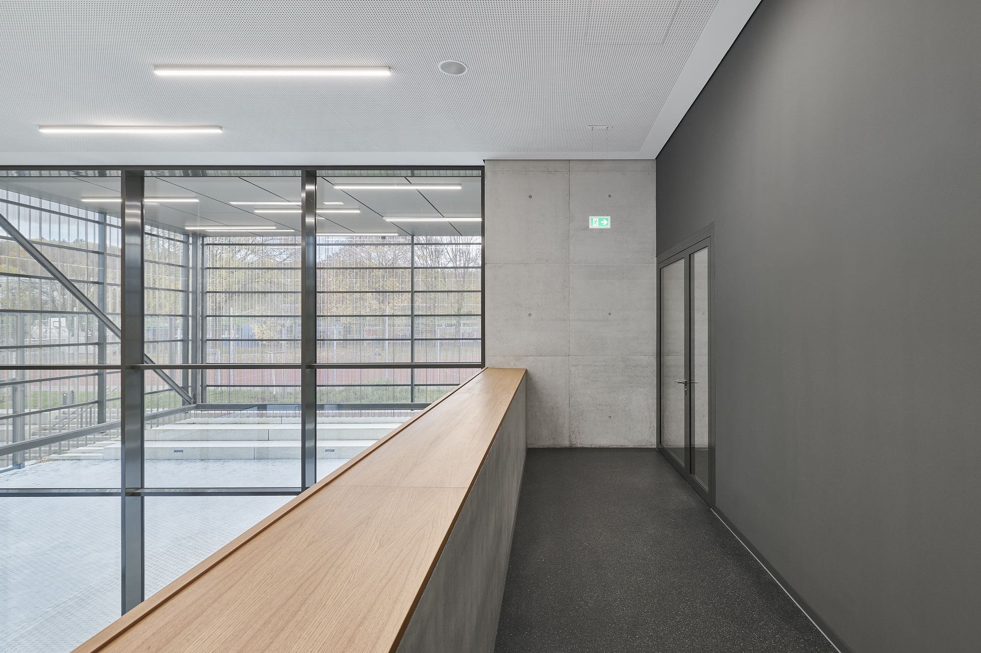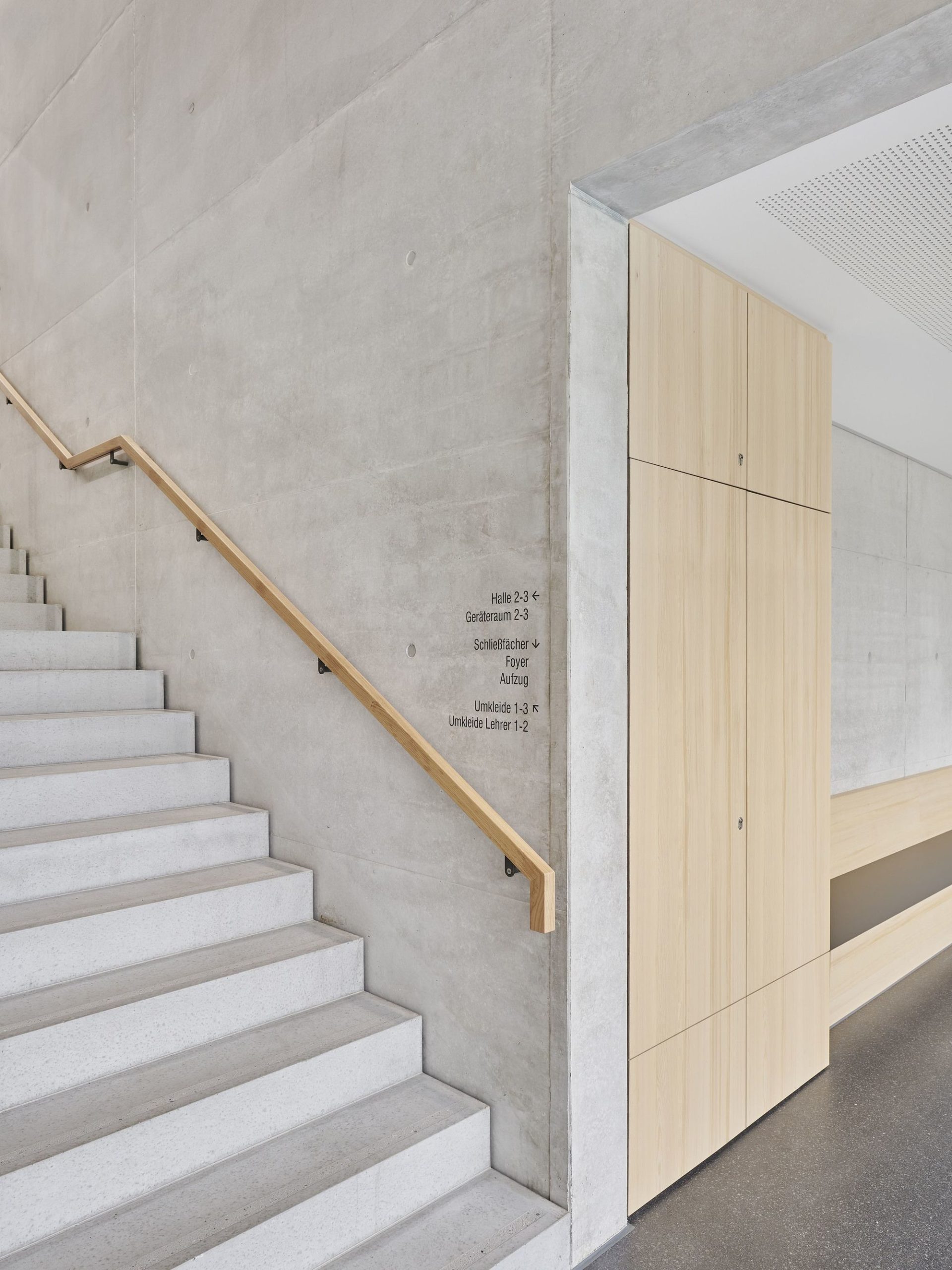 Interior and exterior correspondence. The main entrance of the new two-bay hall leads to the “Sportlerforum” (Athletes’ Forum), a forecourt designed as a meeting space. The enlarged parking lot, with its old (and new) tree population, is located to the west. A shady tree was integrated into a wooden resting island, and broad concrete seating steps allowed guests to rest and linger. The covered entrance area and the lobby, which extends all the way to the upper floor, lead to the gymnasium. The exposed concrete walls give the area a powerful and energetic feel. One side provides a direct view into the sports hall via a glass door. To the east, one enters the glazed hallway area on the other side.