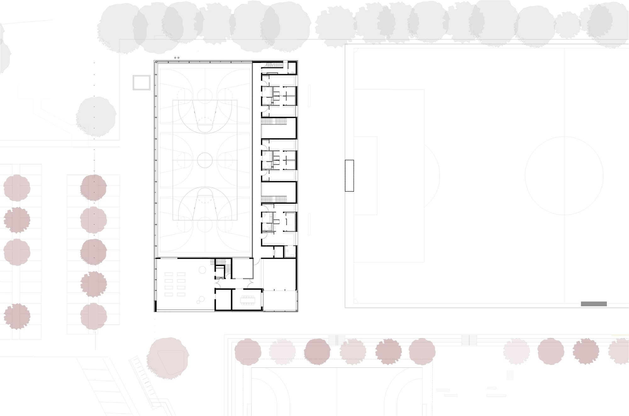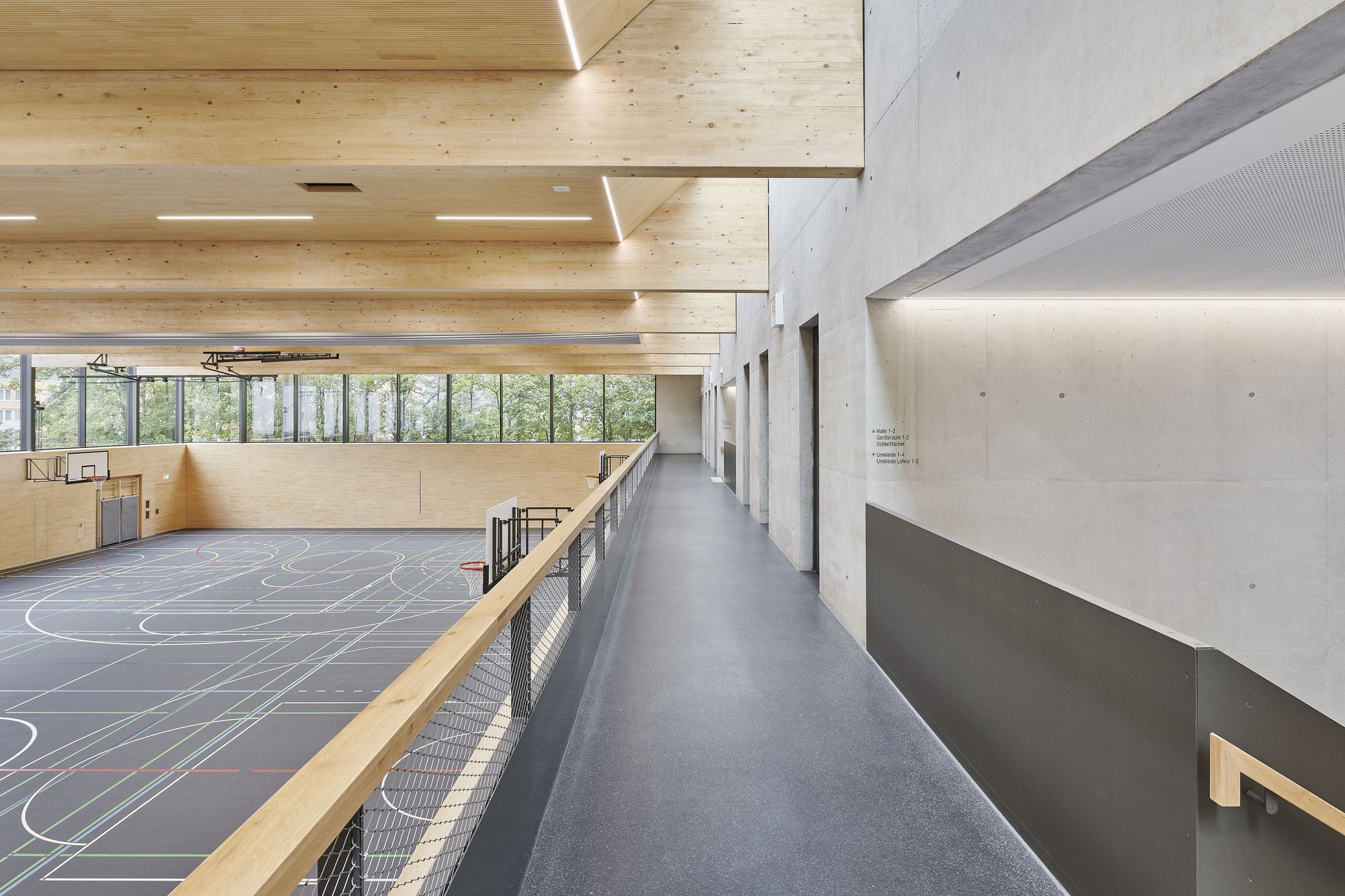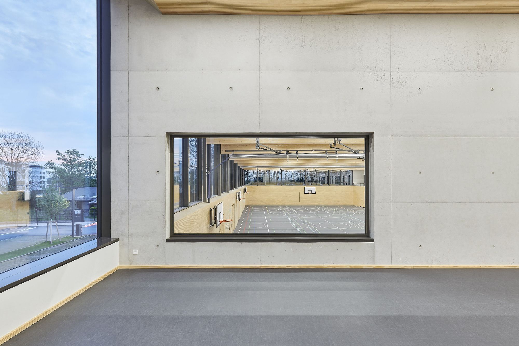 The changing tree tops generate a stunning dance of light and shadow in the interior, which is apparent even through the temperature- and wind-controlled awnings. Above the hall is a thin corridor with steel balustrades that can be utilized as a tiny grandstand even without benches. This is where the dynamically divisible changing rooms, as well as the dedicated spaces, such as the vast gymnastics area, are located. With its huge window spaces and additional glazing toward the gymnasium, it gives the impression of being in the heart of nature – of dancing among the trees.