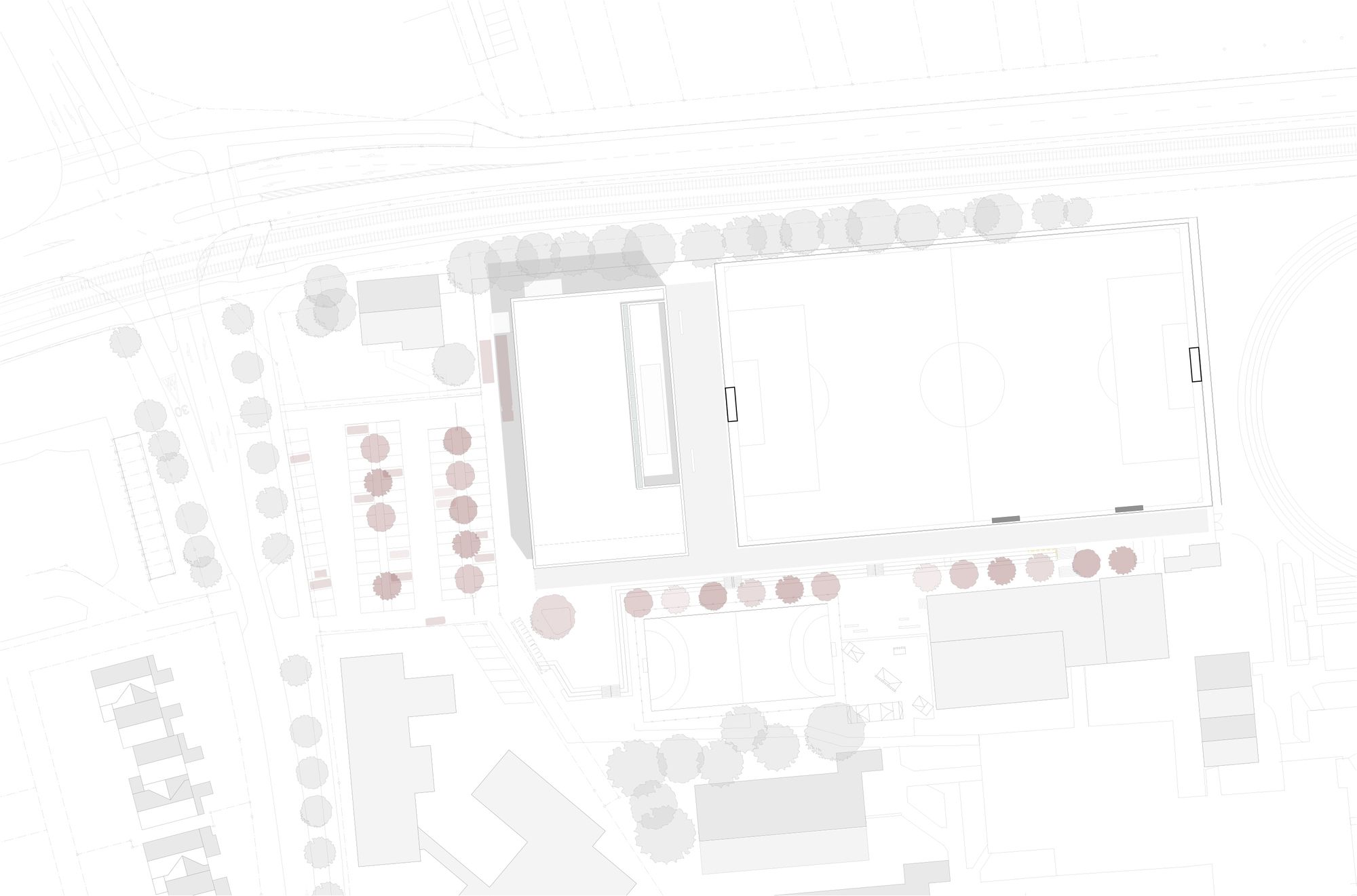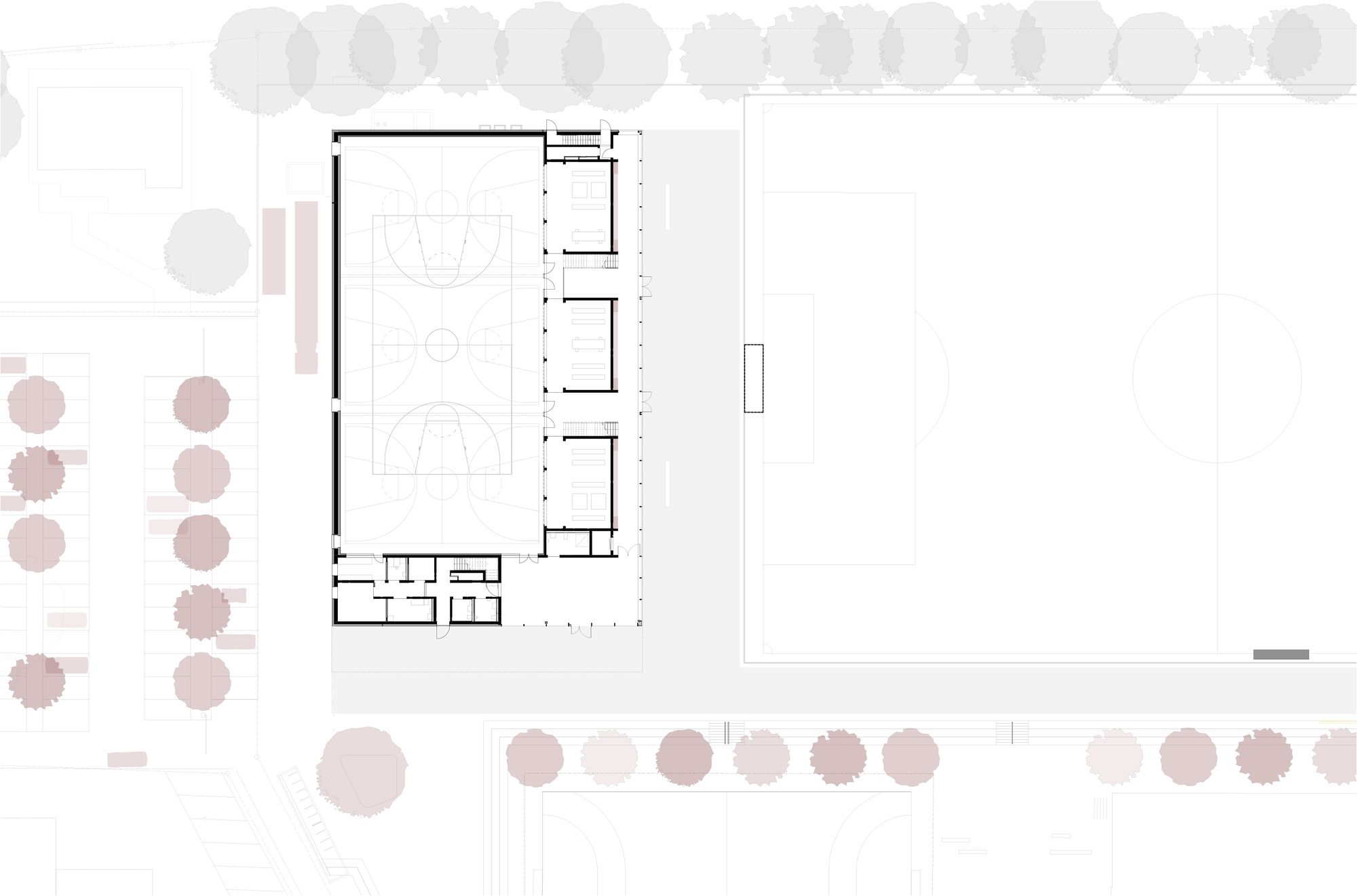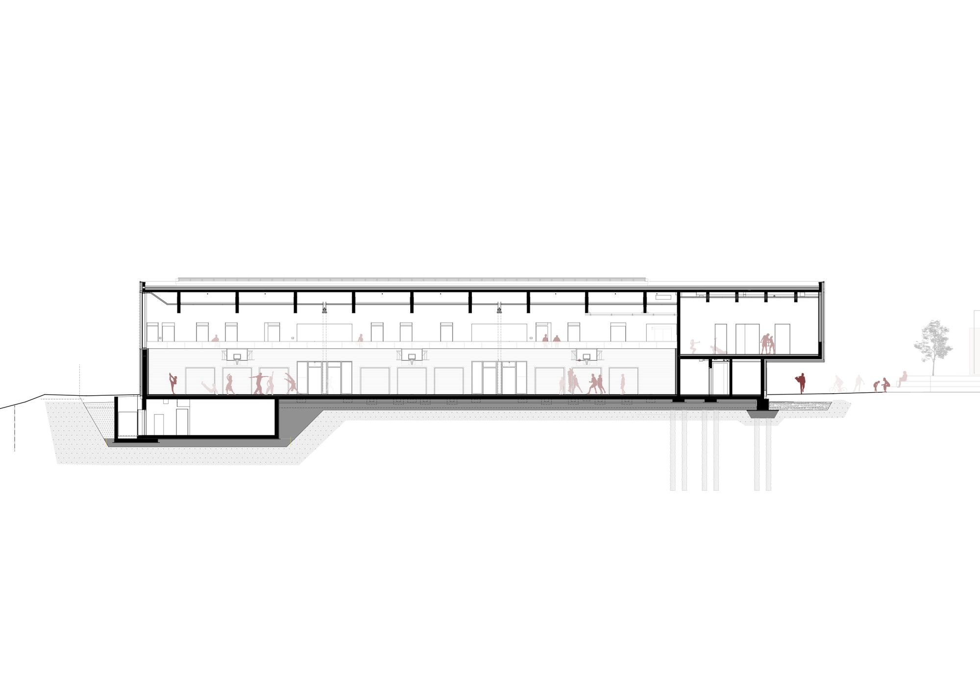 The changing tree tops generate a stunning dance of light and shadow in the interior, which is apparent even through the temperature- and wind-controlled awnings. Above the hall is a thin corridor with steel balustrades that can be utilized as a tiny grandstand even without benches. This is where the dynamically divisible changing rooms, as well as the dedicated spaces, such as the vast gymnastics area, are located. With its huge window spaces and additional glazing toward the gymnasium, it gives the impression of being in the heart of nature – of dancing among the trees.