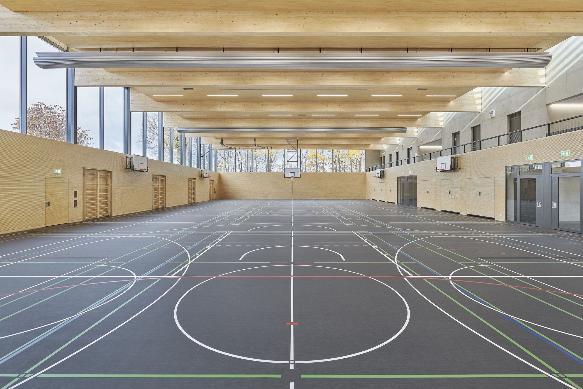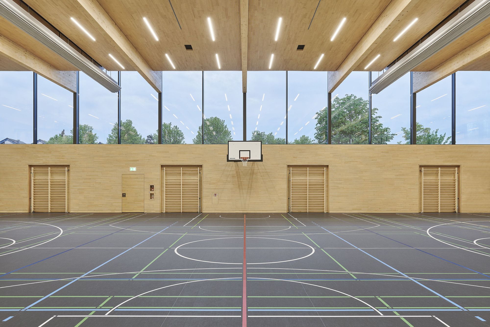 Light and shadow effects. From the corridor, two vestibules lead into the triple-dividable gymnasium. The visible, clearly organized glulam truss supporting structure, together with the suspended ceiling, integrated light strips, and, in particular, the wall cladding of slender spruce slats, produces a quiet room mood and acoustics. The wide glazing of the hall provides maximum brightness: The enormous window apertures that run like a ribbon from the west to the north side of the hall’s upper edge, as well as the east-facing skylights, connect the hall’s interior with its natural surroundings.