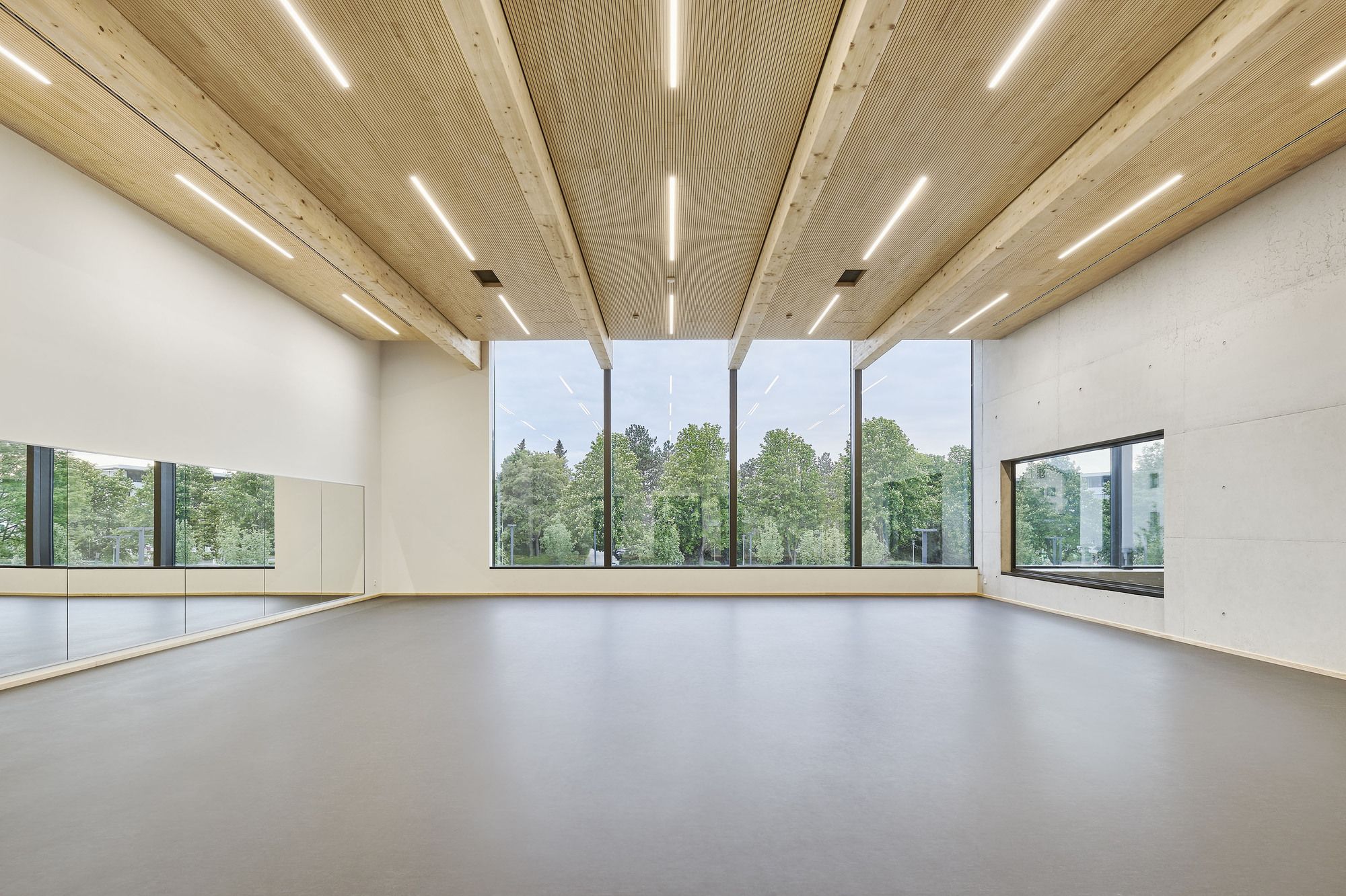The tree tops moving in the wind create an impressive play of light and shadow in the interior, which is even visible through the temperature- and wind-controlled awnings. Above the hall runs a narrow corridor with balustrades made of steel, which can be used as a small grandstand even without benches. This is where the flexibly divisible changing rooms are located, as well as further south, the dedicated rooms, such as the spacious gymnastics room. With its large window areas and additional glazing in the direction of the gymnasium, it conveys the feeling of being in the middle of nature – indeed, of dancing among the trees.