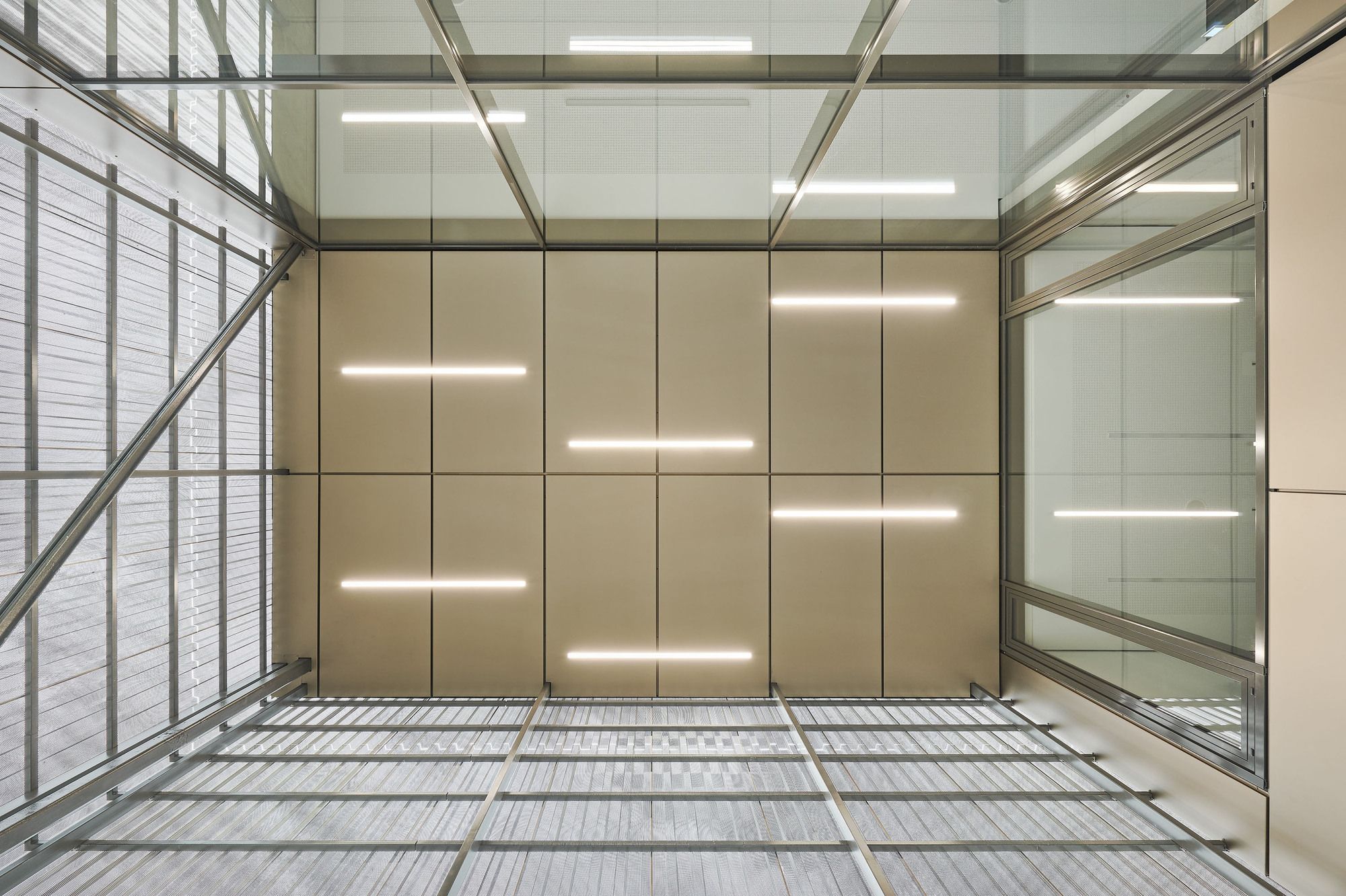 Efficiency and sustainability. The architects focused on sustainable building and lowering energy requirements during the planning phase: A central ventilation system with very efficient heat recovery was constructed, which is disguised in a lowered roof area and supplemented by photovoltaic modules, in addition to numerous thermal insulation measures. From the outside, neither is visible. As a result, the building’s cubic and plain design is not visually disrupted: The lamellar structure of the facade, which perfectly merges in with the natural surroundings, is visible from all sides.