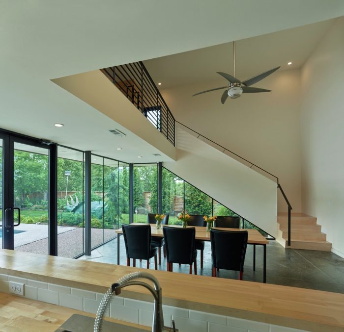 The lower level opens up onto the pool terrace, establishing a transparent base that allows visitors to flow freely from outside to inside. This transparency and the volume of the living room that extends up to the second level allows the building to feel larger than itself.