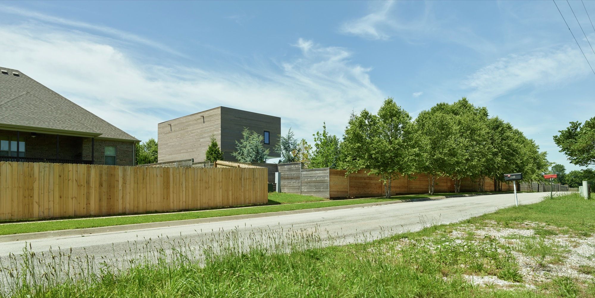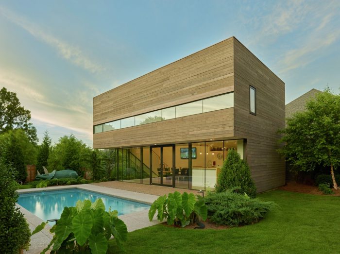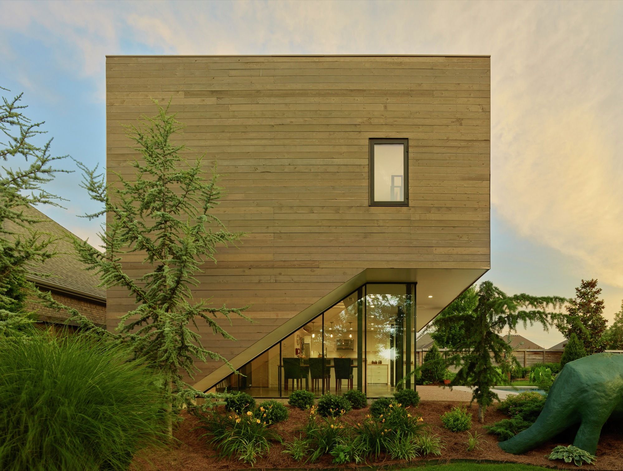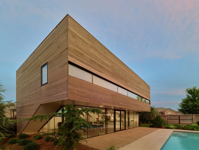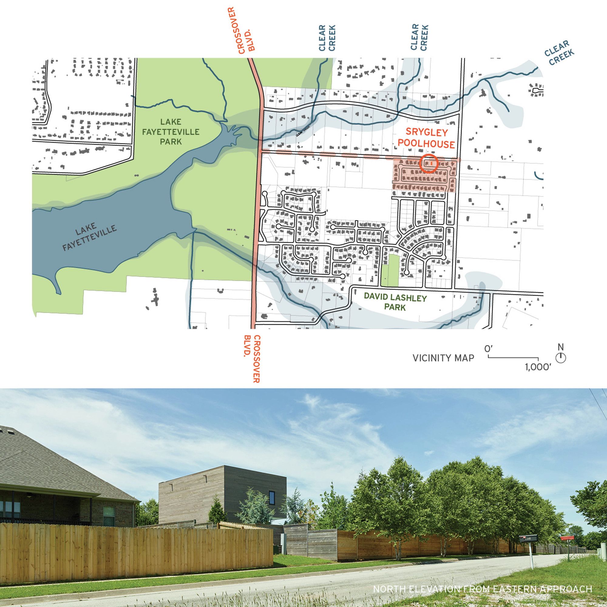 The Srygley Pool House is located within a suburban neighborhood that offers little variation from the typical single-family house model. The simple form of the building strikes a bold pose within this landscape. The pool house is wrapped in subdued cedar siding, allowing the seemingly foreign form to coexist with the surrounding brick and cedar residences.