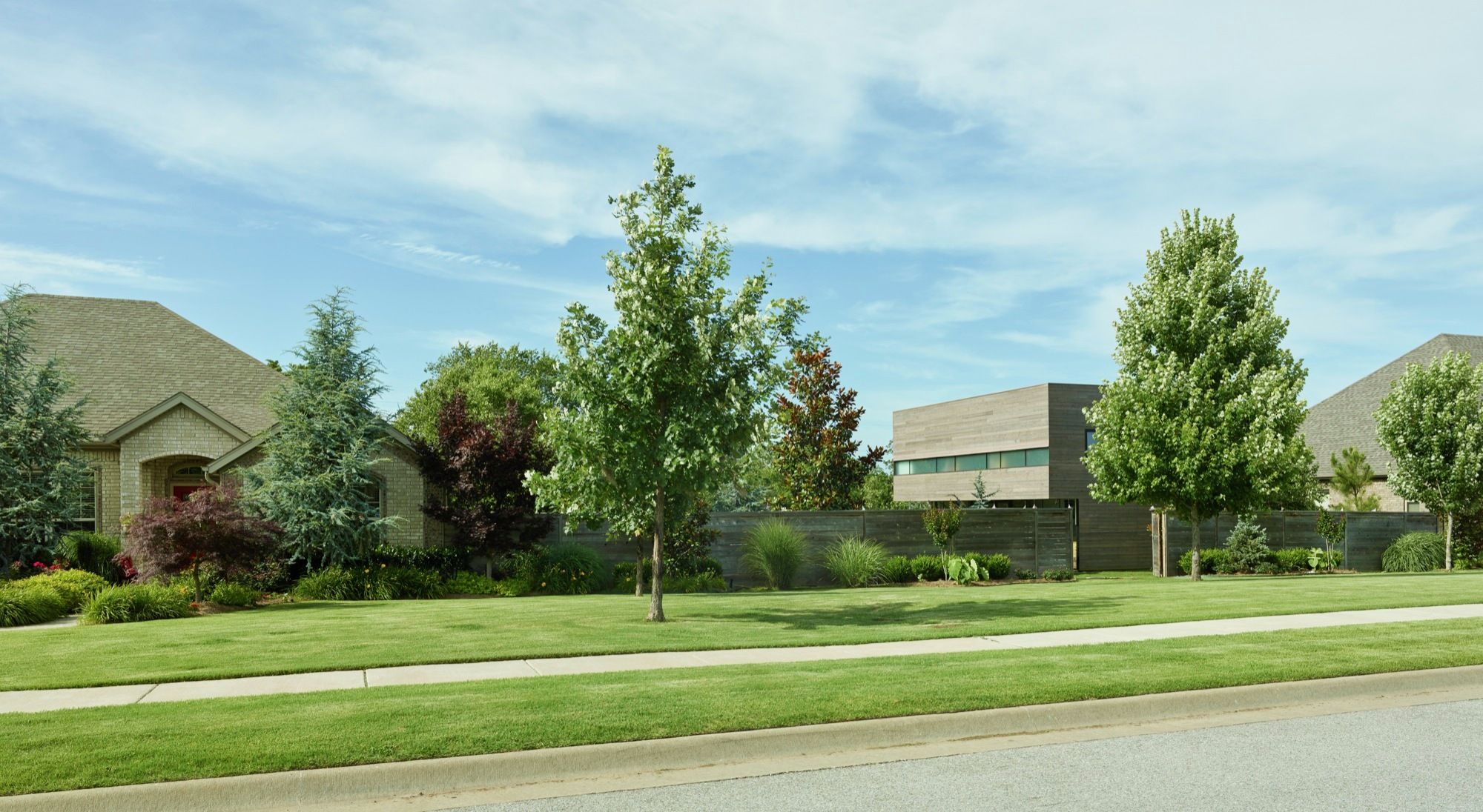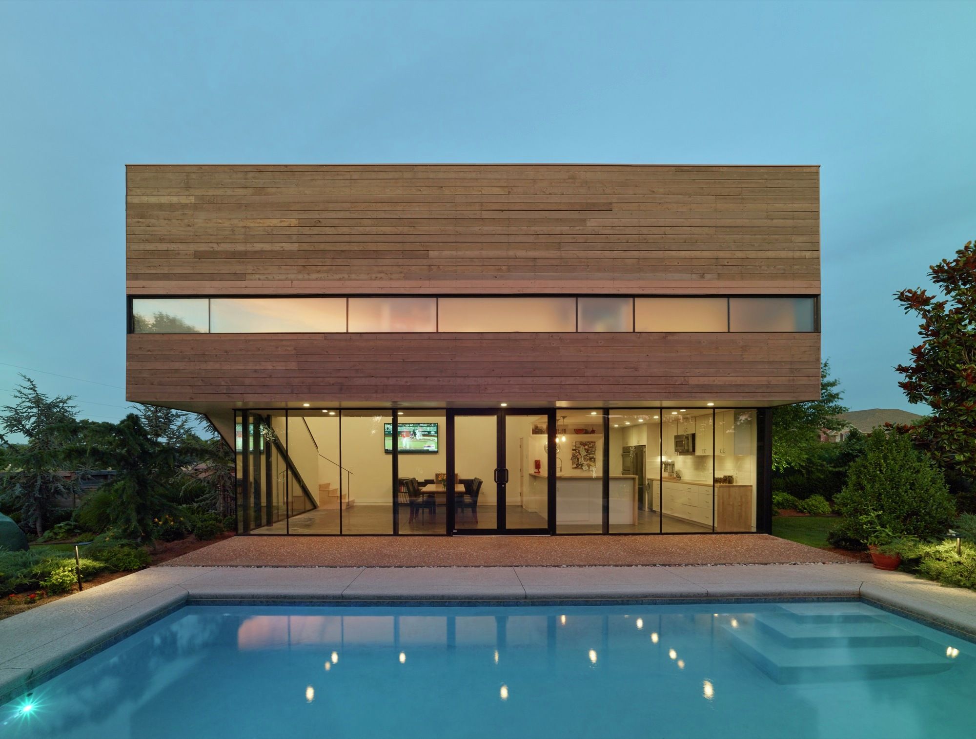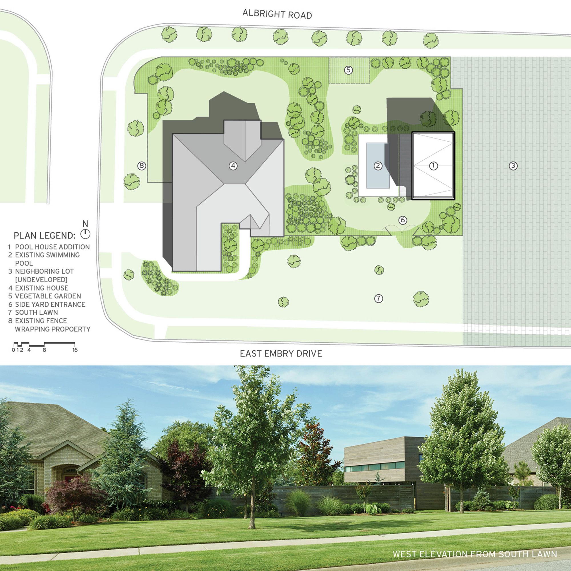 The Srygley Pool House is located within a suburban neighborhood that offers little variation from the typical single-family house model. The simple form of the building strikes a bold pose within this landscape. The pool house is wrapped in subdued cedar siding, allowing the seemingly foreign form to coexist with the surrounding brick and cedar residences.