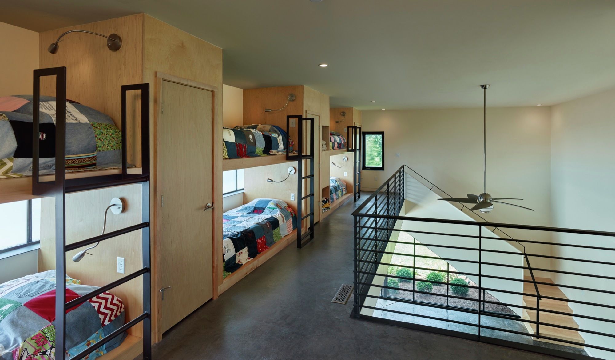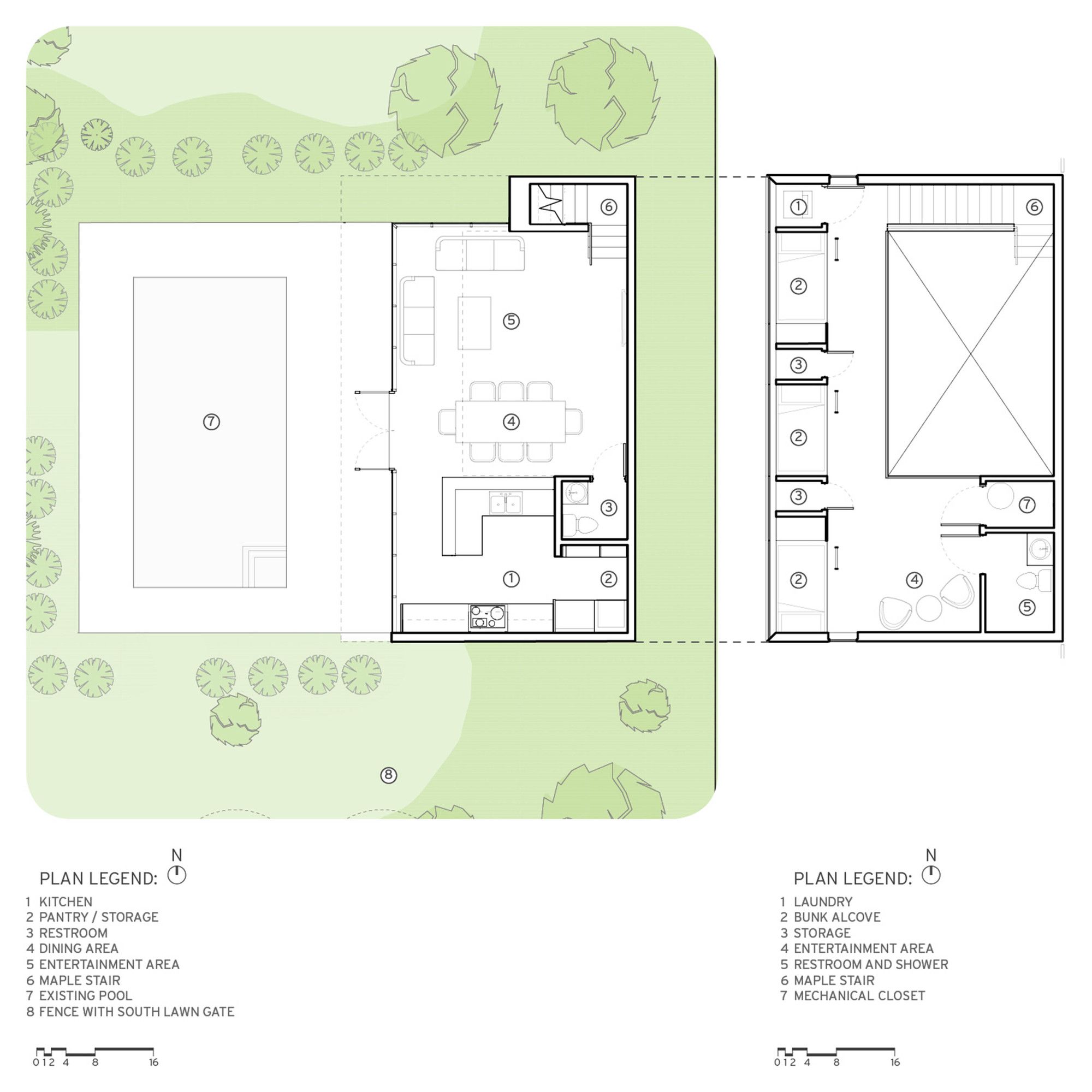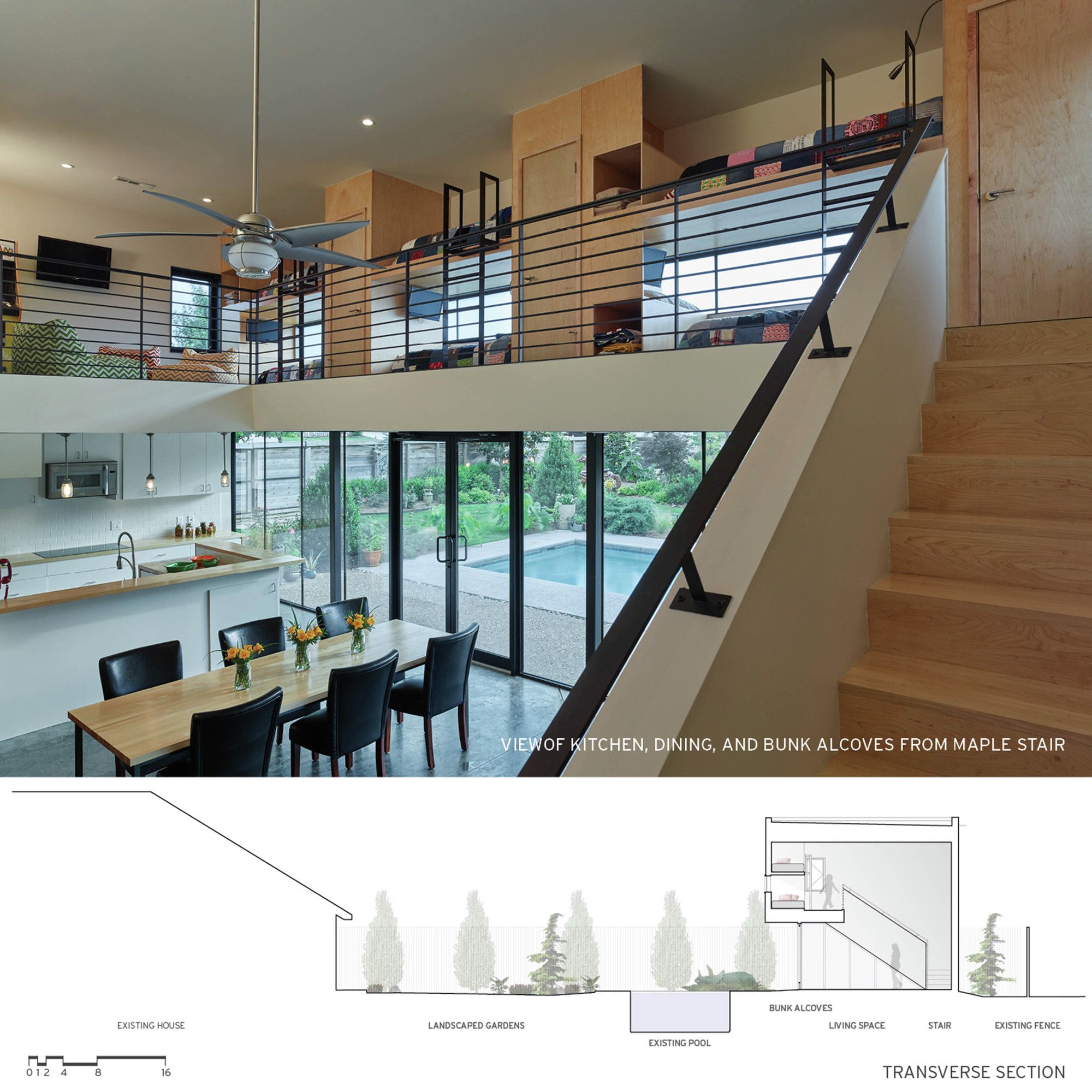 Along the pool-side of the second level, stacked bunk alcoves provide space for six guest, extending the use of the modest structure from pool house to bunk house. The bunks are illuminated by a horizontal band of light. Cubbies and closets are carefully integrated into the bunks recalling the interior of a ship’s cabin with a continuous wall of storage and sleeping quarters.