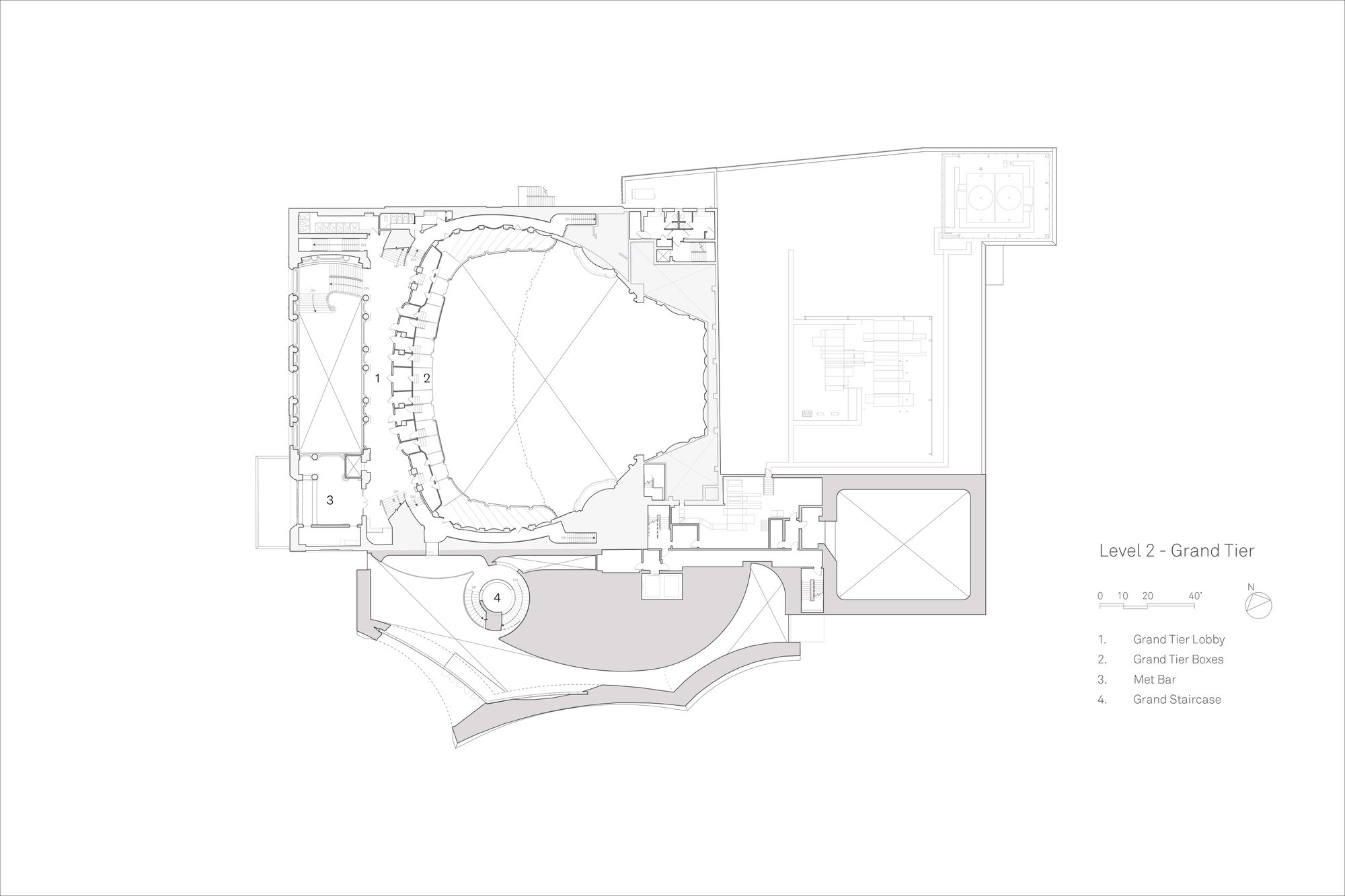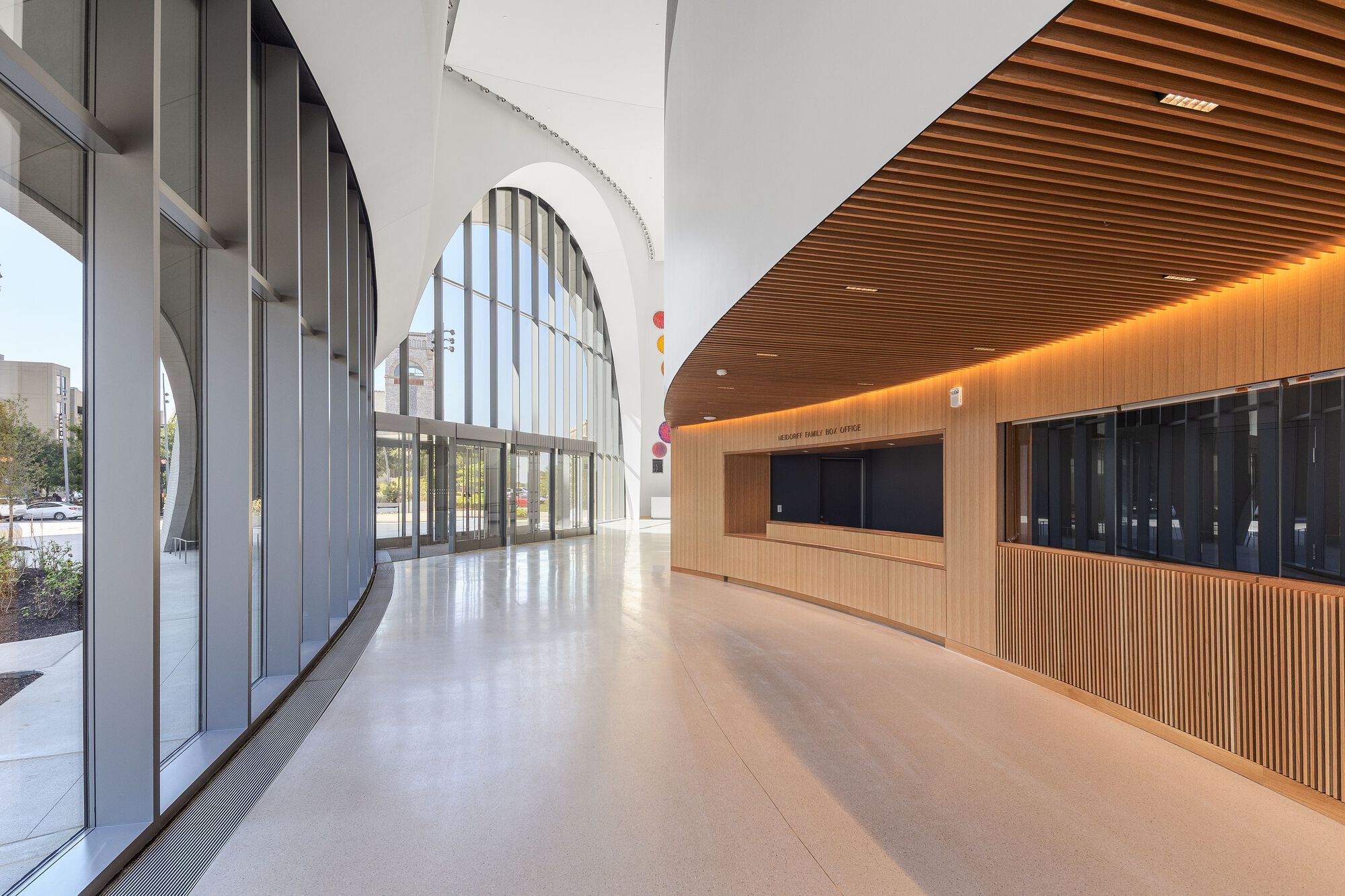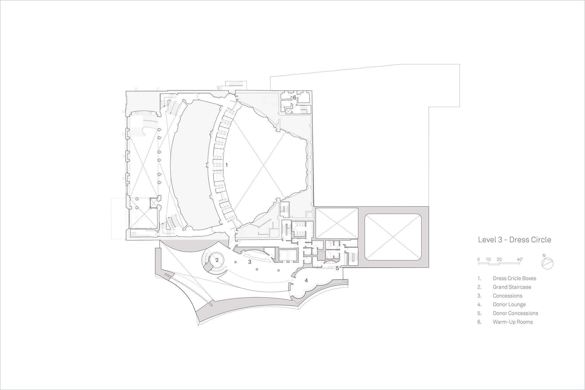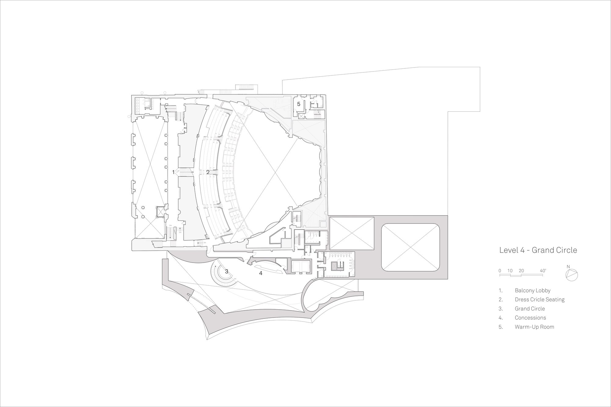 Drawing on the spatial language of historic concert halls and the instruments within, the entry is shaped as a series of canted shells assembled from raked masonry, creating a front-of-house addition defined by simple inclined surfaces and arched openings. The arched urban windows offer a sense of joy and creative energy within, giving a glimpse of what lies inside even before entry. Inside, a suite of gathering areas situated within a triple-height space include terraces that overlook one another, allowing visitors to both see and be seen while attending performances.