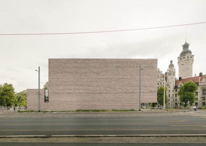 The church hall is situated crosswise and creates sufficient room for the arrangement of the community in an open surrounding area whose optical and scenographic center is the chancel. Partitions separating the community were eliminated, additionally opening the chancel as a multidimensional space usable for various forms of liturgy. Merely a gentle slope surrounds the chancel and permitting optimal visual perspectives. Across from the large cross on the rear wall of the altar (by artists Jorge Pardo) is a second cross carved into the large wall area above the gallery as a negative imprint that opens the church hall to the light of the setting sun in the west. The gallery offers room for the organ, the choir, and additional pews to be set up here. Facade made of Rochlitz porphyry. By using Rochlitz porphyry is continuing a tradition of construction of the city of Leipzig, such as with the Old Town Hall, and of the region, such as with the Benedictine Priory of the Holy Cross in Wechselburg. The horizontal layering of the various heights firmly anchors the building with the plot of land and allows it to symbolically grow out of the ground. The projections and recesses in the layering convey the rich