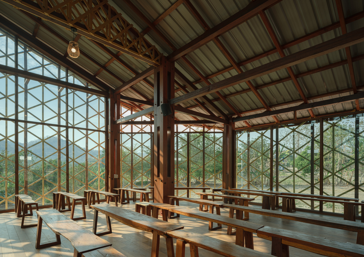 The St Xavier’s Oratory’s architecture draws inspiration from ethnic Karen textile patterns, while its outward form seamlessly merges with the spatial arrangement guided by the rituals of the Catholic liturgy. The structural grid, conceived as an interwoven square of fibers, ascends towards the Umphang River, symbolizing the path to Communion along the central axis.