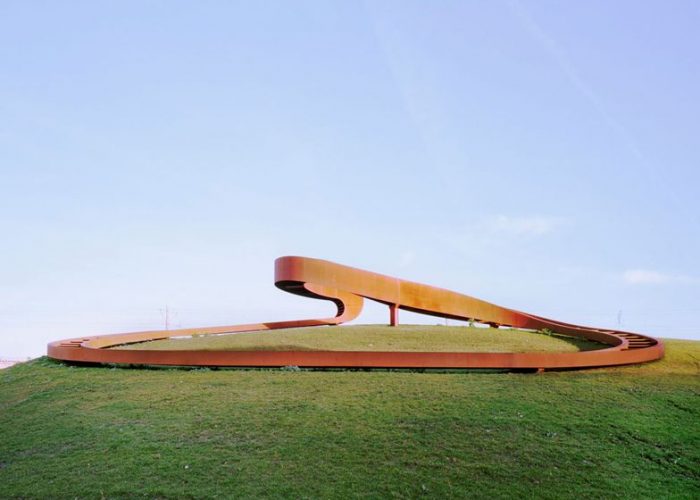 Is an outdoor geometrical form of staircase and walkway, made of corten steel.