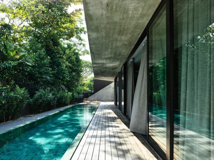 Together with the client’s brief, the planning of the house was conceived utilising the site’s natural topography and mature trees at the back of the site. As such, it is apparent that the living spaces in the house turn away from the front where the view is that of neighbouring houses, a common consequence of landed housing estates such as this. Instead, it faces the back of the house where the greenery provides a private, green sanctuary. The site topography was taken advantage of to create a basement nook that opens out to the green. Combined with the outdoor swimming pool, the basement nook – hardly perceived as a basement – becomes the focal point of family activities and outdoor entertainment.