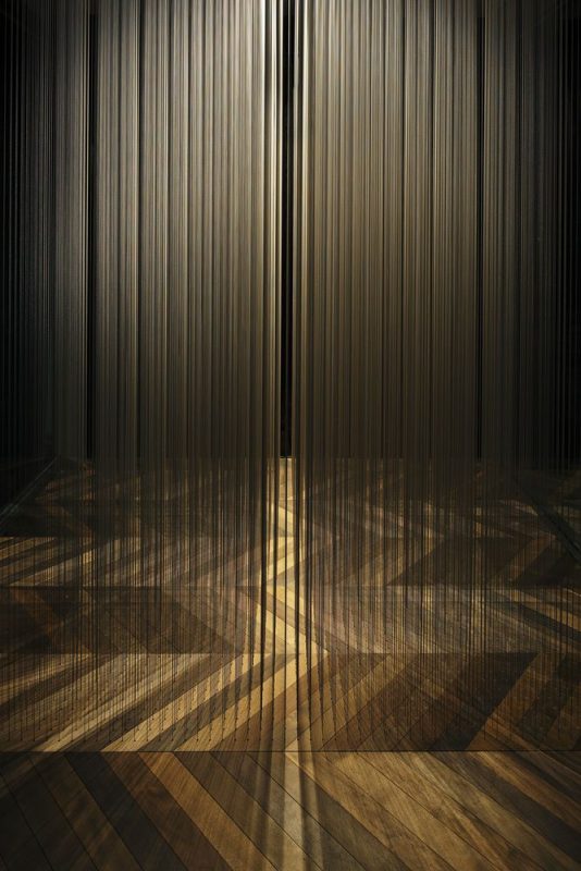We have stretched about 12,000 stainless wires, which is the same numbers of wires as are in Steinway pianos, around the façade. Pianos receive 20-ton string tensions, which create the echo. In the same way that the piano wires receive tension, which cannot be seen with the human eye, the stainless wires on the facade bring the space both tranquility and a tense atmosphere. Also, to liven up the clients’ mood to purchase a piano, when they walk in front of the string screen, it almost feels like the screens are trembling and making music.