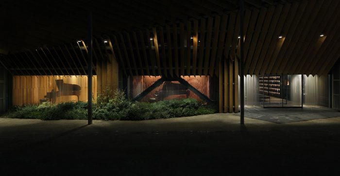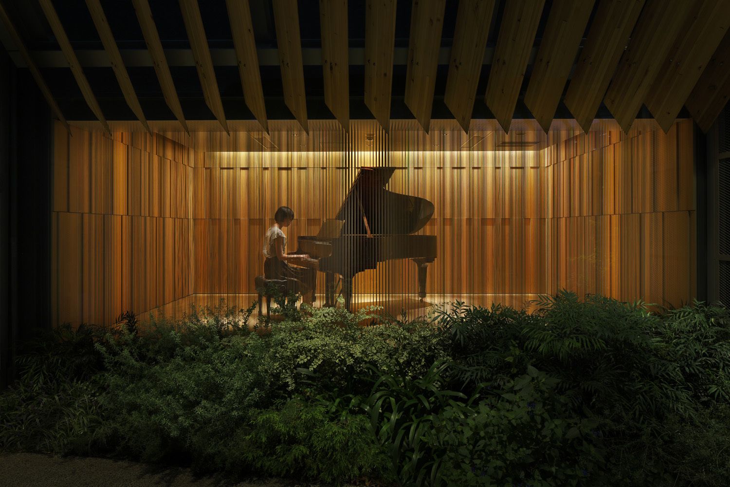 The continuous ribs are in the shape of a piano, and at the same time, they remind you of the drop curtain of concert halls.